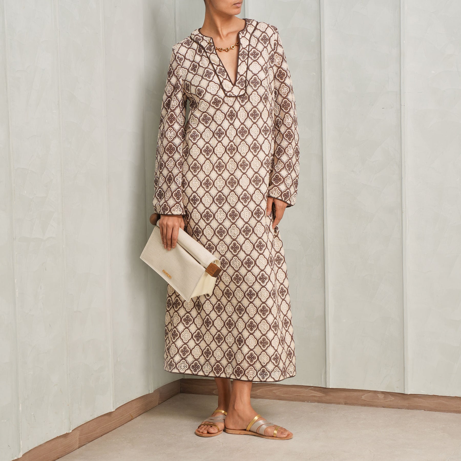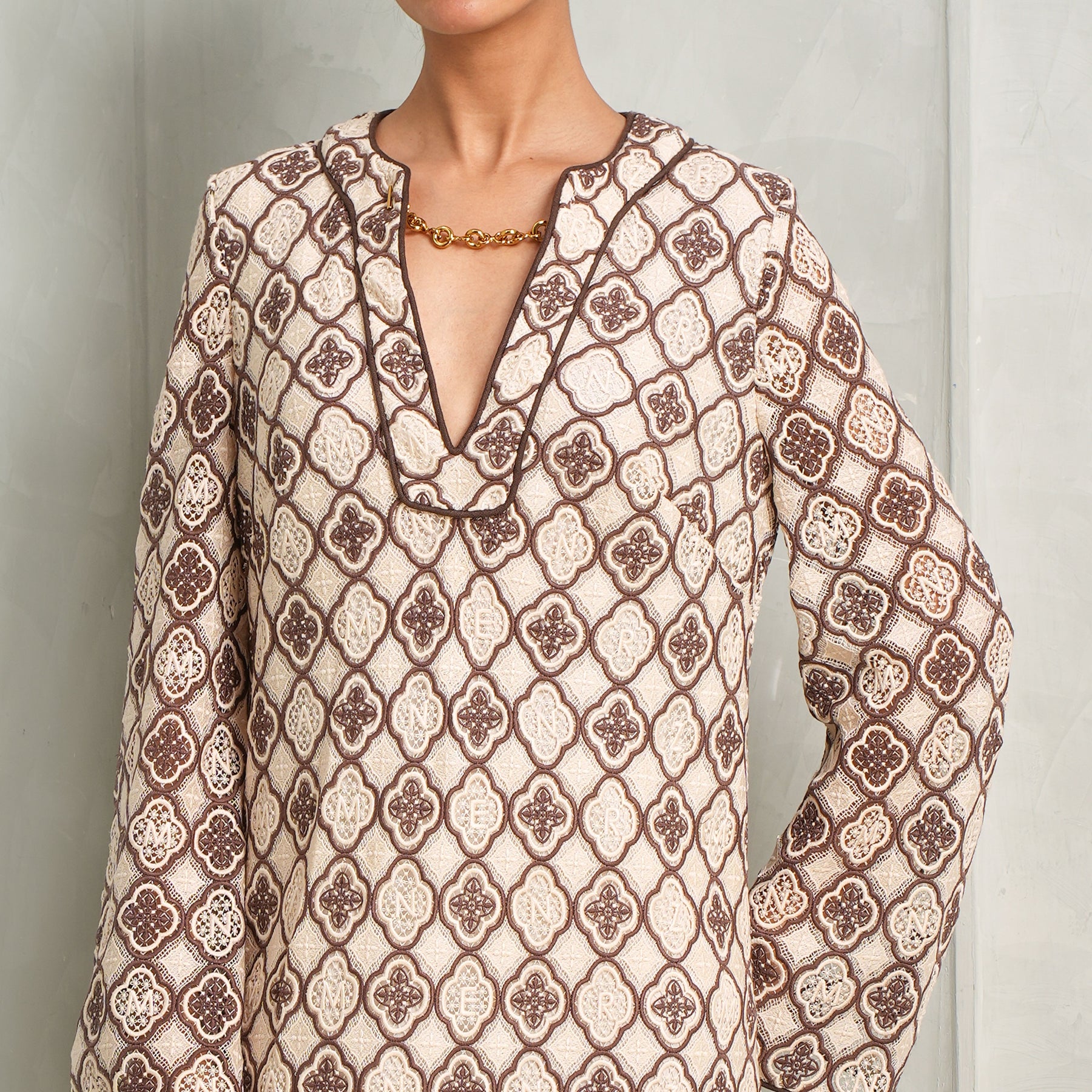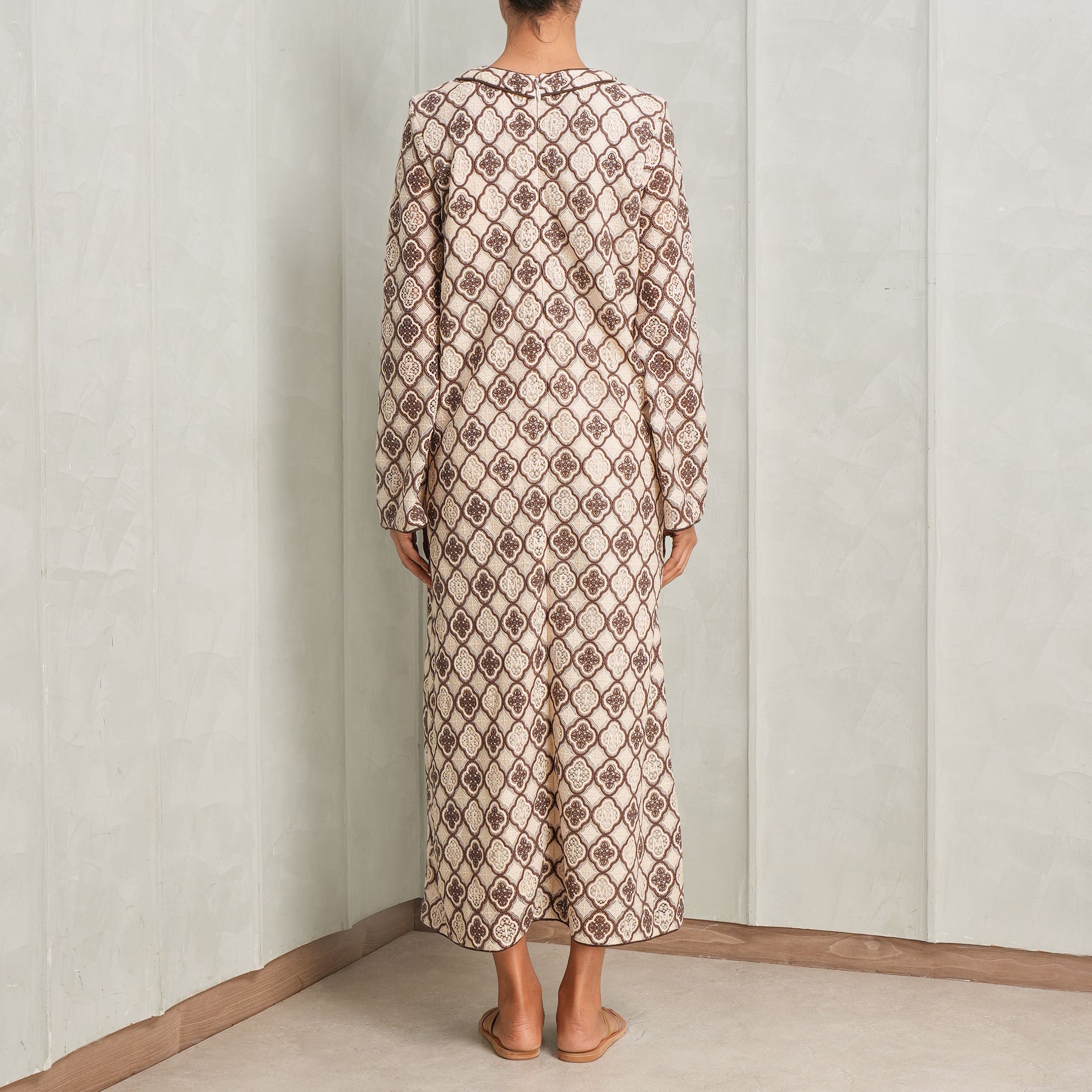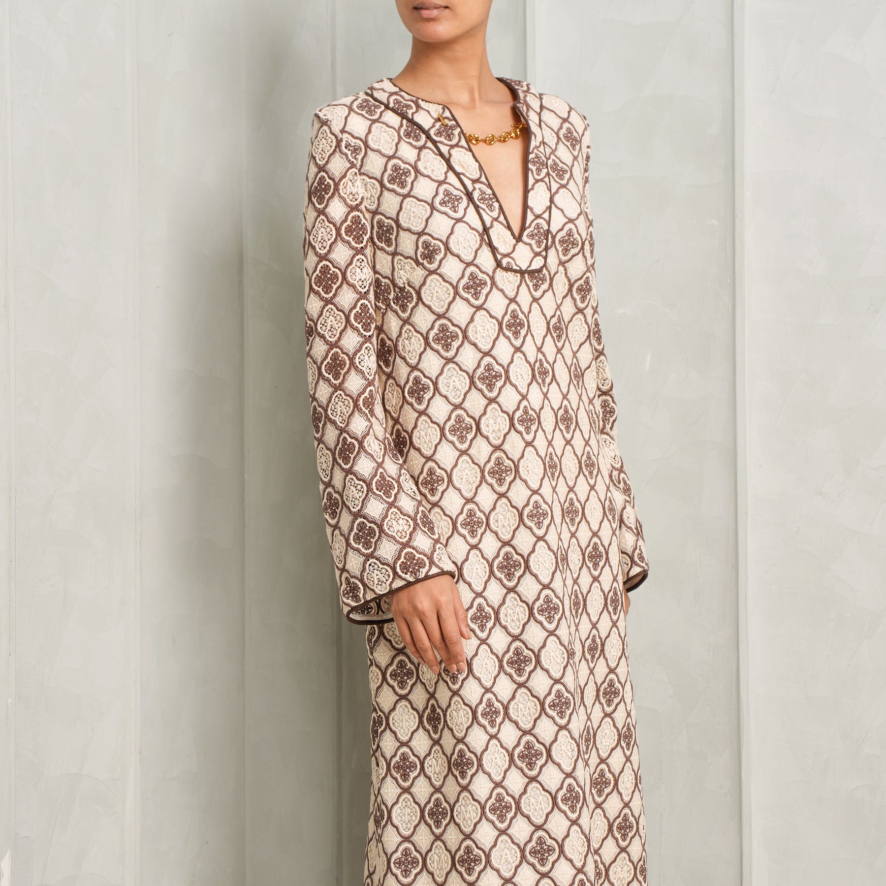 The Luna Guipure Midi Dress from Zimmermann is a relaxed midi dress designed with an easy, fluid silhouette that moves effortlessly with the body. The cream and navy geometric print brings a sense of structure to the softness of the fabric, while the subtle neckline detailing and full-length sleeves add quiet definition. The shape is intentionally loose yet considered, offering comfort without feeling oversized. It’s the kind of piece that feels instinctive to wear - polished enough for daytime outings, yet relaxed enough for slower moments. Understated, breathable, and quietly distinctive. Style this with...