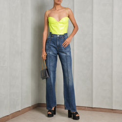 The Olsen Oversized Shirt by Alex Perry is cut from a printed stretch jersey fabric in a neon yellow hue. This shirt is crafted with Alex Perry 's signature fluid edge. It features a collared neck, oversized fit, chest flap pockets, long sleeves and cuffs. For a chic off-duty look, pair this shirt with Alex Perry's Hayes Boxer Shorts and Saint Laurent's Vesper Tweed Slingbacks.