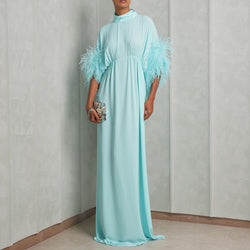 The Neva Ruched Long Dress by Nervi is cut from a blue hued fabric. This long dress is a flamboyant addition to your cocktail wardrobe. It features a feather-trimmed detail, corseted structure, sweetheart neckline, ruched structure and a slit at the front.