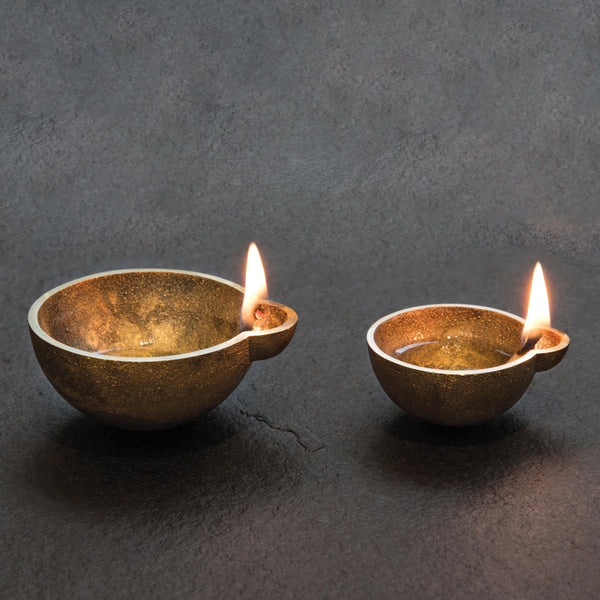 Traditional cast-brass oil or butter lamps with a contemporary expression.