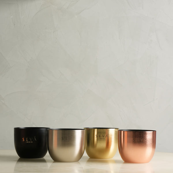 With rich fragrant oils and a creamy texture, the Heirloom Candles from Seva India are crafted from pure soy wax and cotton wicks. This set of 4 candles consists of black, gold, silver and bronze colors.