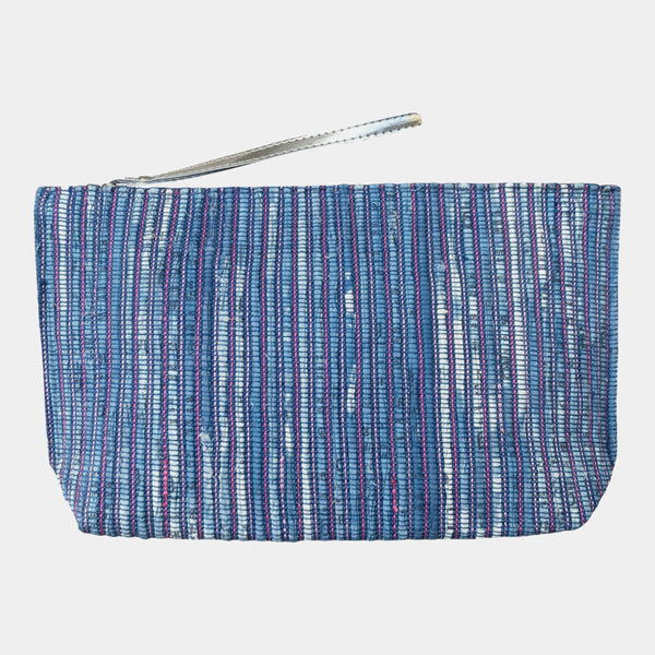 This upcycled clutch from Joli is made from upcycled cotton fabrics which have been dyed with natural indigo. The interior is lined with a black fabric. This Joli clutch also features a silver patent wrist strap for easy carry.
