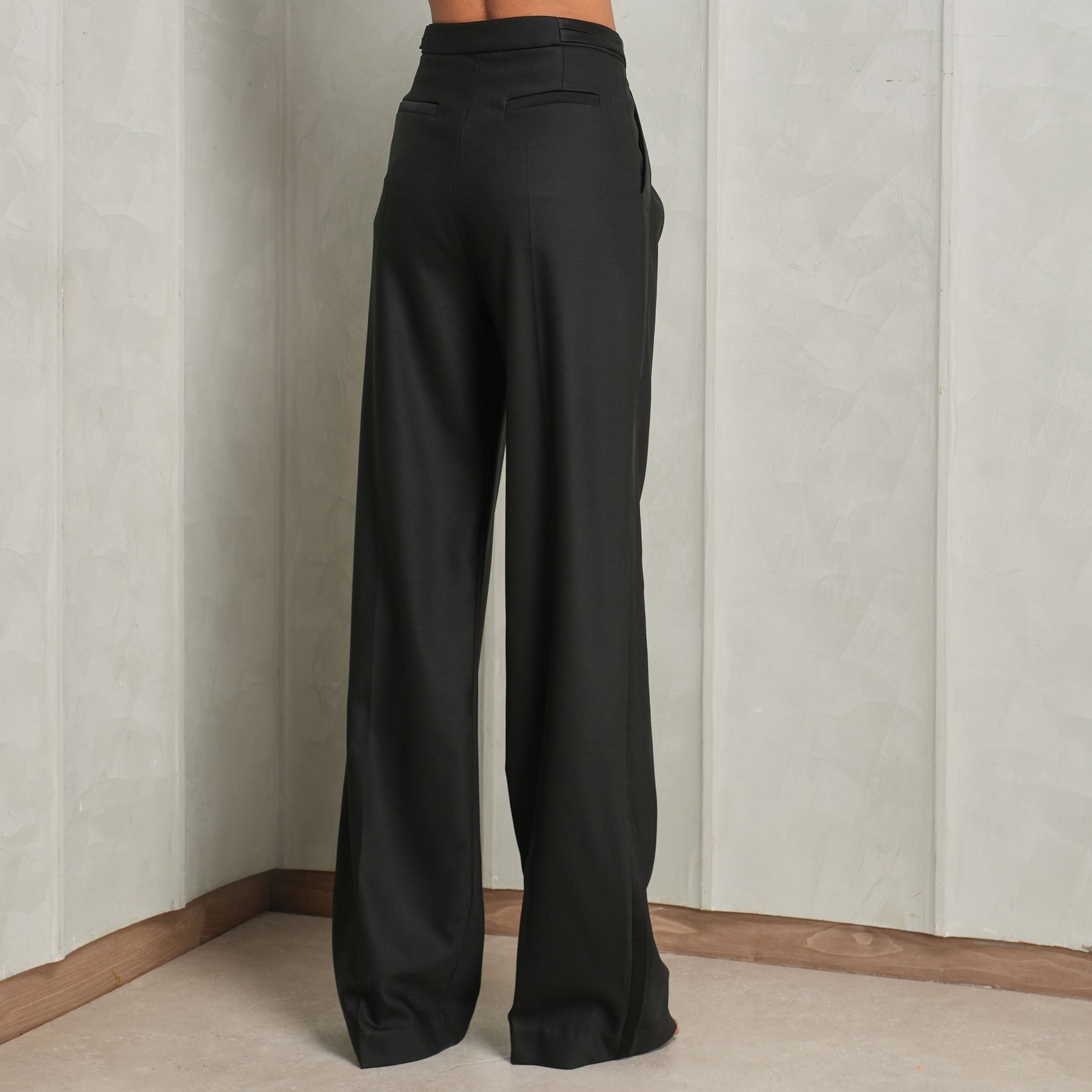 The David Koma Adjustable Waist Tuxedo Trousers are tailored in black wool with classic tuxedo styling. Satin trims run cleanly down the sides, while an adjustable waist detail adds both structure and versatility. Finished with side and rear pockets, the trousers fasten at the front with a zip and hook-and-bar closure. Style this with...