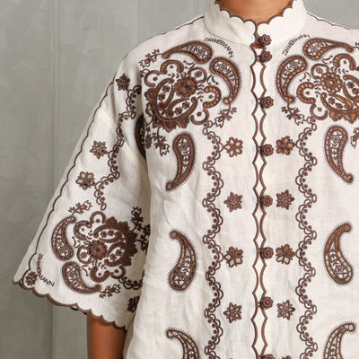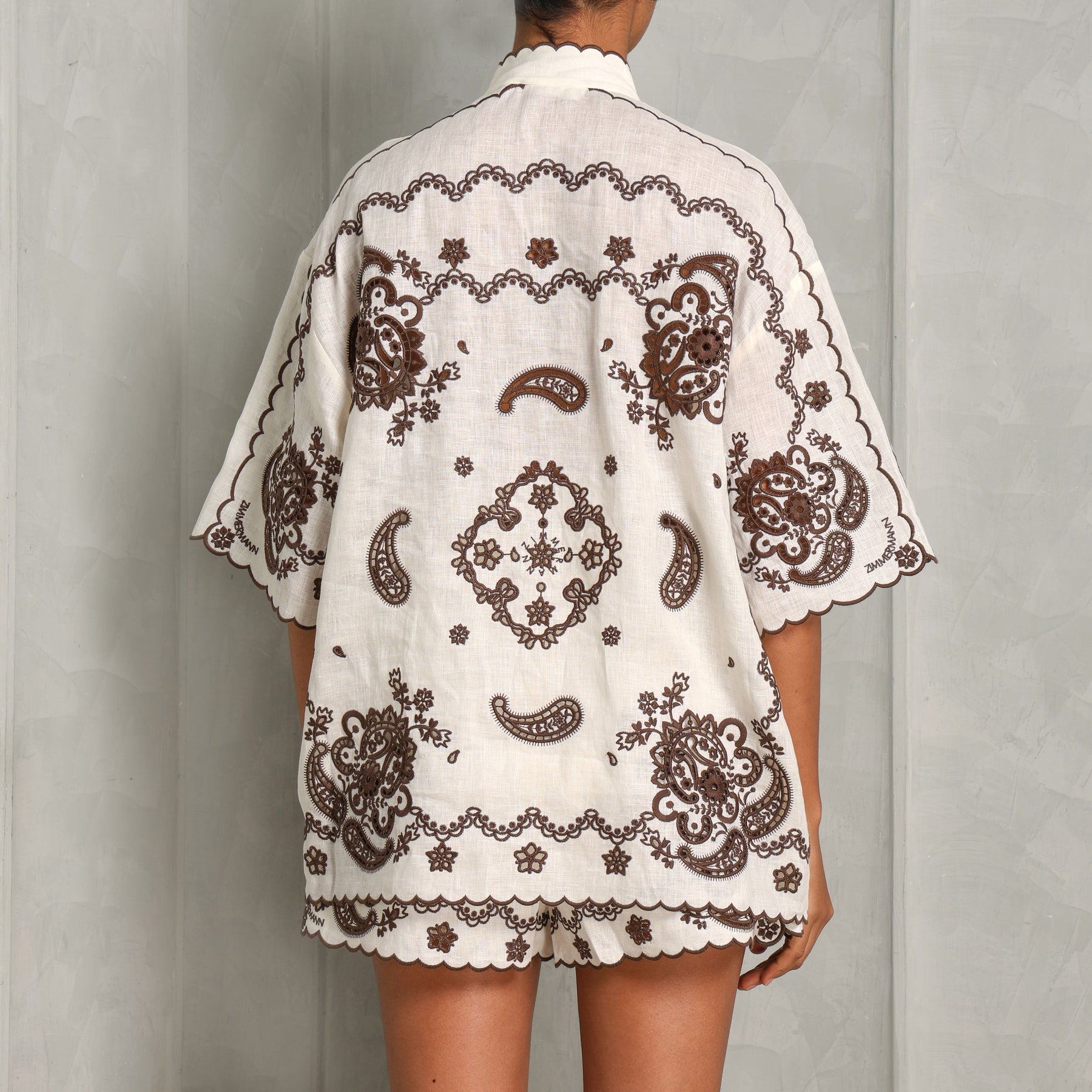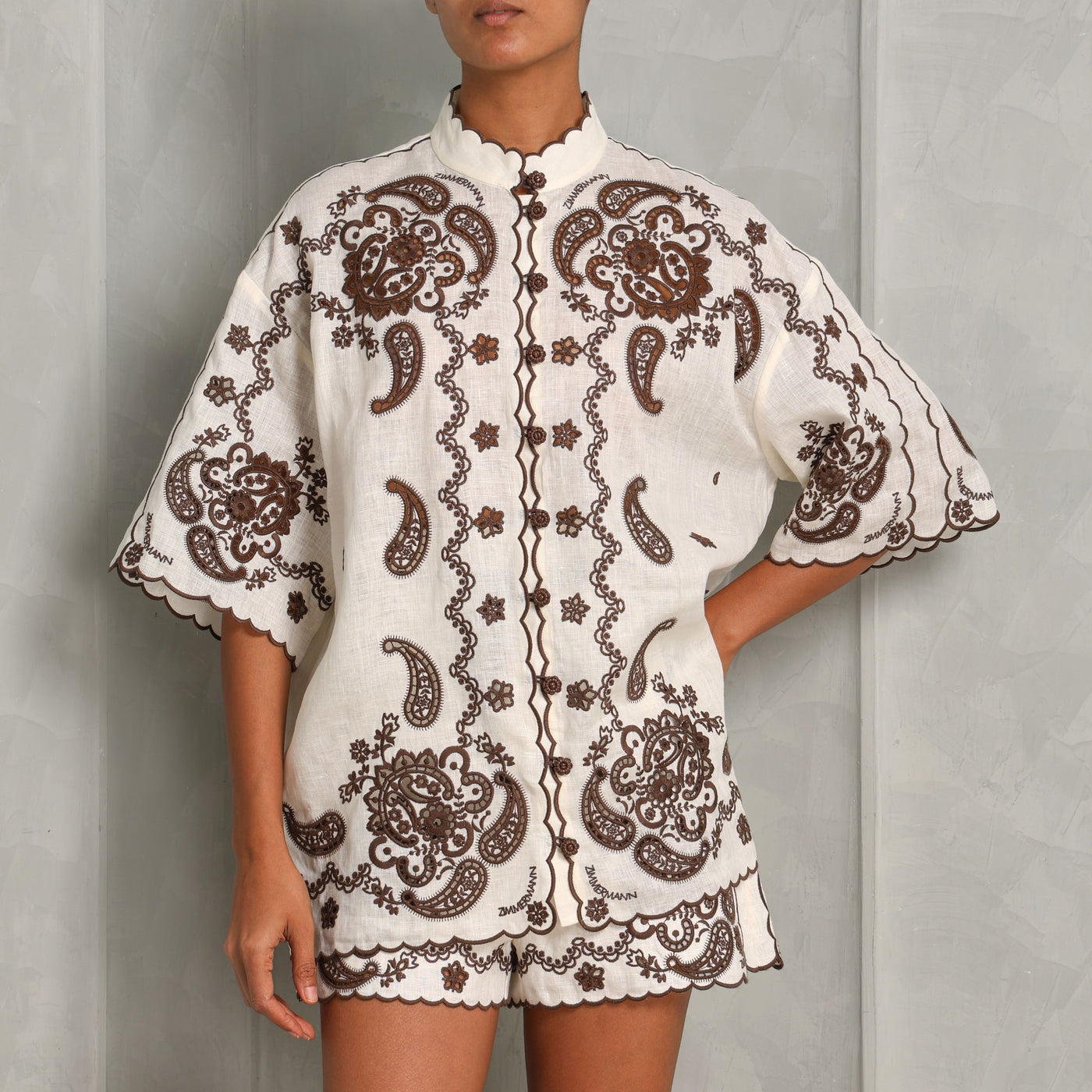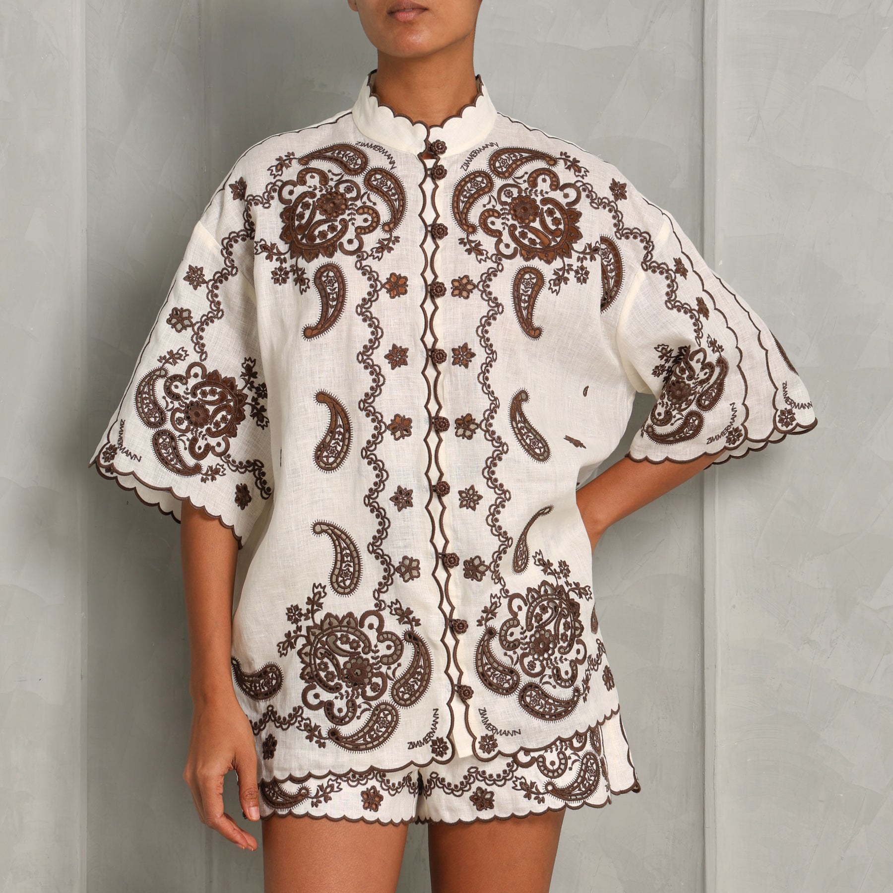 The Ascension Embroidered Shirt from Zimmermann is crafted in linen and features a quarter-sleeve silhouette with delicate embroidery. This piece boasts a soft stand collar framed with scalloped edging. The center front is finished with artisanal flower crochet buttons, adding depth and meaning to its relaxed design. Complete your look with the Ascension Embroidered Short.
