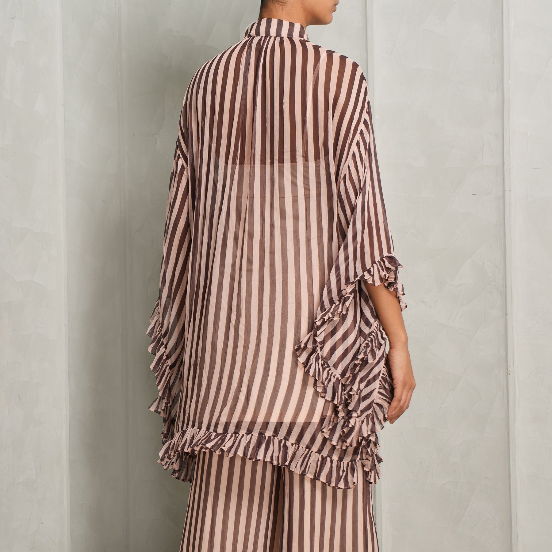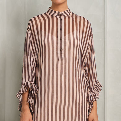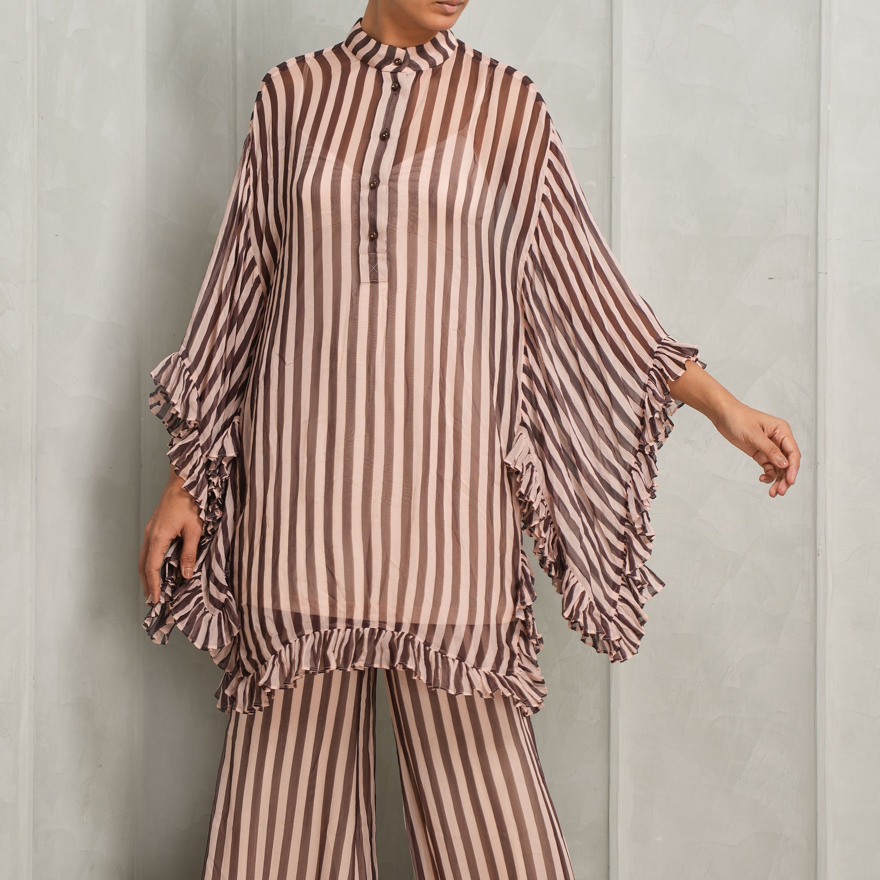 Meet the Balance Ruffle Tunic from Zimmermann - where rustic hues meet contemporary edge. This tunic top boasts a stand collar with buttons. This top features a front placket, wide sleeves and intricate frill detail on the cuffs and hemline. This piece comes with a separate slip, making it versatile and practical. For a full look, pair this tunic with Balance Ruffle Flare Pant from Zimmermann and Flamenco Bucket Purse from Loewe.