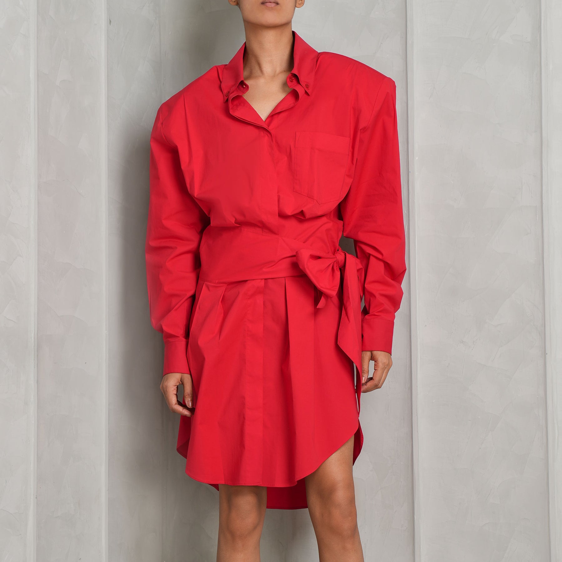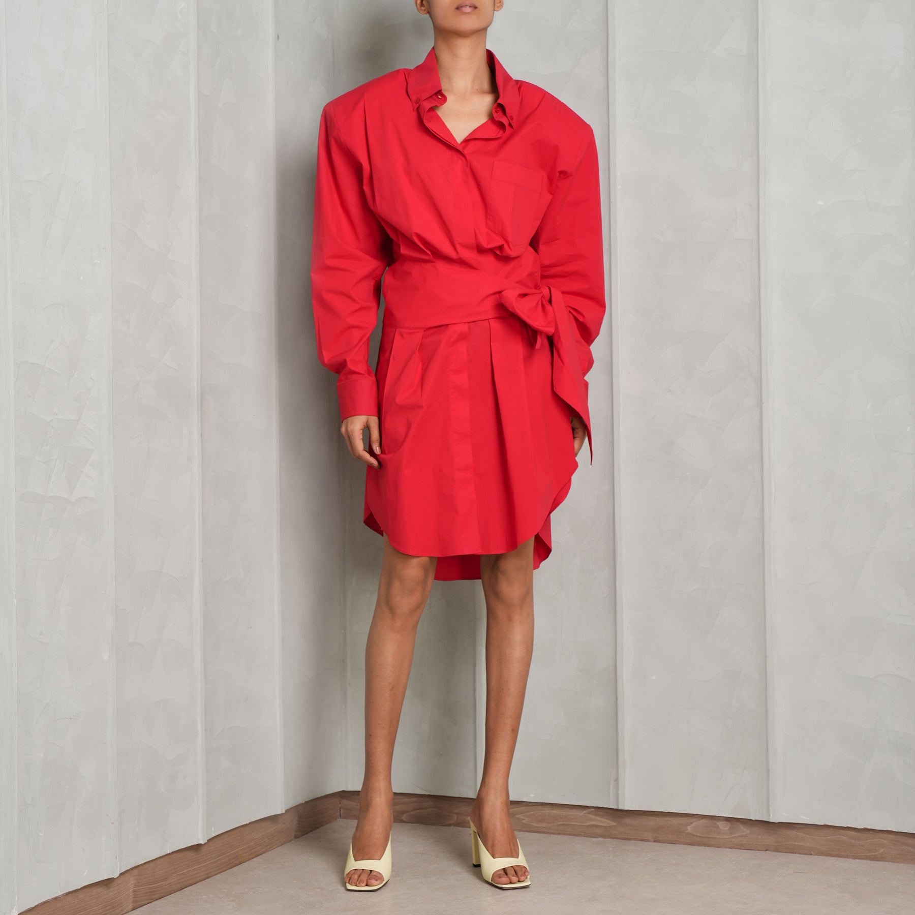 Crafted from a red-hued cotton blend, Alexandre Vauthier's Belted Shirt Dress features a relaxed fit complimented by a collared neck, oversized sleeves with cuffs, a front chest pocket, and a belted waist with a tie-up detail leading to minimal box pleats. For a relaxed brunch, pair this dress with your favorite heels.