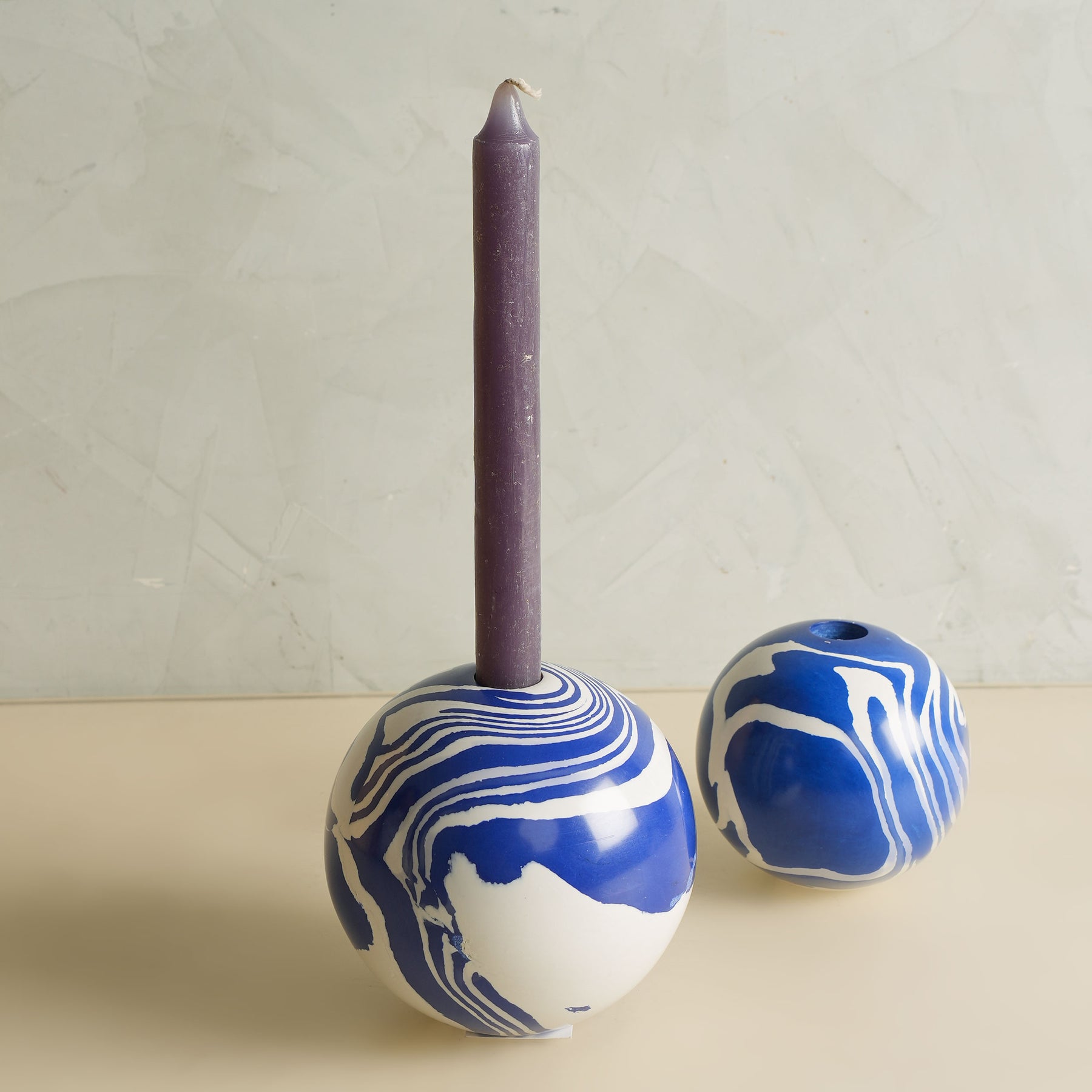 The Blue & White Single Ball Candle Stand from Eeshaan is built on a rounded sphere with a crisp blue-and-white finish that adds a clear, graphic touch. Its compact size works well on small surfaces or paired with other stands for a simple, layered setup.