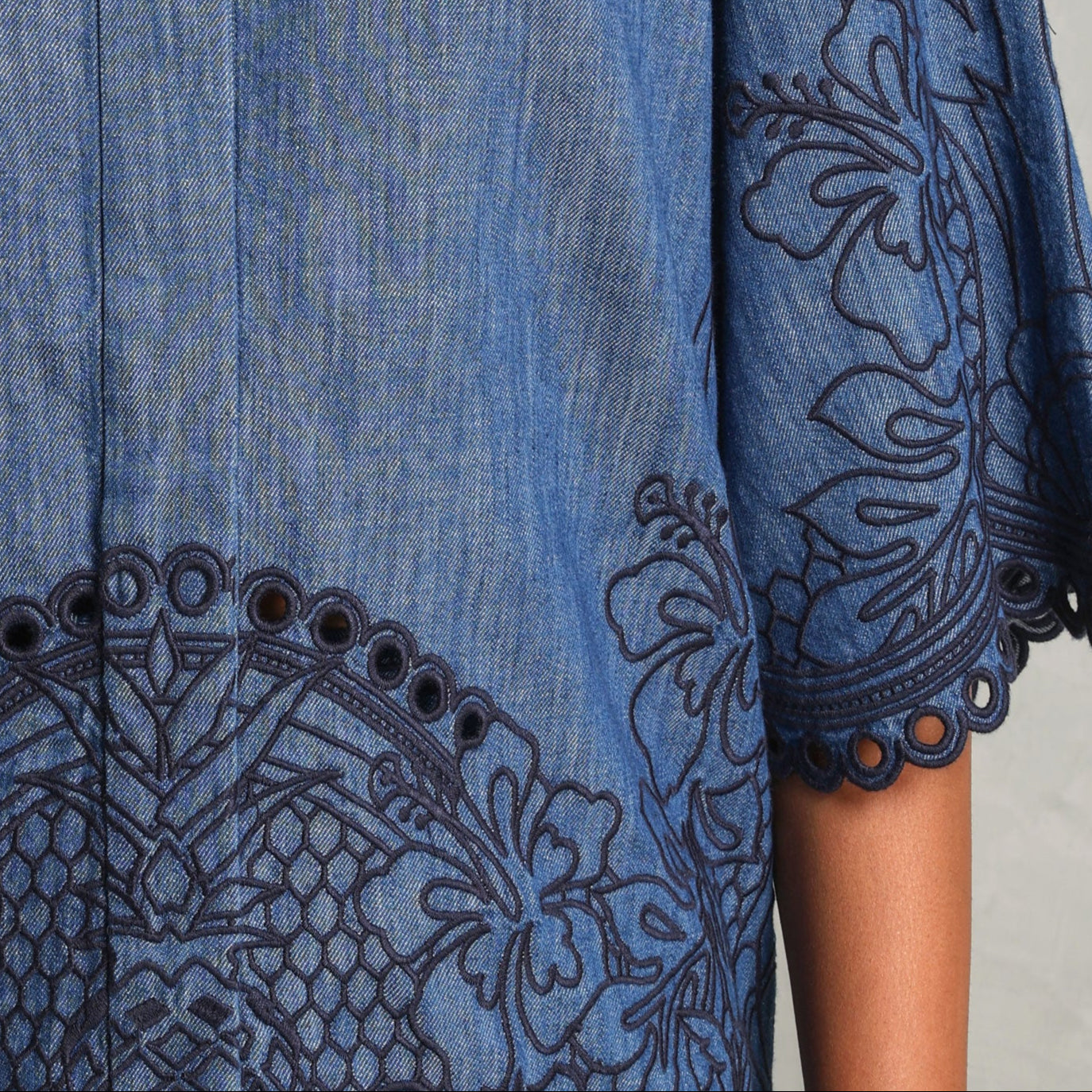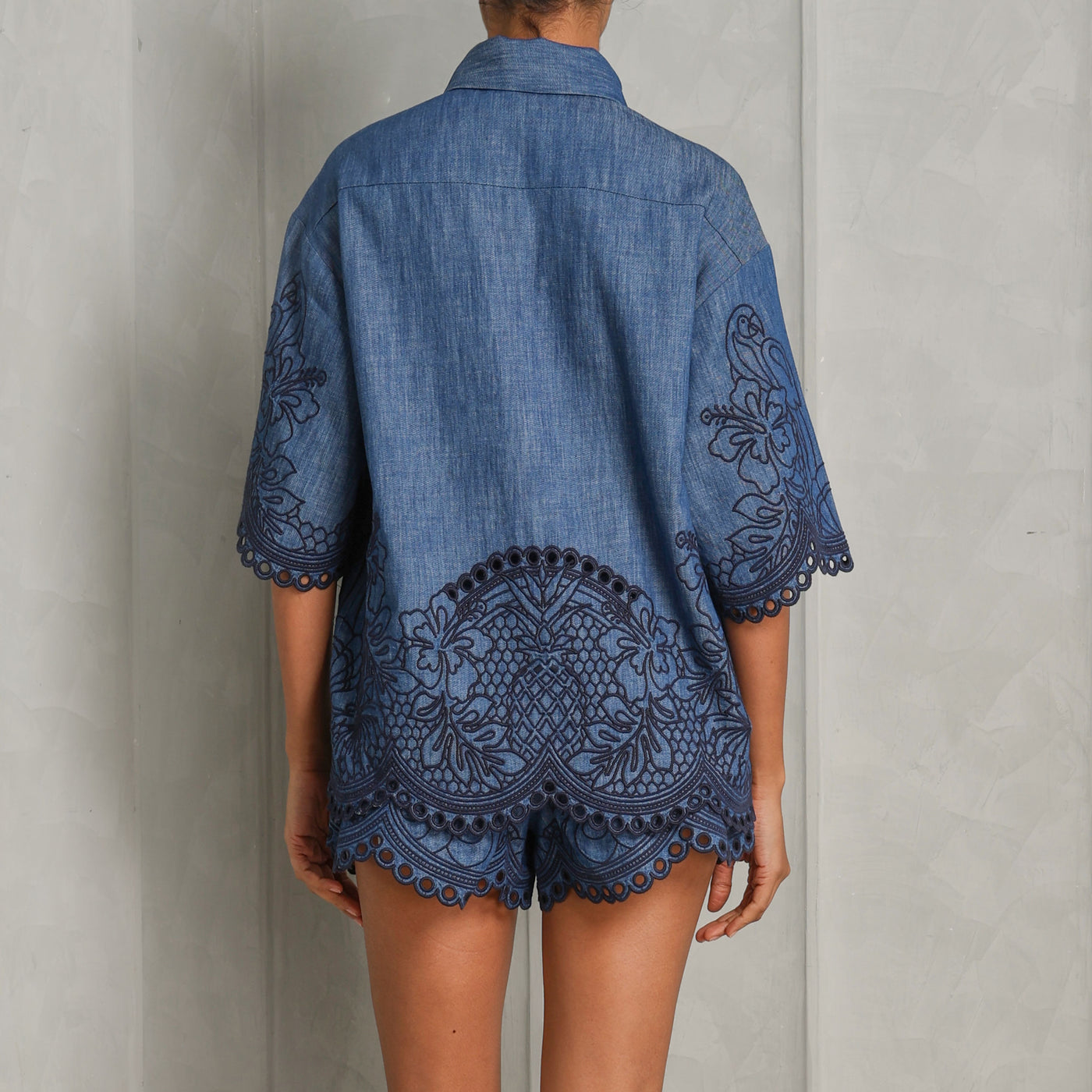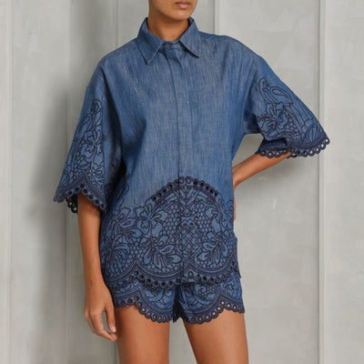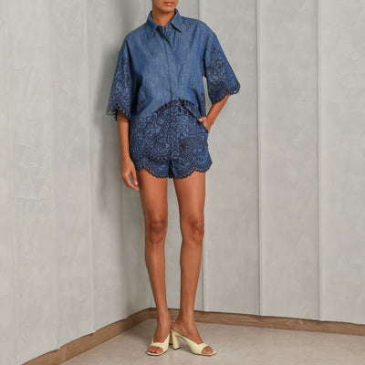 An artisanal take on a denim essential - meet Zimmermann's Coco Embroidered Denim Shirt. This short-sleeve shirt features all-over embroidery with delicate cutwork detailing, adding depth and dimension to its silhouette. Designed with a classic collar and wide sleeves, this shirt is finished with scalloped edges at the cuffs and hem for a soft contrast. With a concealed button placket and a flattering silhouette, this piece allows craftsmanship to take center stage. Complete your look with the Coco Embroidered Denim Short.