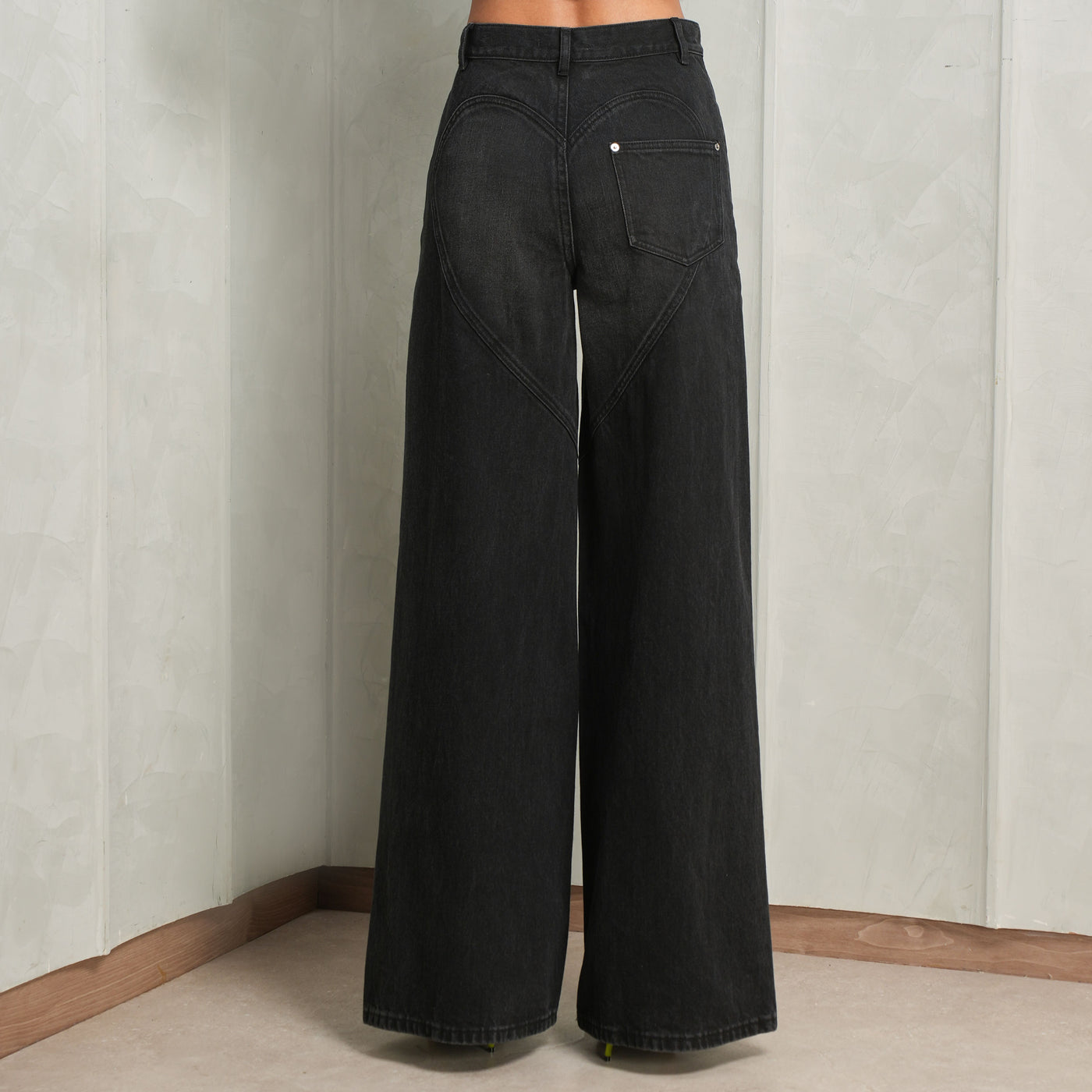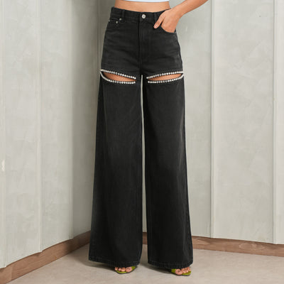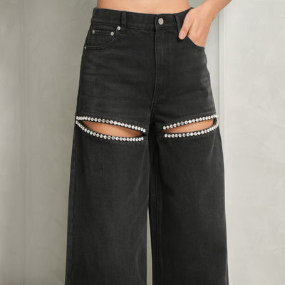 Meet the classic Wide Leg Crystal Slit Jean from Area in black. These jeans feature crystal cup chain trim slits at the thigh paired with a relaxed silhouette. For a complete look, style this timeless pair with Area's Crystal Heart Cropped Polo and Jacquemus' Medium Chiquito.