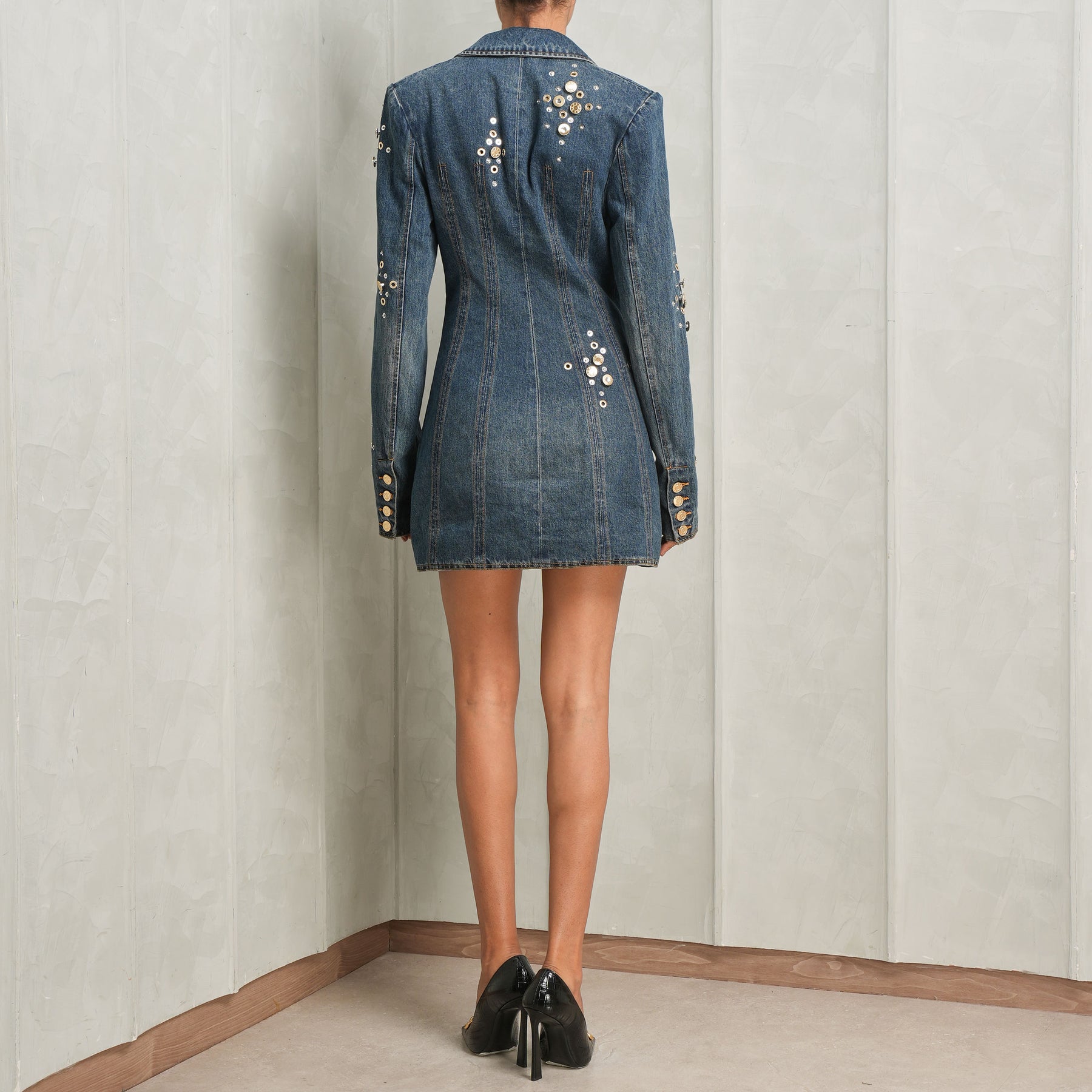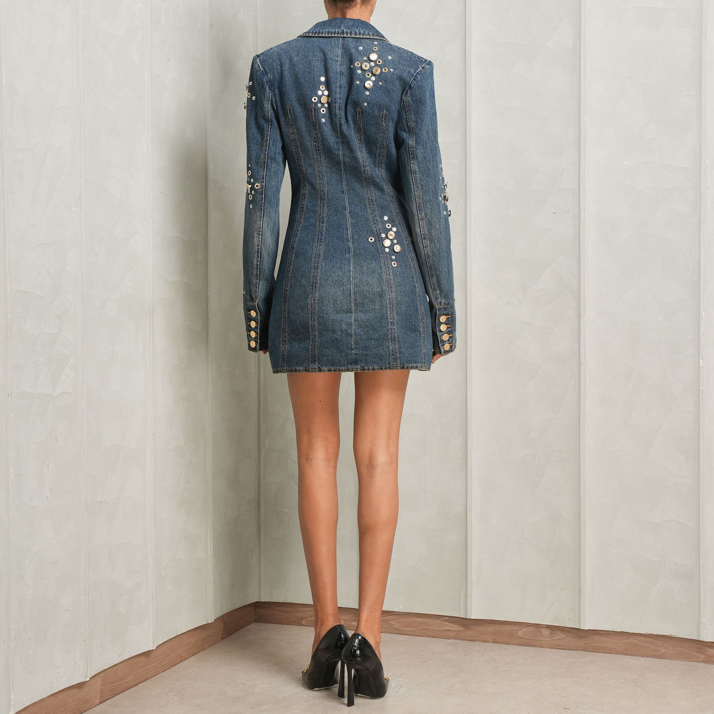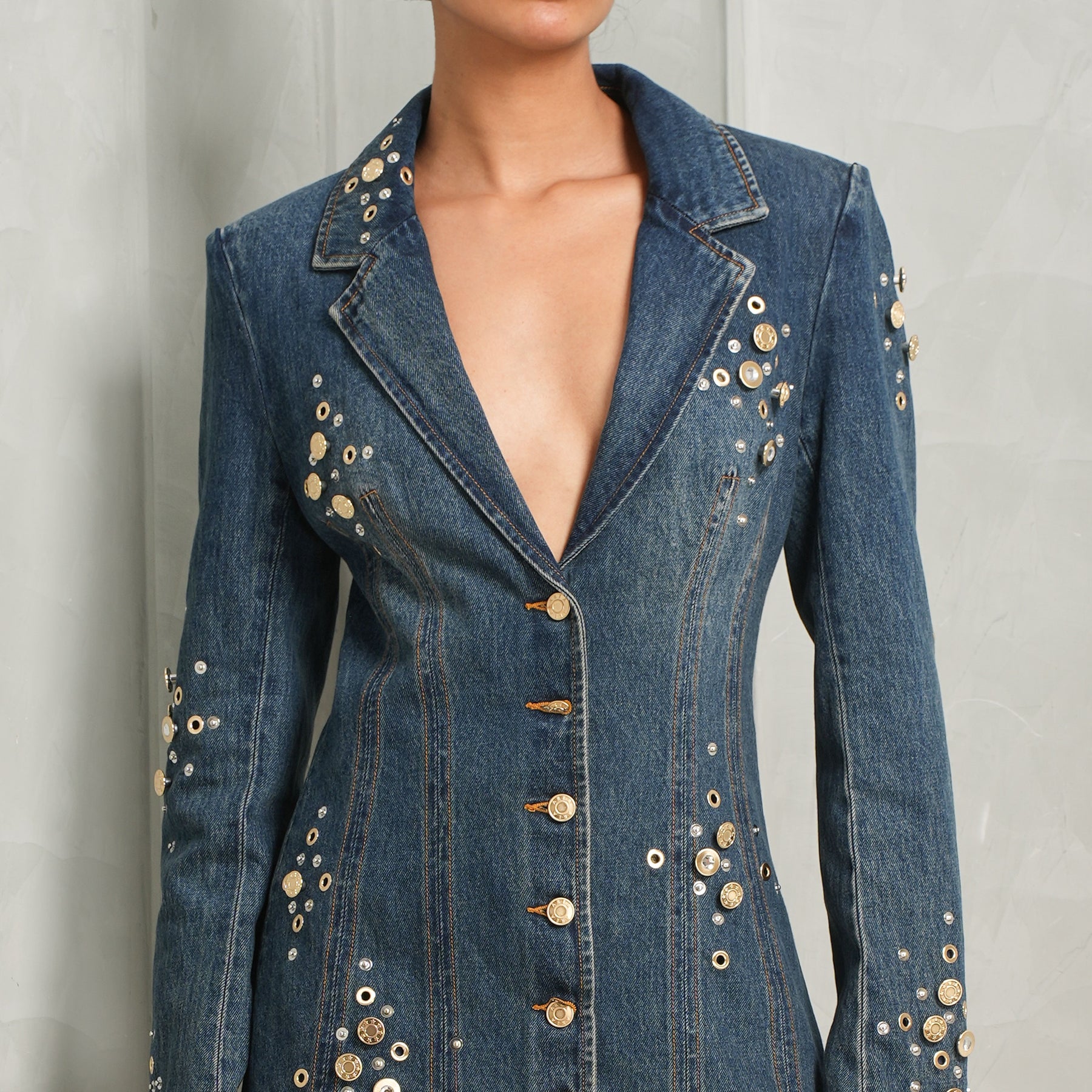 Introducing the Crystal Studded Blazer Dress from Area. This mini dress features a front button closure, crystal button and shank embellishment. This piece can be adorned as both a dress as well as a blazer - making it perfectly versatile and functional. For an elevated look, style this piece with L'alingi's Meleni Bag.