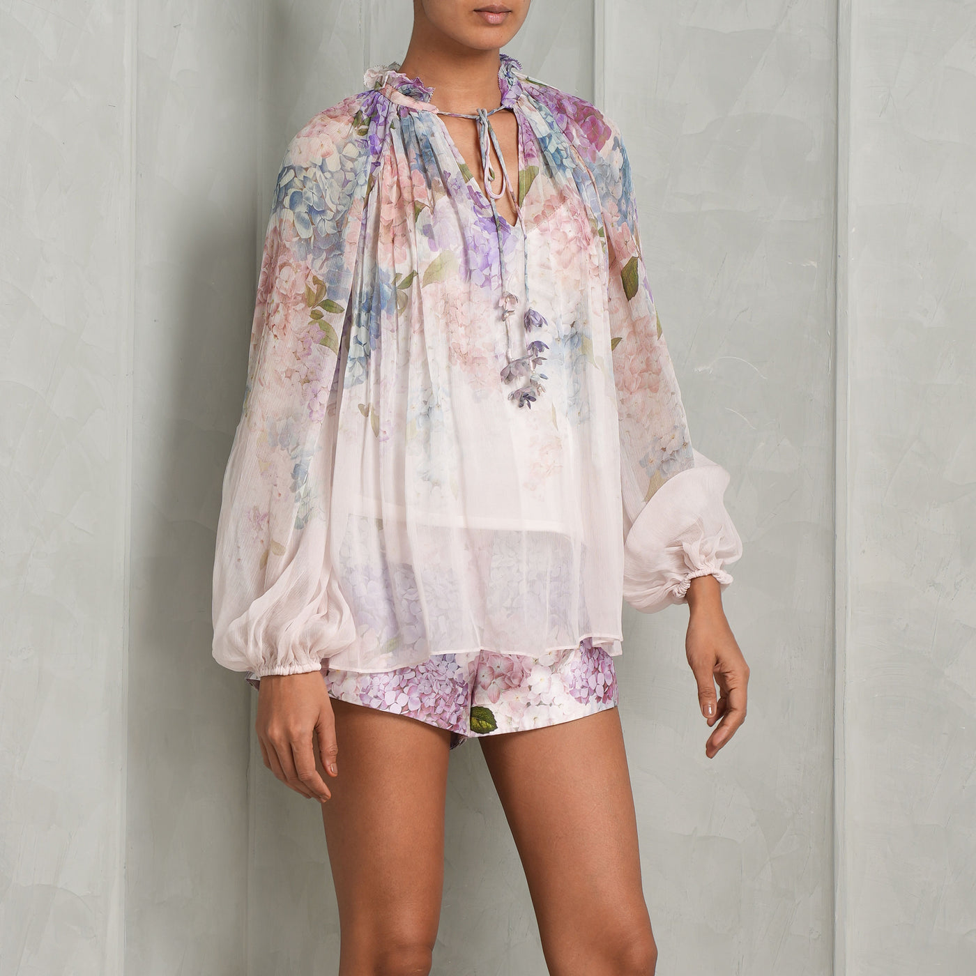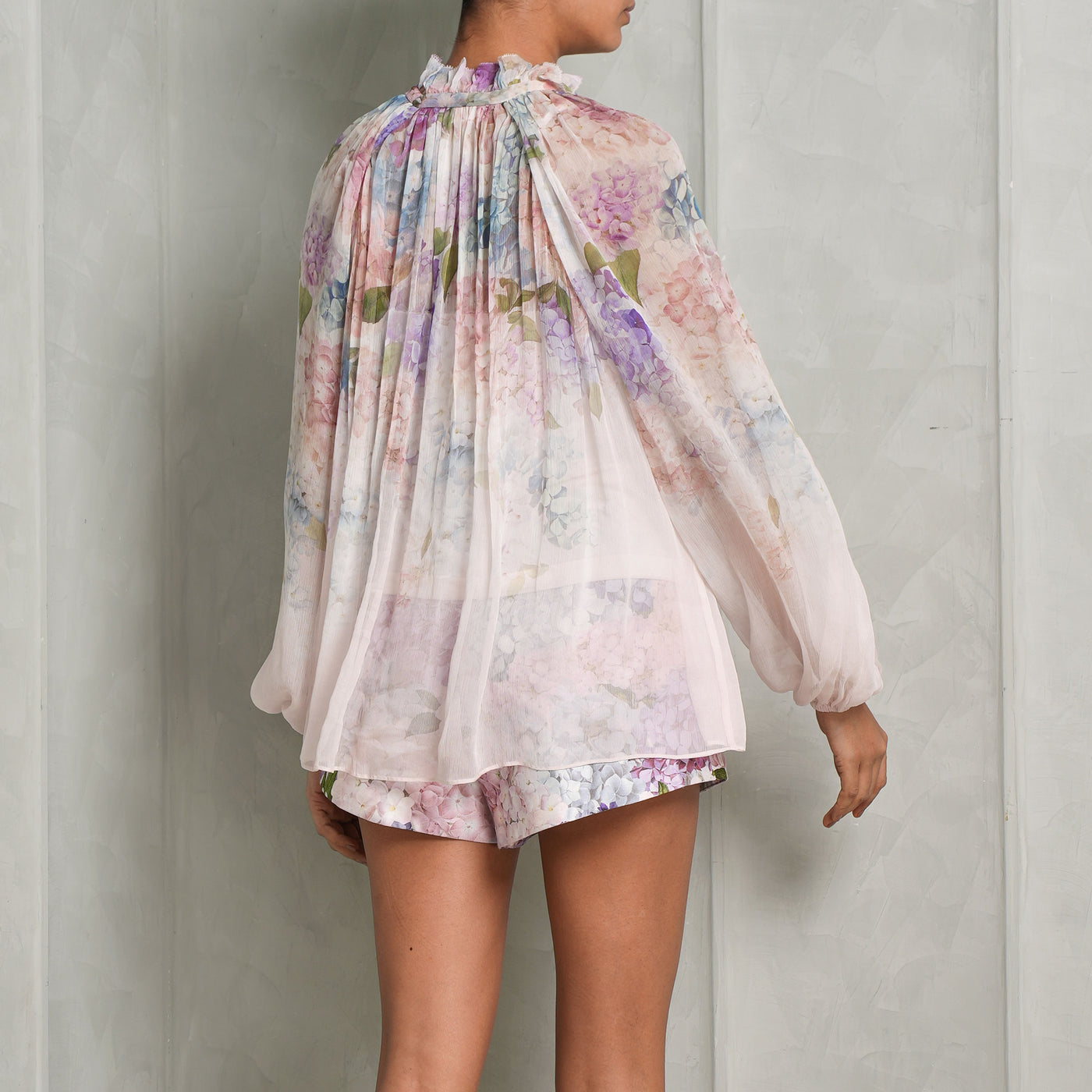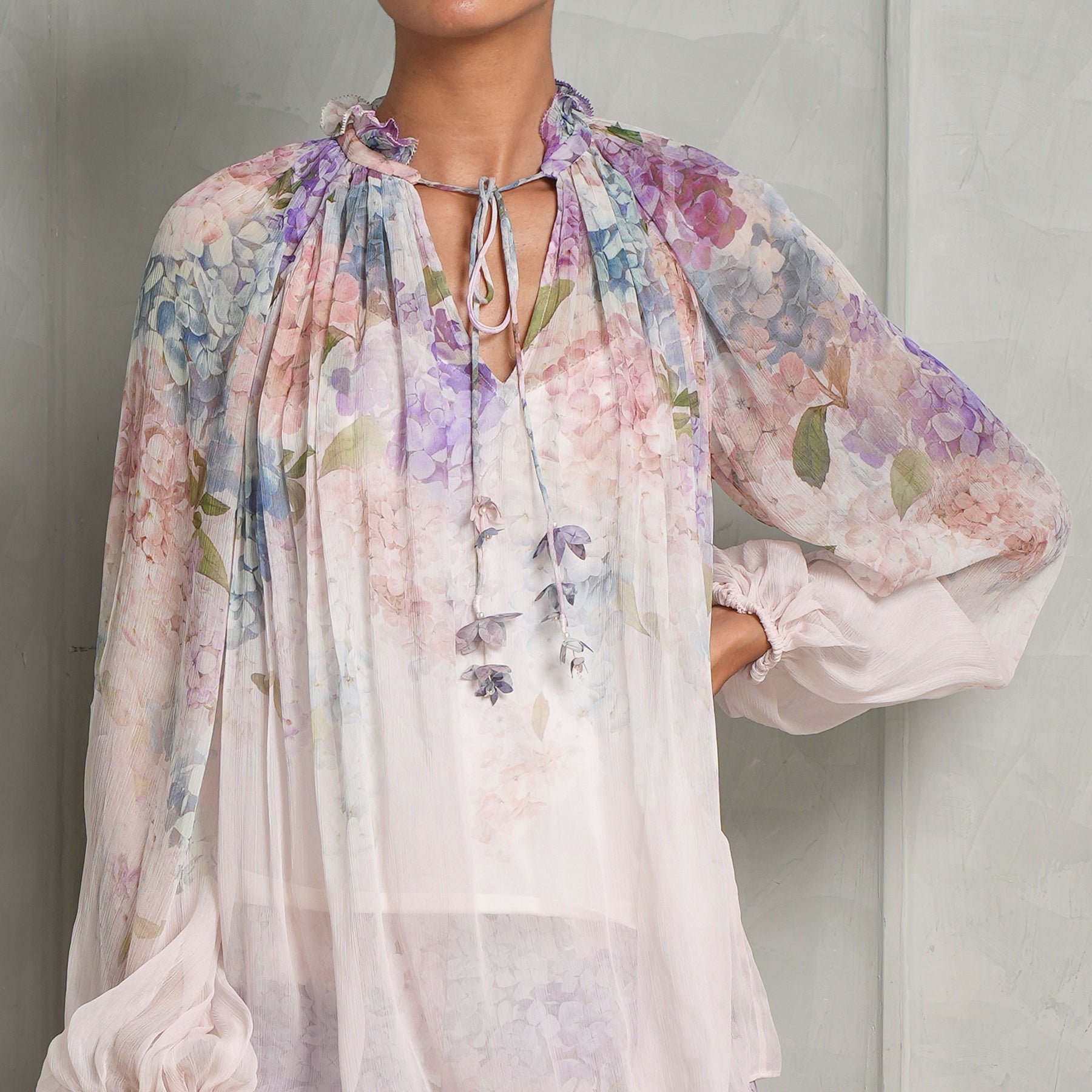 Introducing the Dawning Billow Blouse from Zimmermann -an embodiment of femininity. This long sleeve blouse adorns a stand collar, necktie and intricate gathering. This blouse comes with a self-rouleau tie at the neckline along with a floral trim. Apart from having a separate cami, this blouse boasts blouson sleeves, elasticated cuffs and a gathered front and back. Pair this effortless piece with Zimmermann's Dawning Flat Front Short.