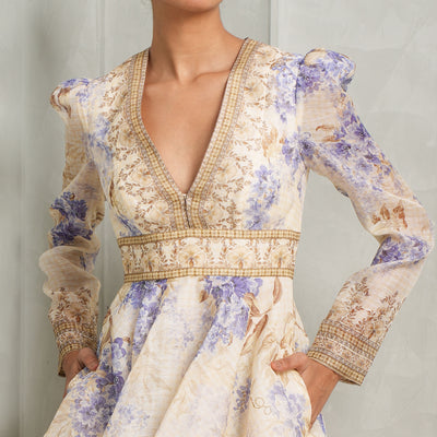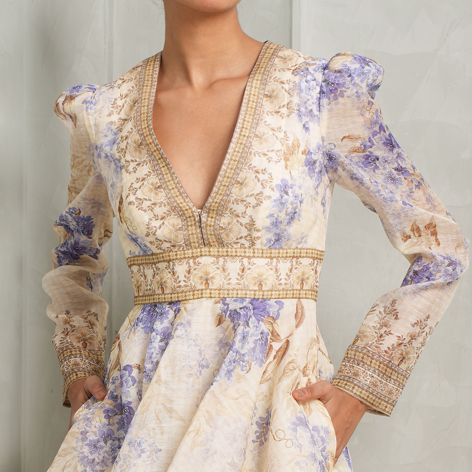 The Dawning Plunge Mini Dress from Zimmermann is crafted from silk linen and features a plunging V-neckline. This mini dress boasts a gathered sleeve head and an invisible zip closure. This dress is designed with a rouleau loop and button, making it playful yet functional. Style this mini dress with Loewe’s Small Puzzle Bag.