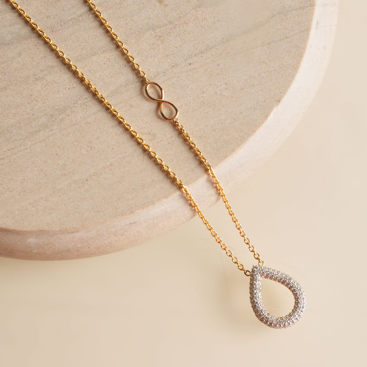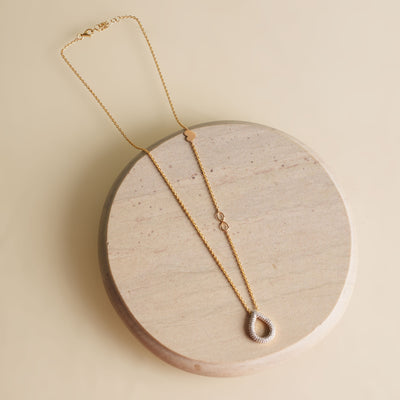 Introducing Sapna Mehta's Dewdrop Horizon Necklace - crafted with a diamond studded pendant and an 18k yellow gold chain. With its simple design and artistic approach, this piece radiates an old-world charm.