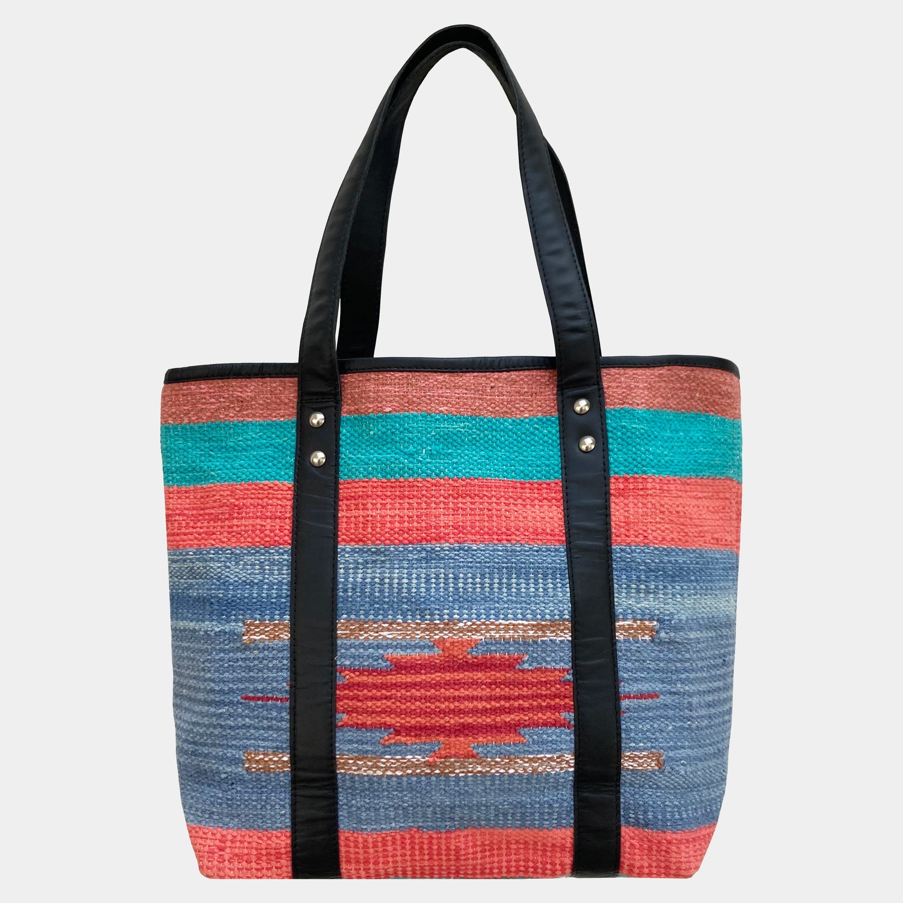 Dhurries or Daris are traditional hand-woven Indian cotton rugs. Joli collects them from across India and cuts them into bold totes. These one-of-a-kind Dhurri totes are unisex and a great bag to carry at the beach, at the market or on a short weekend gateway....
