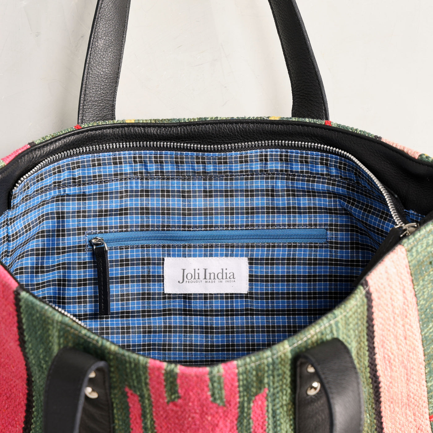 Crafted from hand-woven Indian cotton dhurries sourced across India, the Dhurri Small Tote from Joli is a one-of-a-kind statement piece. Spacious enough to carry your essentials, this tote is designed for both substance and function. This piece features a full zip closure and two interior pockets - one zipped and one with a leather trim. With a unique lining made from madras-check fabric, this bag is finished with sturdy handles and trims. Joli celebrates craft, culture, and contemporary design through this bag.