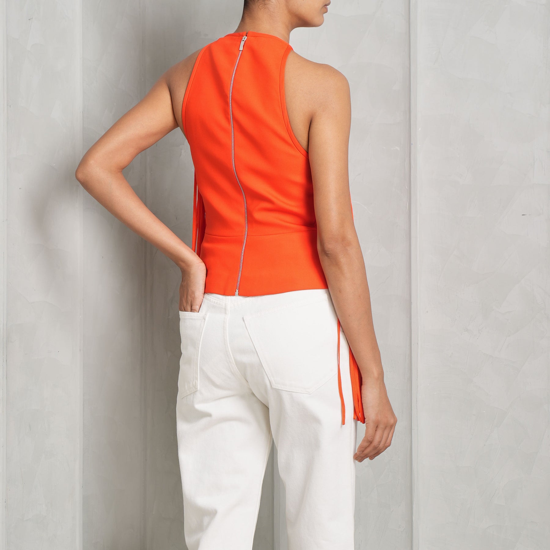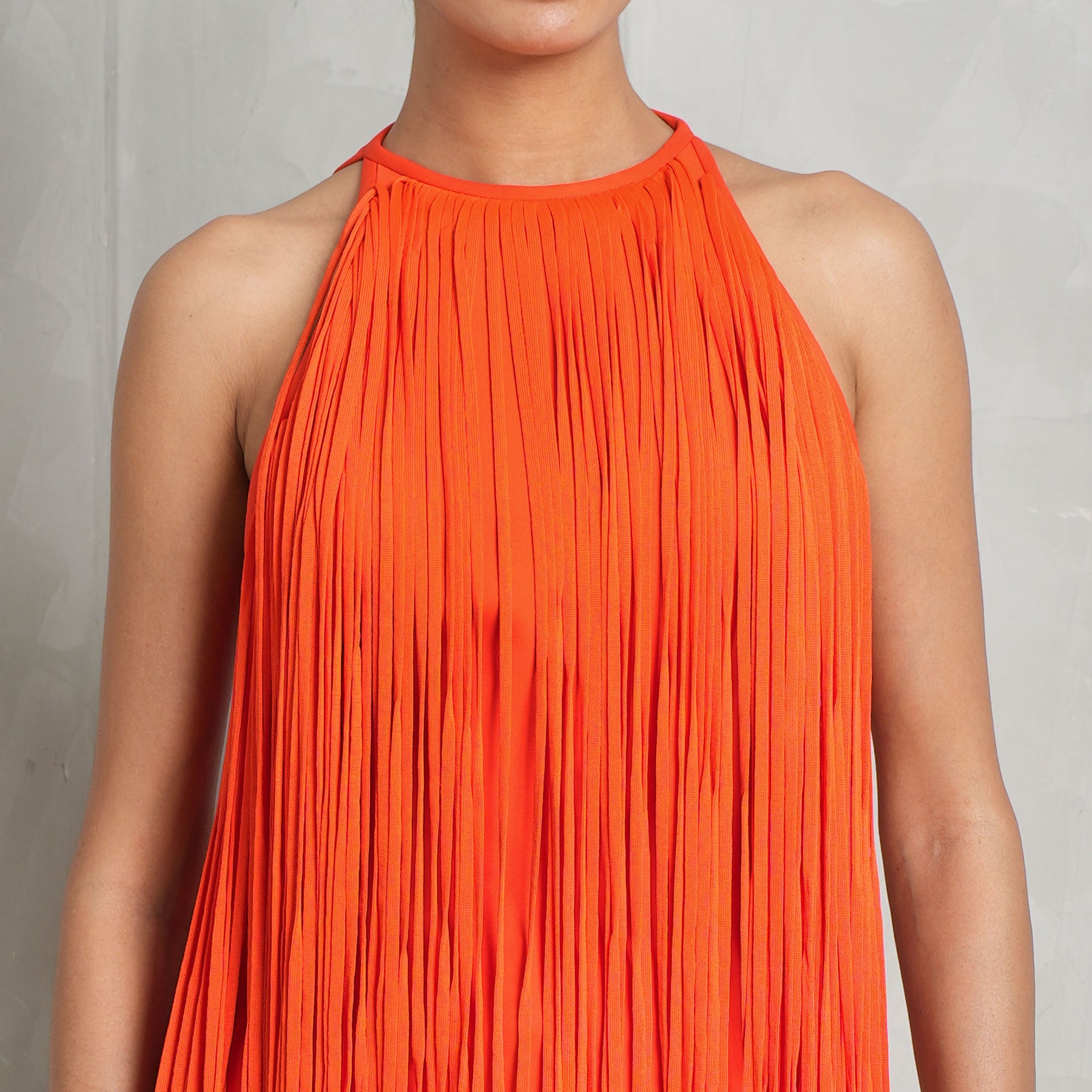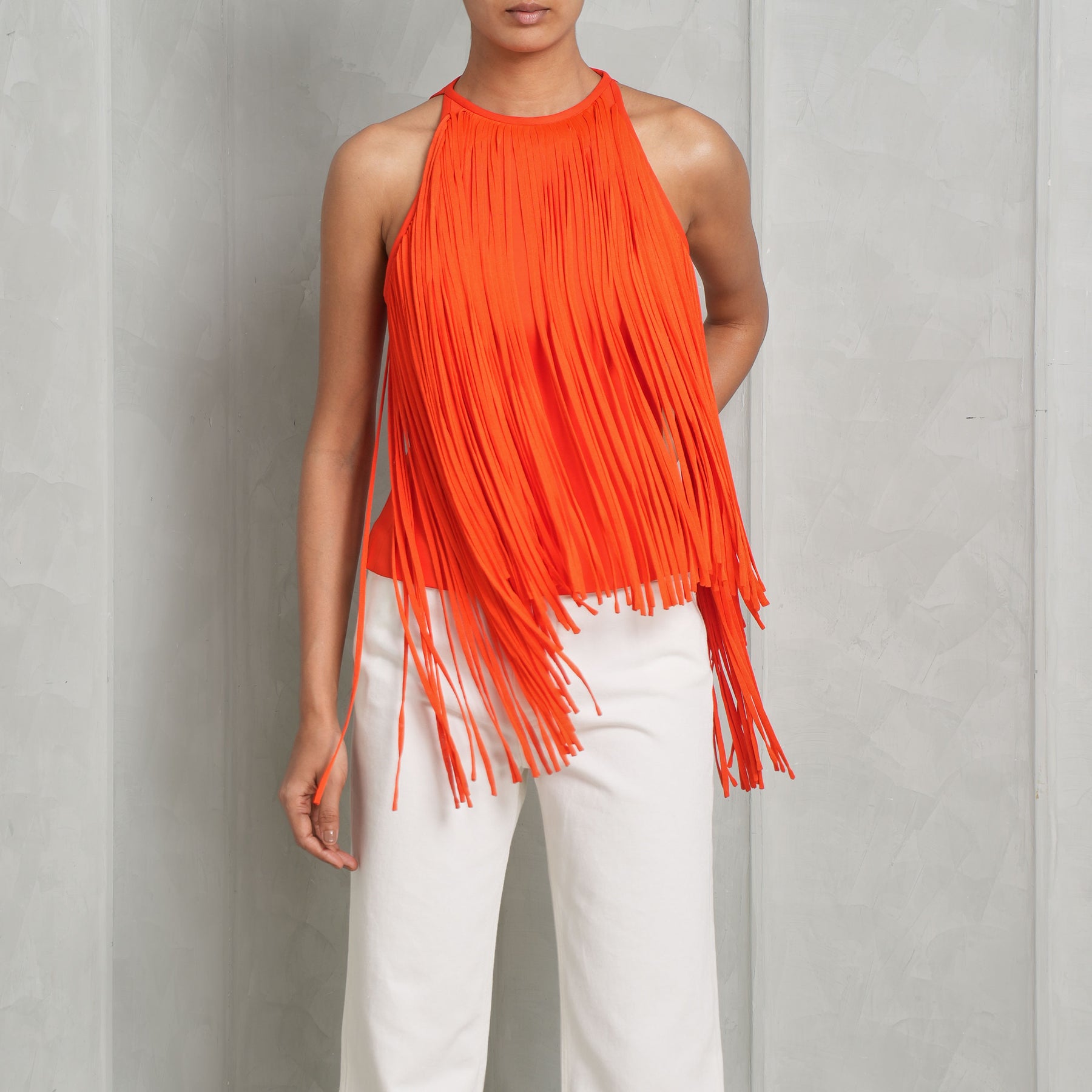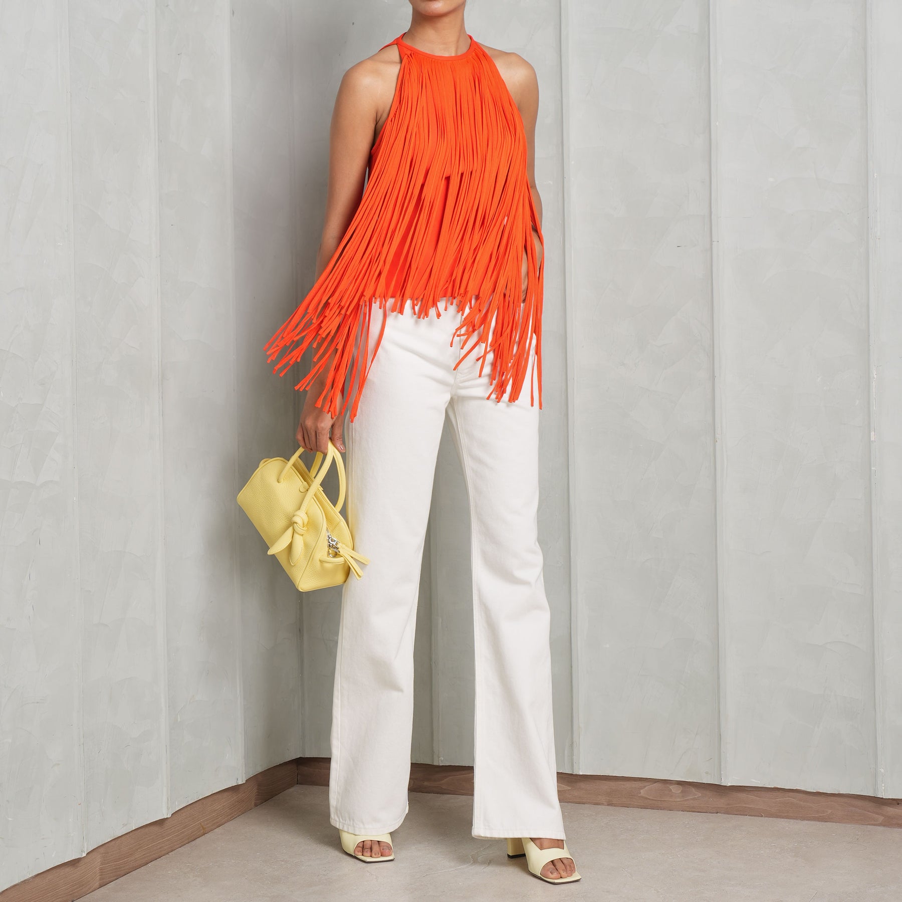 A statement piece that exudes dramatic flair - meet the Fringe Halter Top from David Koma in orange. This halter top features a cascading fringe detail - designed to move with ease. Bold in color, refined in silhouette - it's your after-hours essential with a touch of edge. Complete this look with Rabanne's Signature 1969 Discs Jeans and Small Turismo Bag.