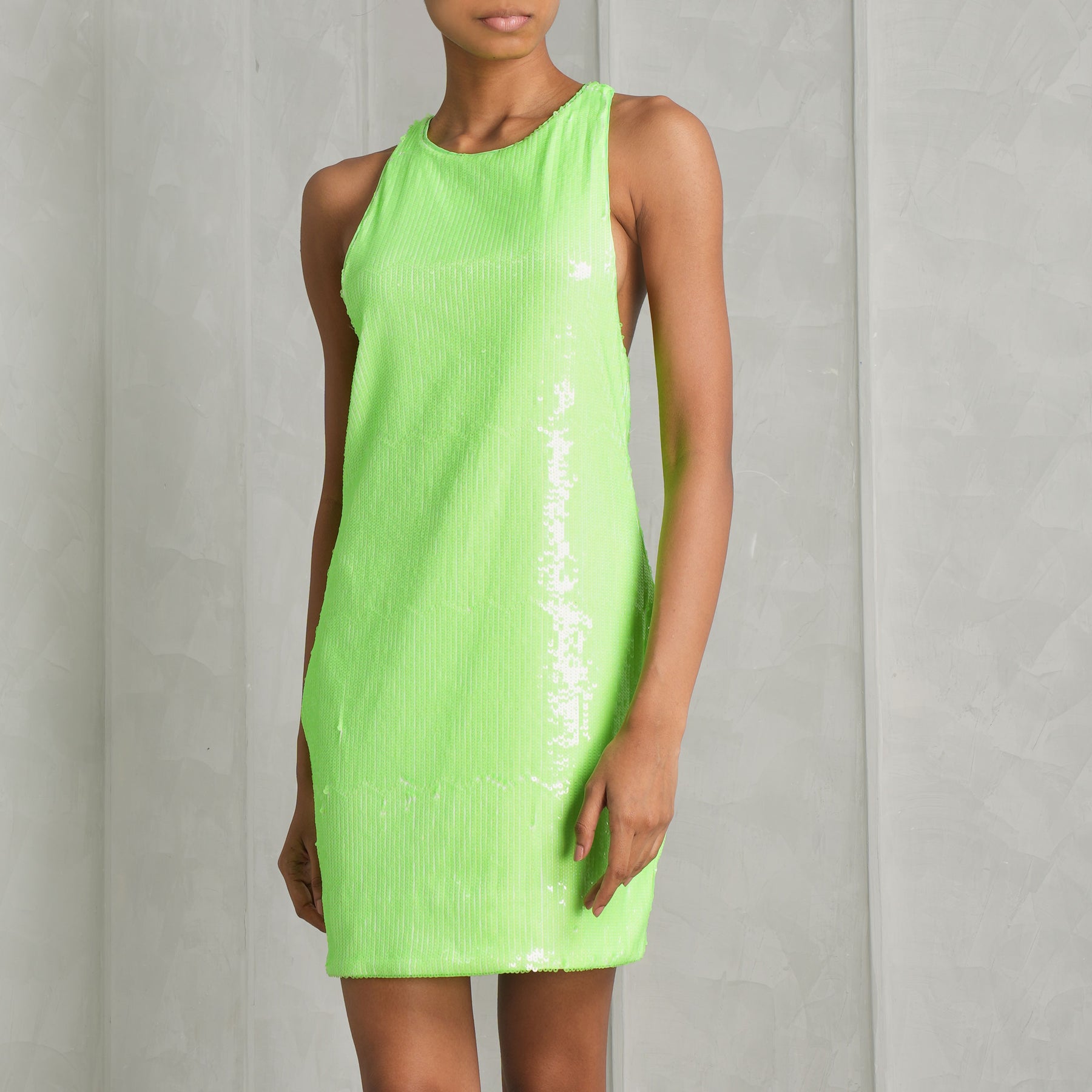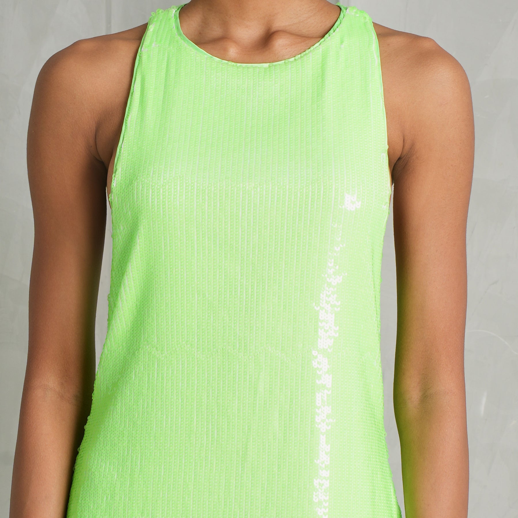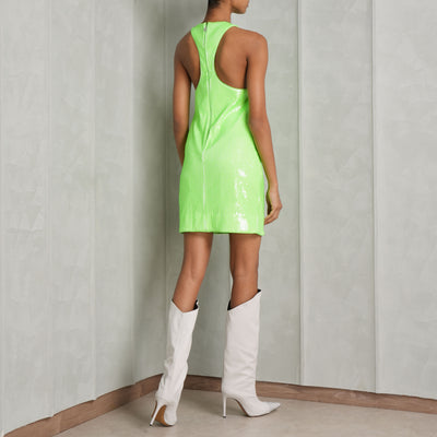 Crafted from a neon green sequined fabric, Rotate Birger Christensen's Gecko Sequined Dress features a flattering silhouette complimented by a round neck and sleeveless shoulders. This dress from Rotate Birger Christensen is further enhanced with a racerback with a logo zip closure. For a dressier occasion, pair this dress from Rotate Birger Christensen with Alexandre Vauthier's Embellished Leather Boots.