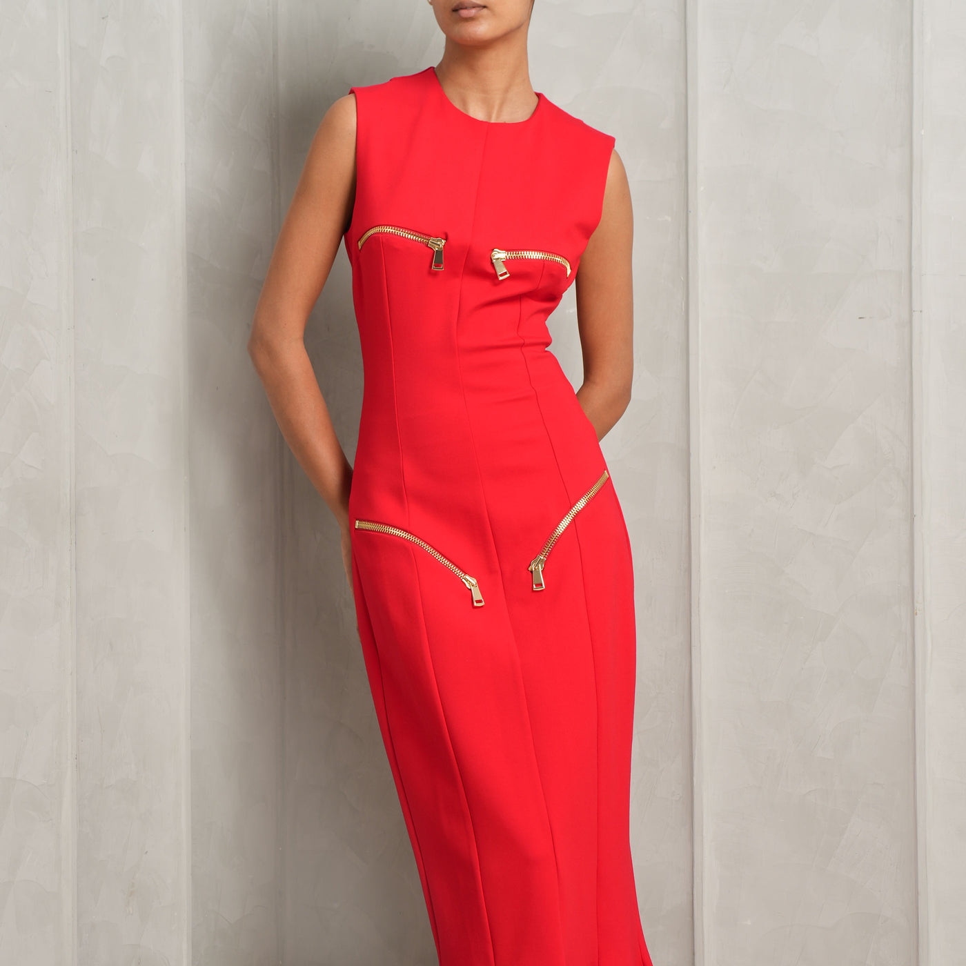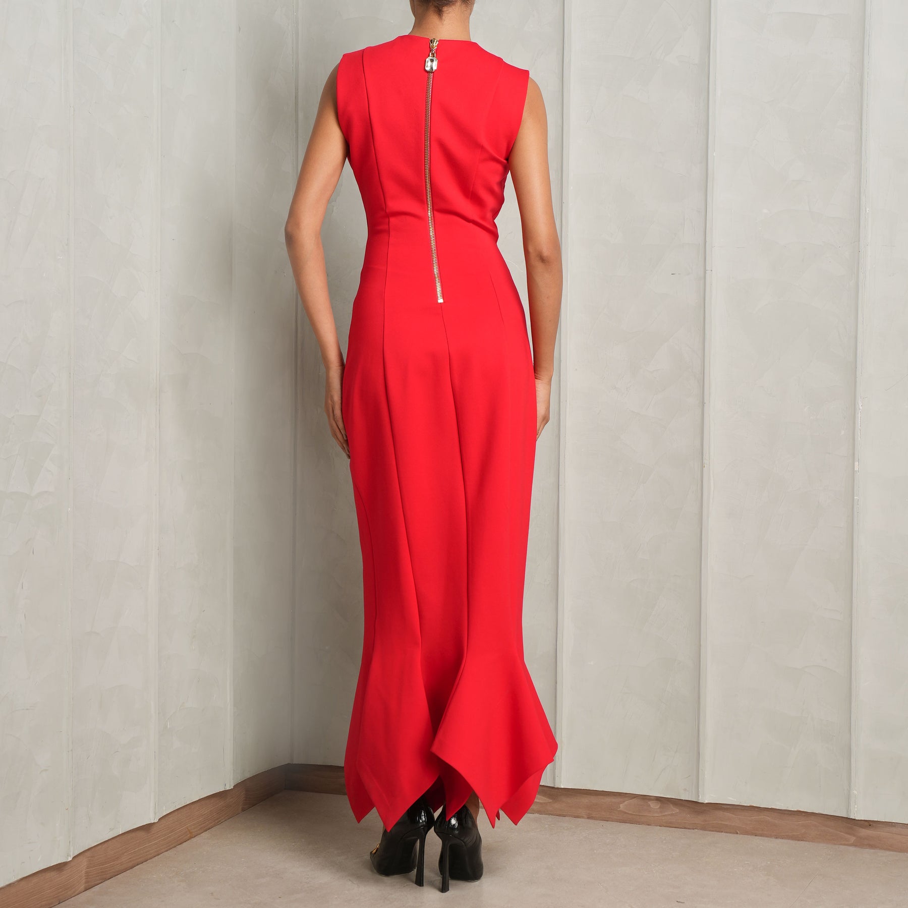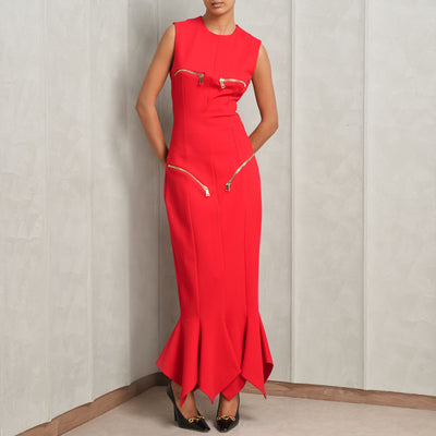 Fiery and bold - introducing Area's Handkerchief Zipper Midi Dress in red. This vibrant midi dress features a handkerchief hem, functional zippers at the chest and hip, and a back zip closure. With its well-structured silhouette and intricate design, this dress is ideally paired with your favorite heels.