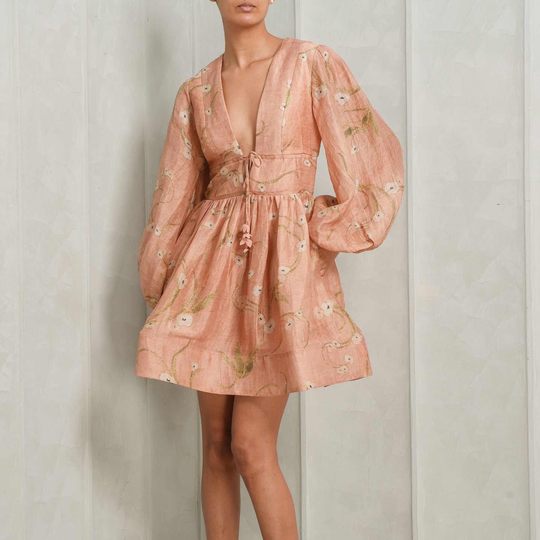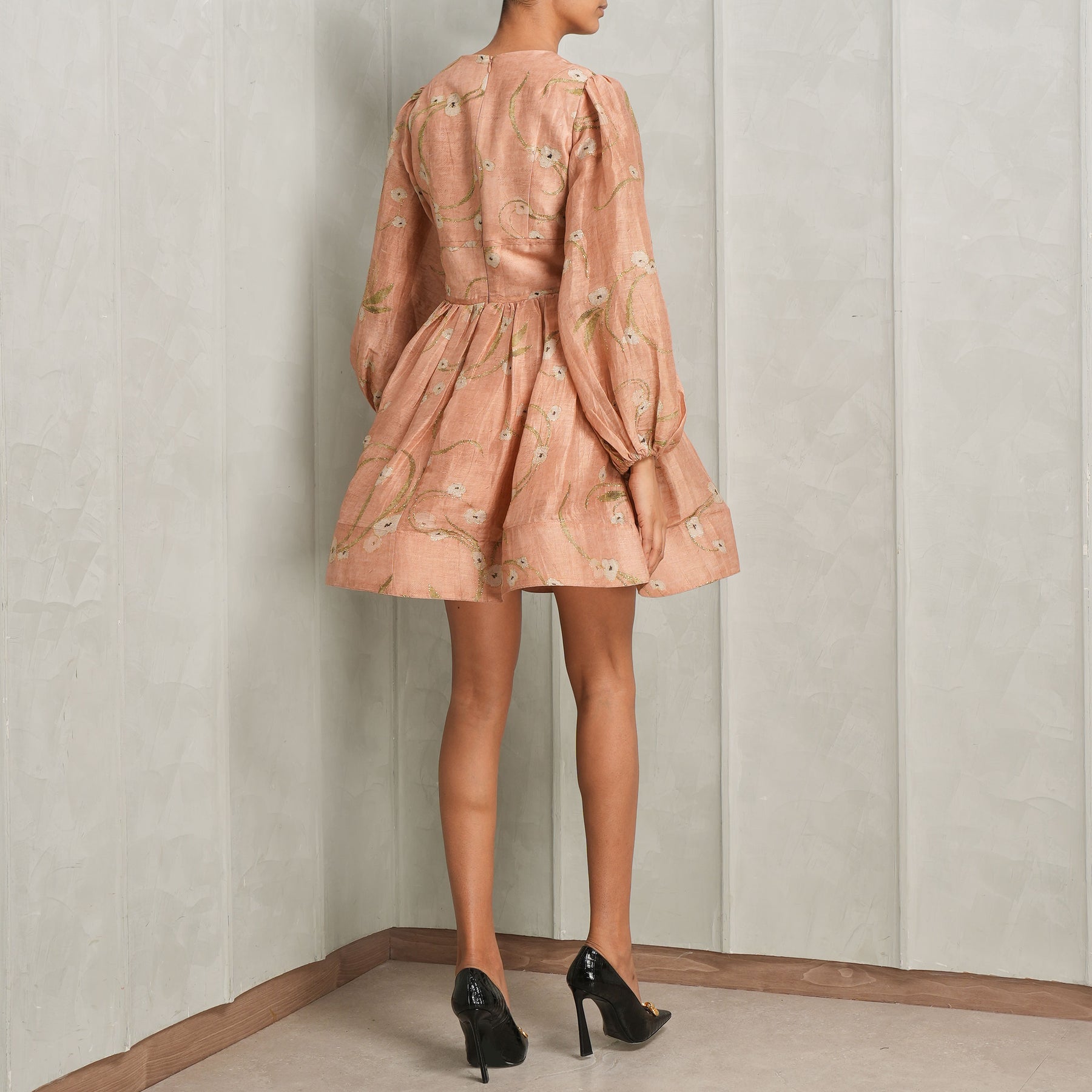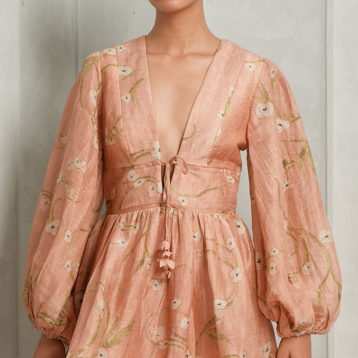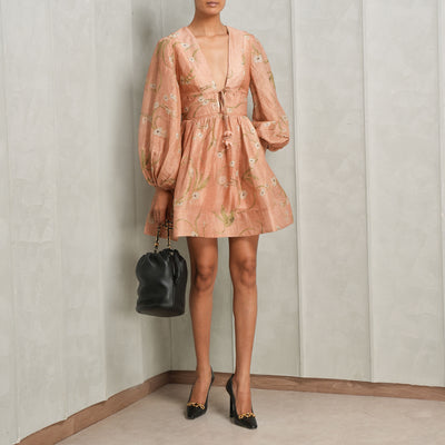 Meet the rustic Illuminate Drawn Mini Dress from Zimmermann. This mini dress is crafted from silk linen and features a plunging V-neckline, blouson sleeves and elasticated cuffs. This dress has a gathered waistline and piping detail. This dress is defined by its self-tie bust detail with flower trims, making it both feminine and functional. For an effortless look, pair this dress with Flamenco Bucket Purse from Loewe.