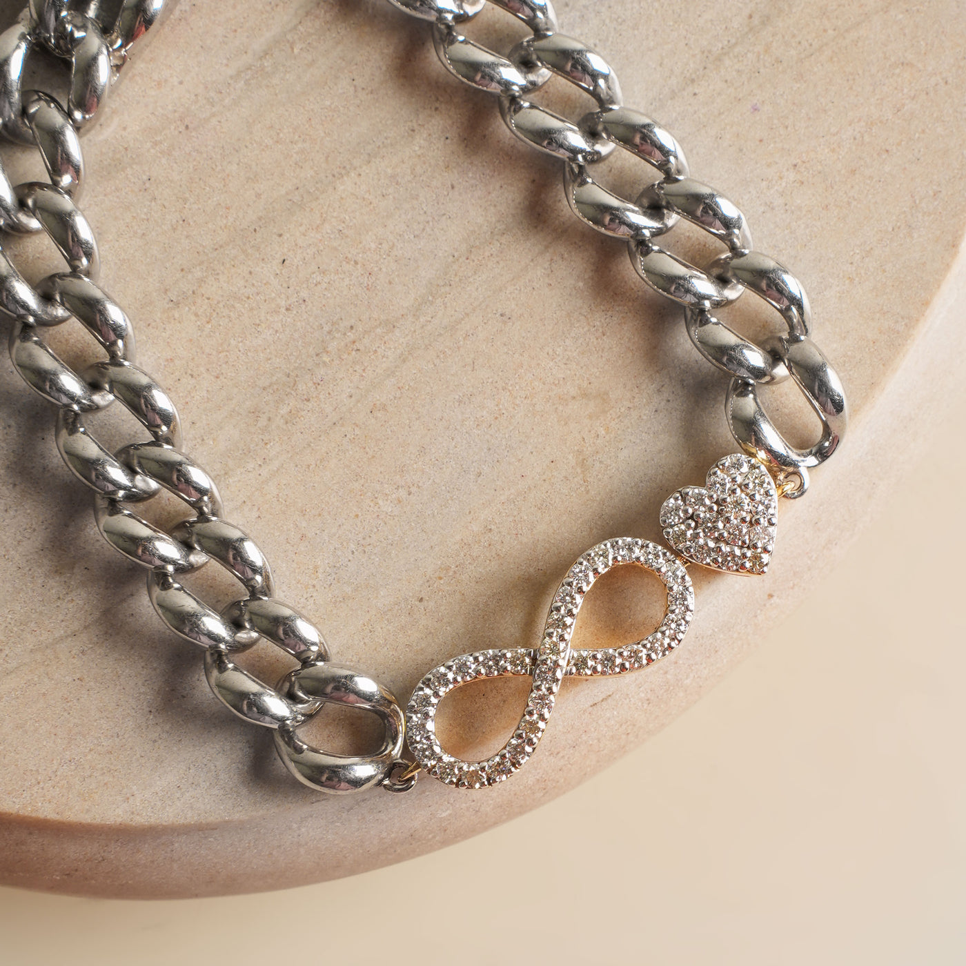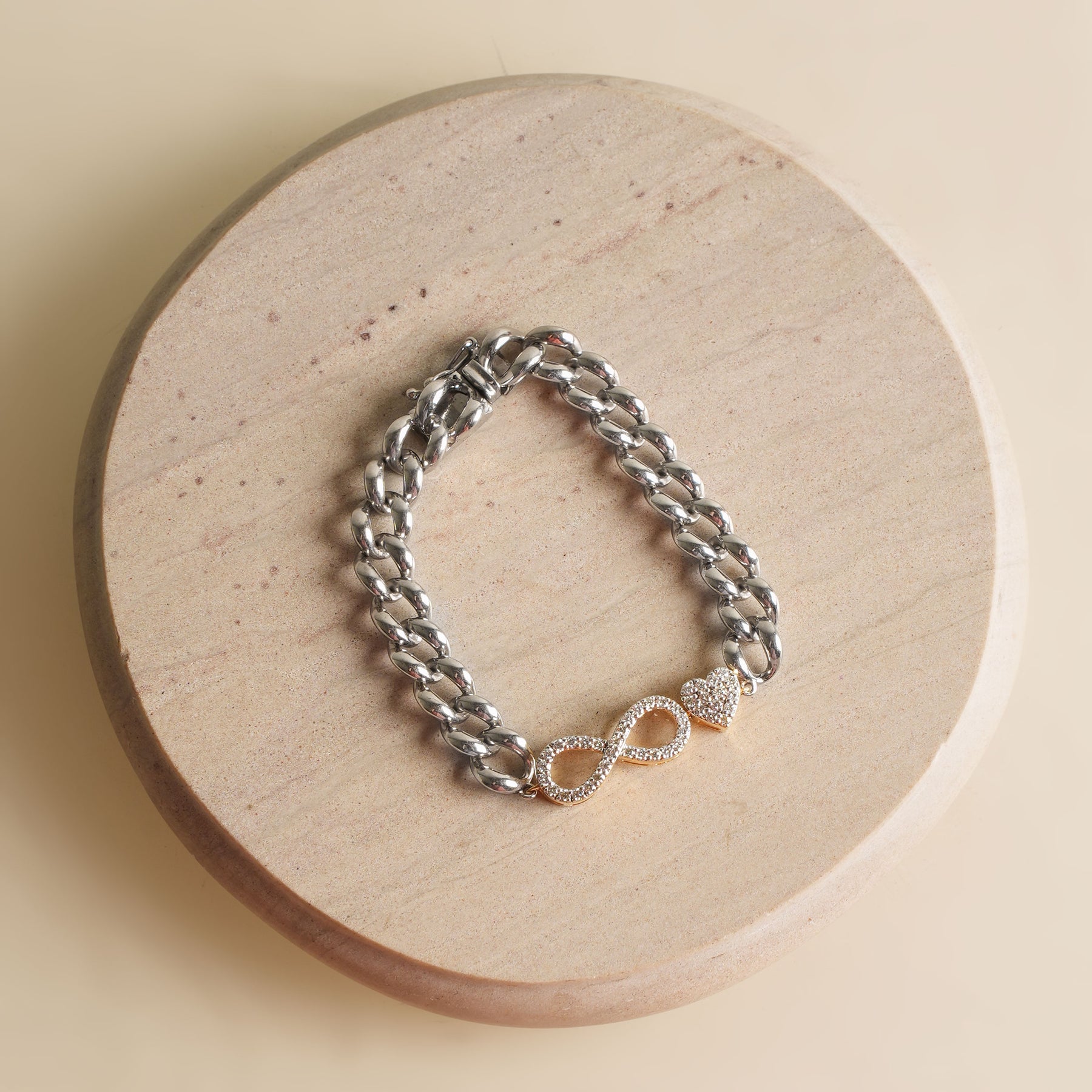 Sapna Mehta's Infinity Bracelet features a signature infinity symbol, crafted in 925 Sterling Silver and accented with natural diamonds. Handcrafted with love, each detail of this piece speaks of eternal bonds. Lightweight and versatile, this bracelet is perfect for both everyday wear and as a meaningful gift.