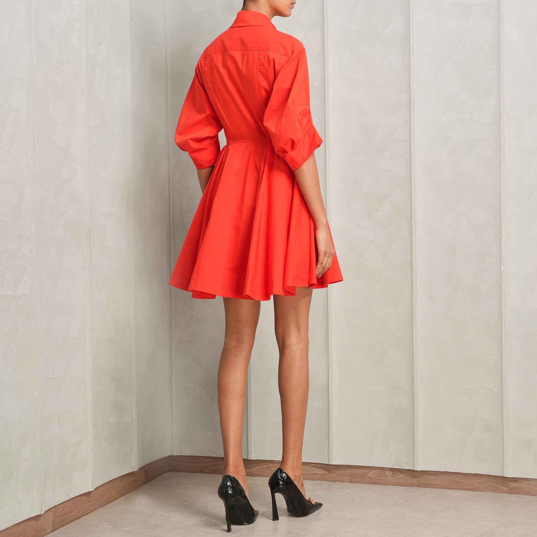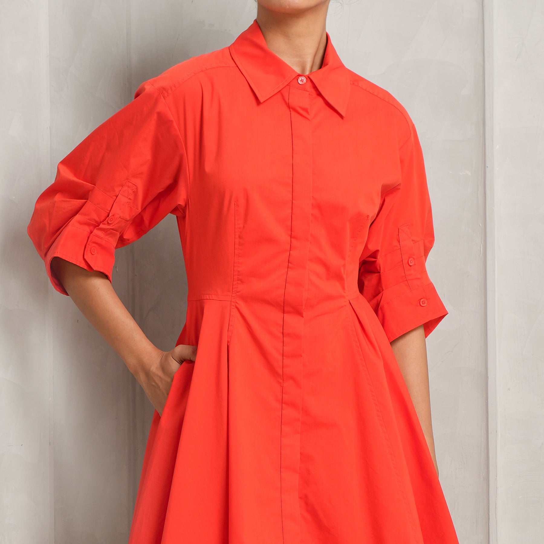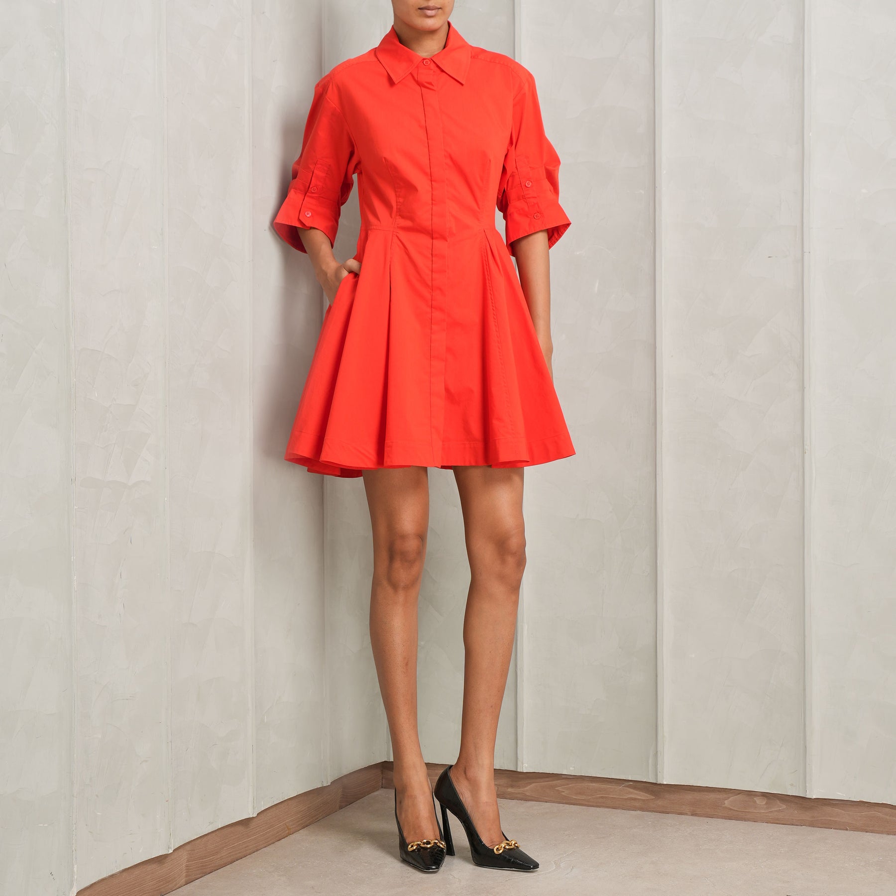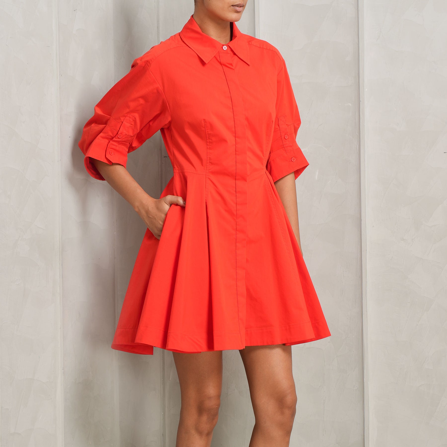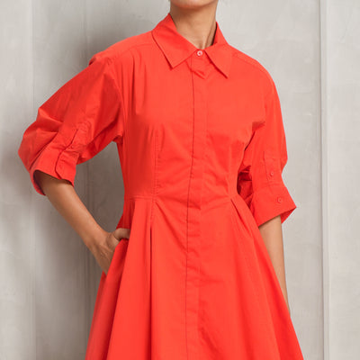 Fiery yet subtle - introducing Simkhai's Jazie Mini Dress in red. This dress is crafted from non-stretch yet breathable poplin and features a mini length, collared neck, gathered skirt and on-seam side pockets. With its elbow-length puff sleeves, button cuffs and placket, this dress is both functional and elevated. Whether dressed up or down, this dress is ideal for every occasion. Pair this dress with your favorite heels.