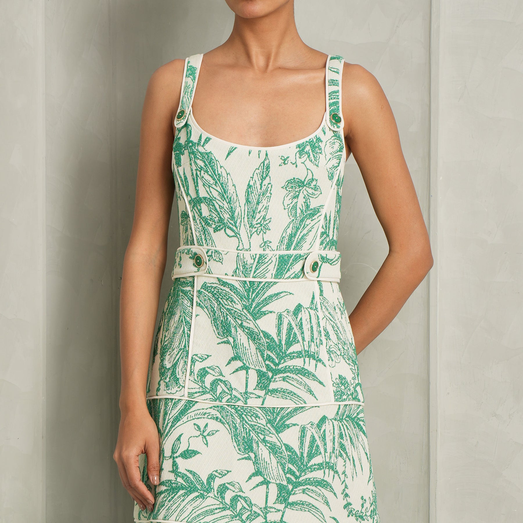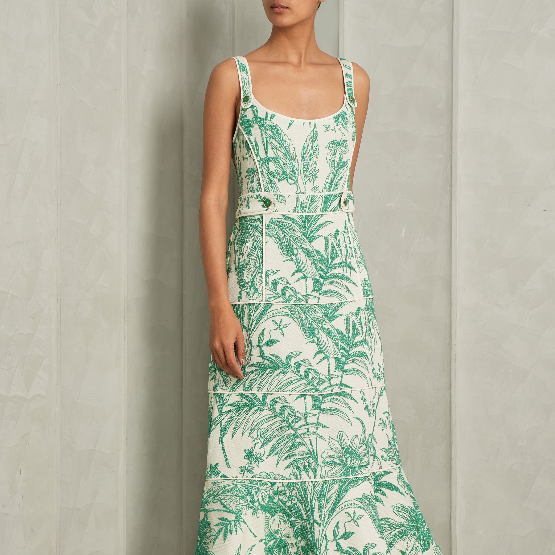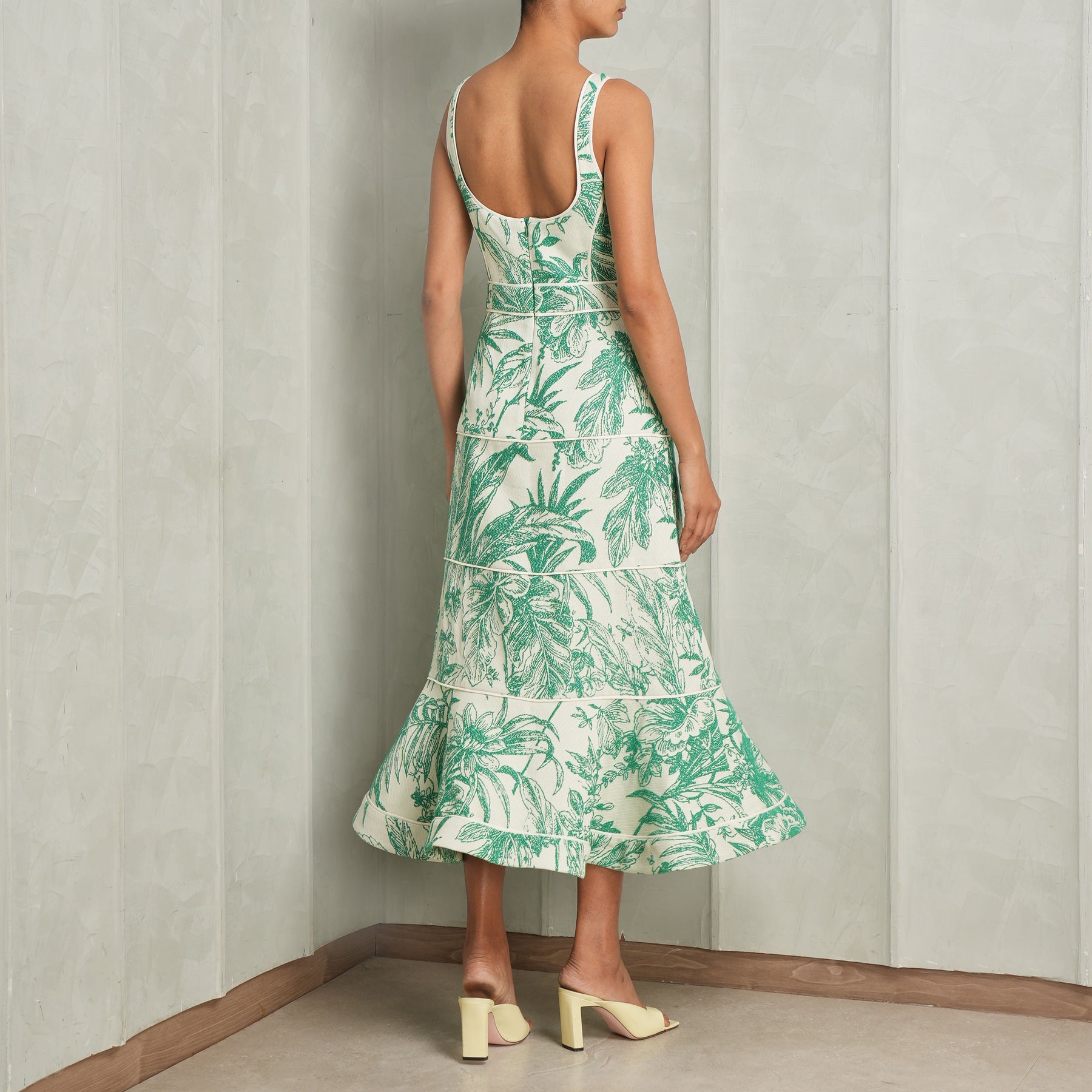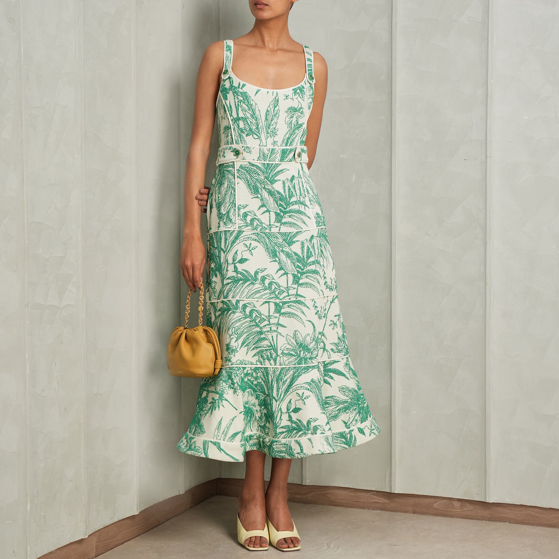 The Kayleen Dress from Alexis is a paneled midi silhouette designed to sculpt and flatter through precise tailoring. Crafted in a richly textured jacquard, it offers depth and quiet dimension, while the wide straps provide both structure and a balanced, modern frame to the neckline. The paneled construction enhances the natural shape of the body, creating a refined fit that styles well with Mini Flamenco Bag by Loewe.