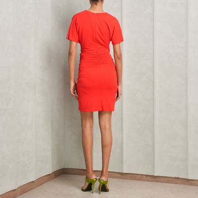 Fiery and fierce - introducing Simkhai's Kiko Mini Dress in red. This short-sleeve mini dress is crafted from draped jersey and adorns a contoured fit. Ideal for both elevated and casual occasions. Pair this dress with your favorite heels.