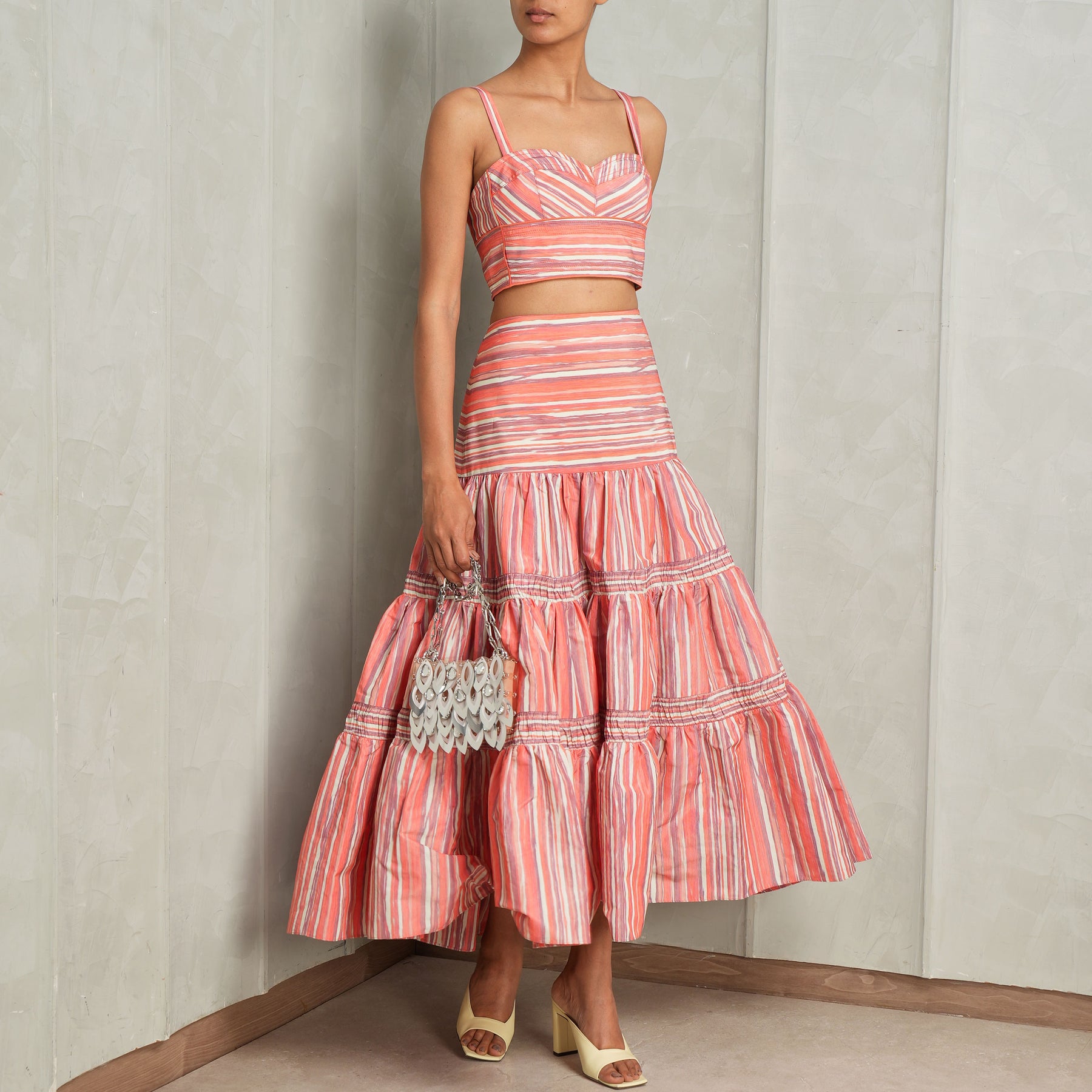 The Kit Top from Alexis is a cropped bustier silhouette crafted in a vibrant striped fabric, designed to contour and celebrate the form with quiet confidence. Structured through the bodice yet refined in finish, it balances playful color with a sculpted, feminine shape. The clean neckline and tailored fit lend a sense of modern polish, while the bold stripe detailing adds movement and visual intrigue. Pair it with Elaina Skirt and Nano Teardrop Bag from Rabanne