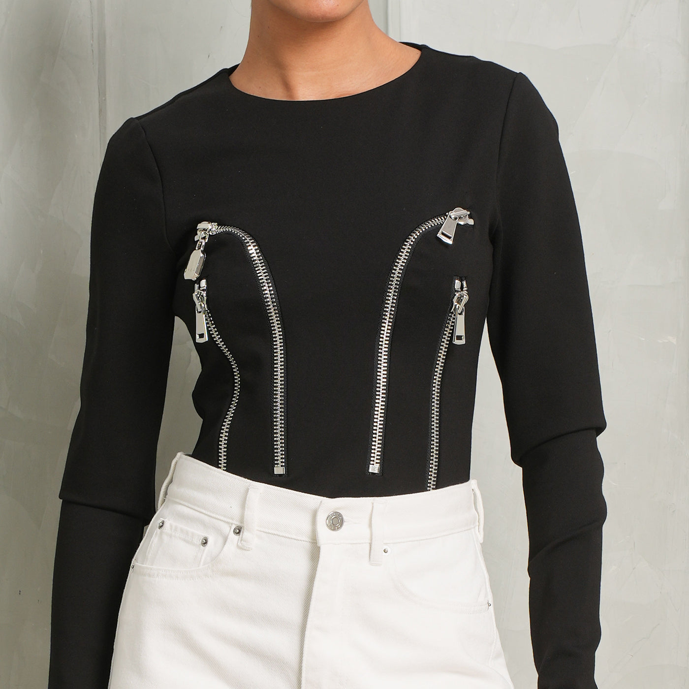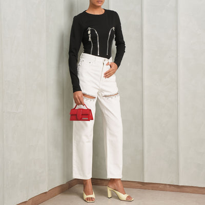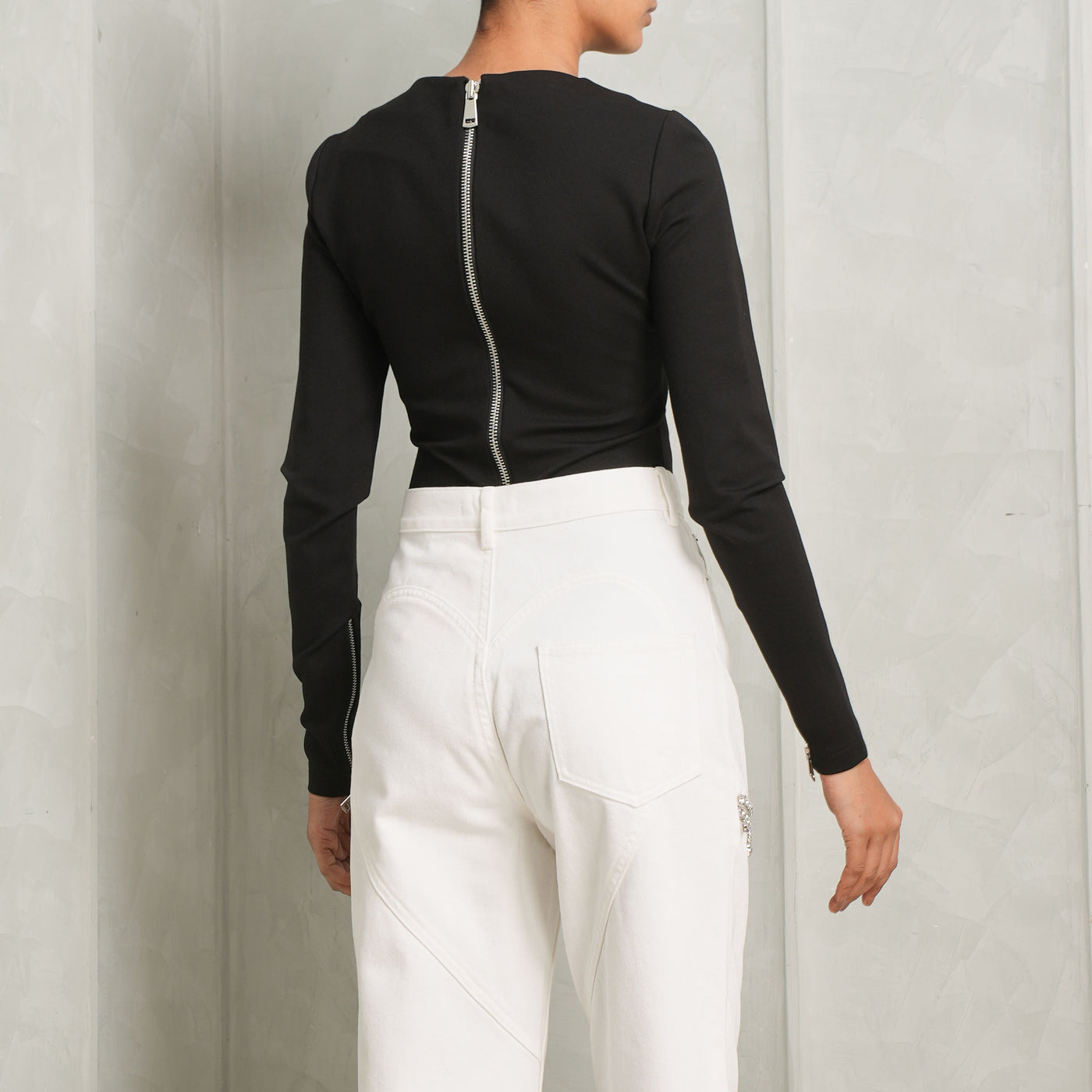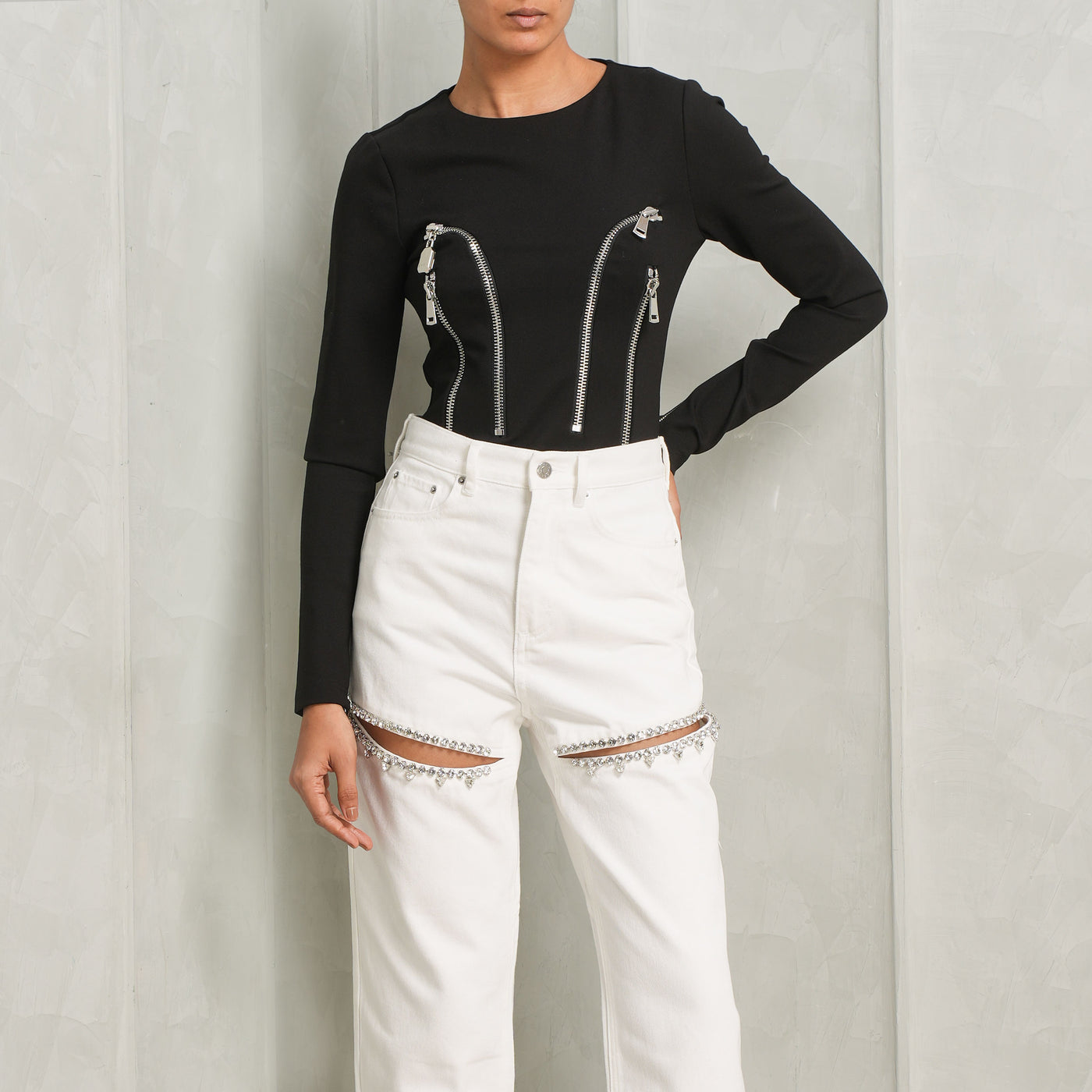 Meet the Long Sleeve Zipper Bodysuit from Area in black. This bodysuit features embellished zippers paired with a crystal zip pull and snap buttons at the crotch. With its fitted silhouette and elevated form, this bodysuit blends well with Area's Crystal Slit Jean and Bambino Bag from Jacquemus.