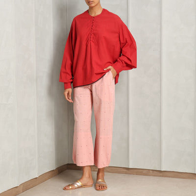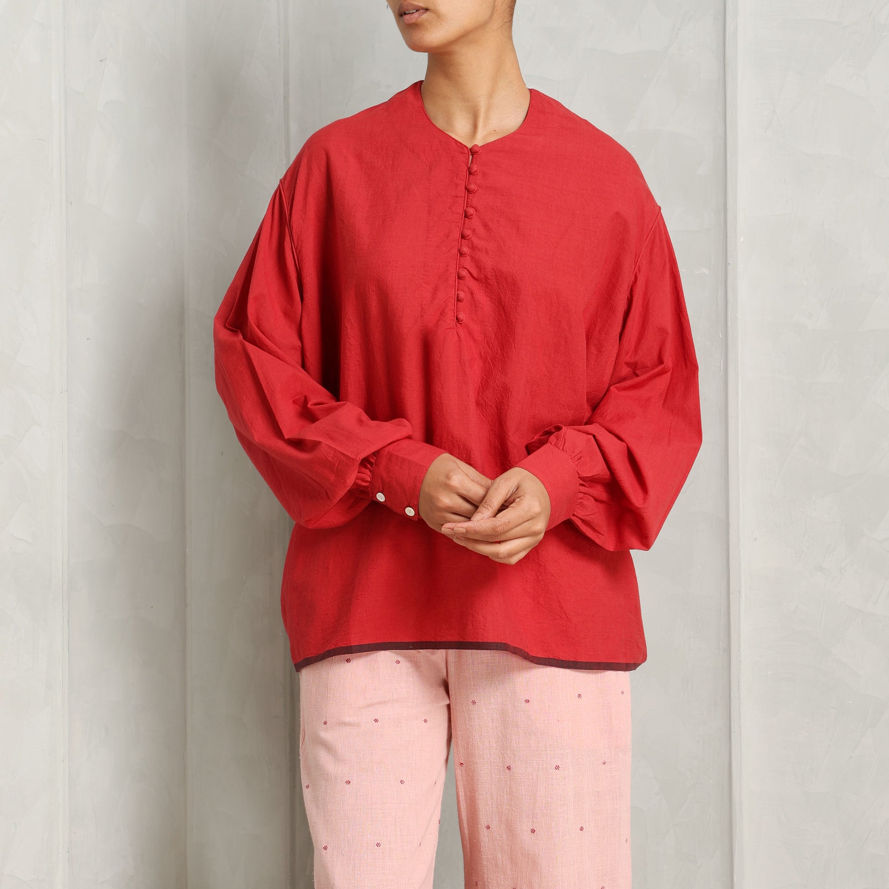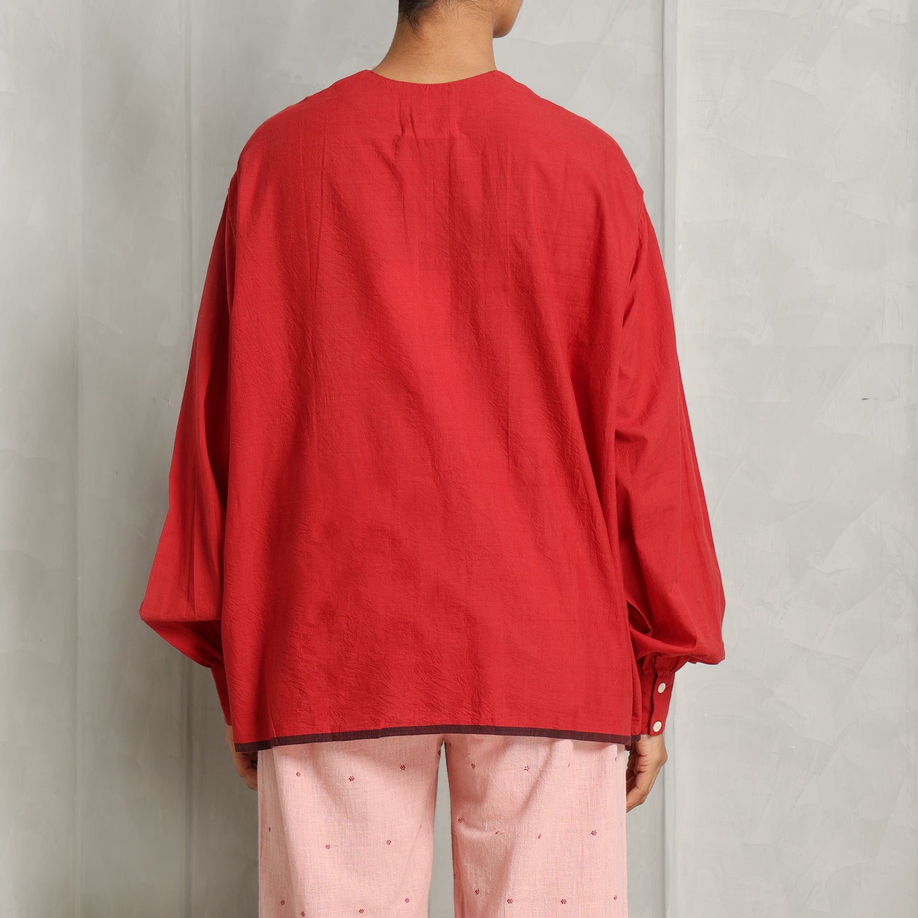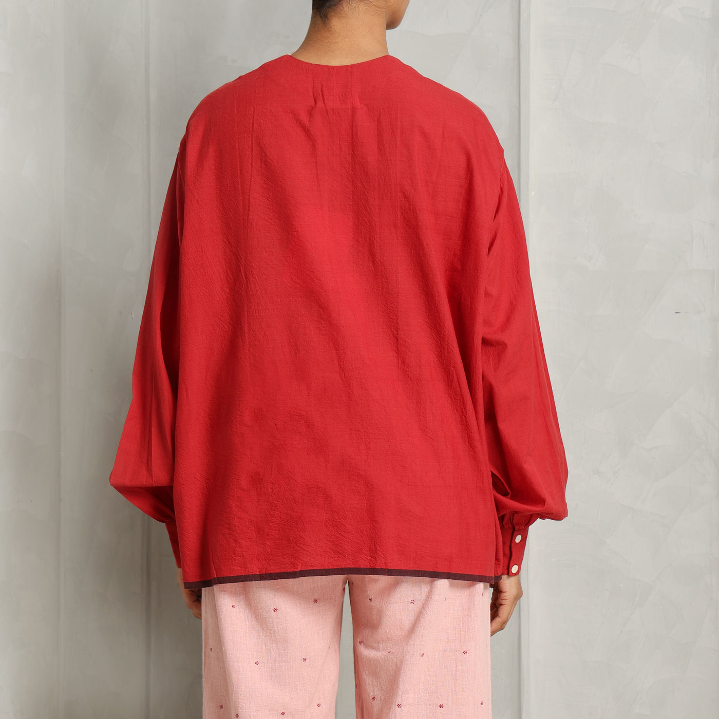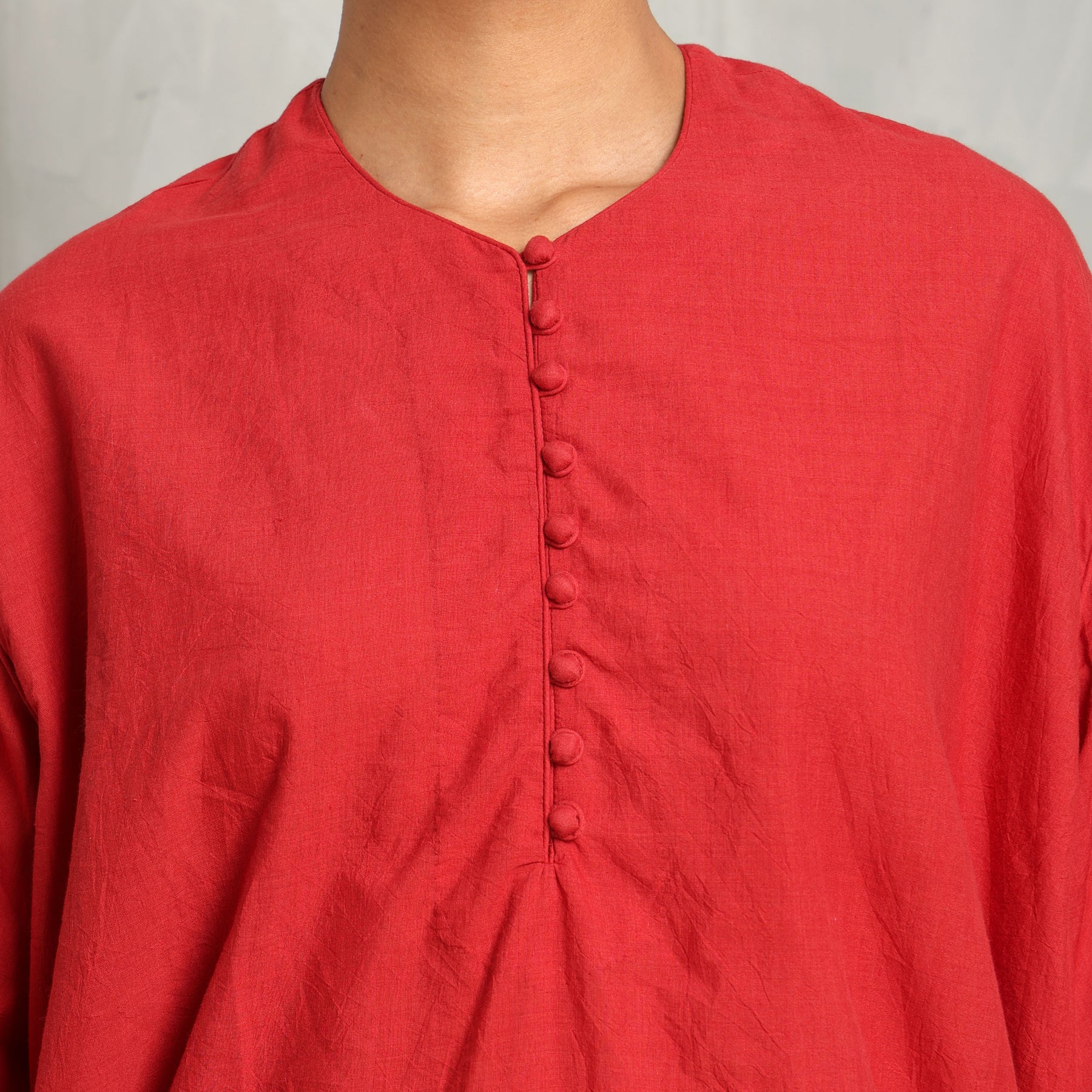 Introducing Tokree's Maya Top - a hand spun cotton shirt crafted in a vibrant red hue. This shirt features a relaxed silhouette, handmade fabric buttons, and a detailed cuff. From day-to-night, this shirt is perfectly versatile for all occasions. Pair this with the Ren Pant from Tokree.