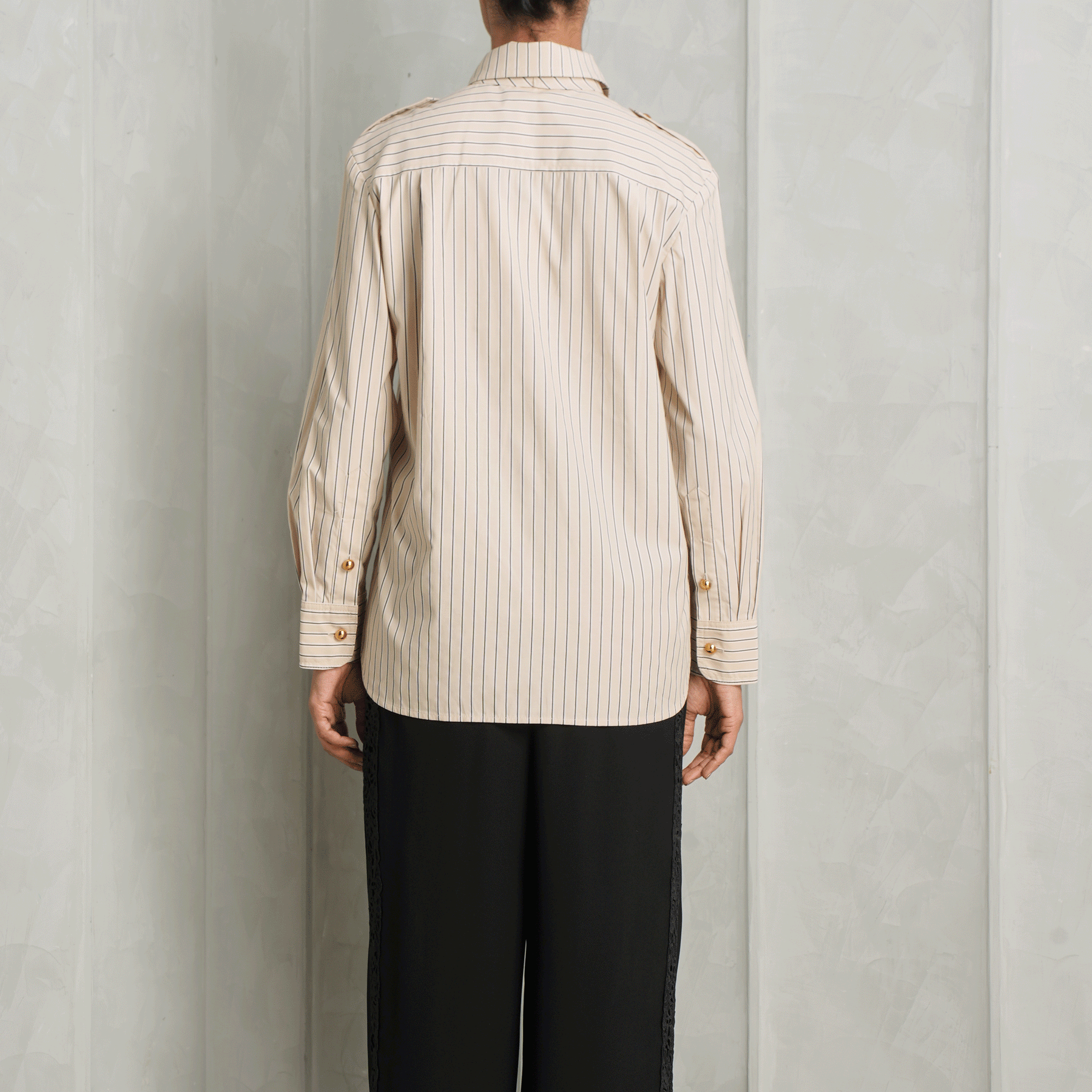 Zimmermann’s Memento Utility Stripe Shirt offers a contemporary interpretation of classic utility. Tailored in soft striped fabric, it features a sharp collar, flap chest pockets, and functional gold buttons along the front. A removable self-tie necktie adds a touch of feminine polish, while long sleeves with buttoned cuffs and an asymmetrical hem lend structure and fluidity in equal measure. Elevate your look with Mini Puzzle Edge Bag from Loewe.
