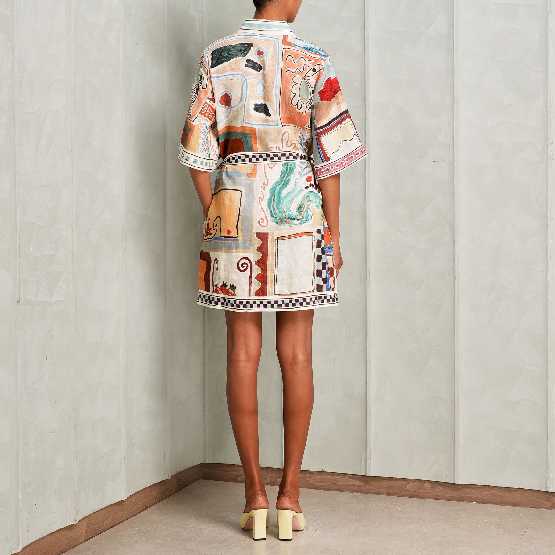 The Michelle Mini Dress from Alemais, created in collaboration with artist Laurence Leenaert, features a straight mini shirtdress silhouette with a pointed collar and stand. Cropped sleeves and a concealed placket with self-covered buttons create a clean, refined finish, while in-seam pockets and a self-tie... Read more