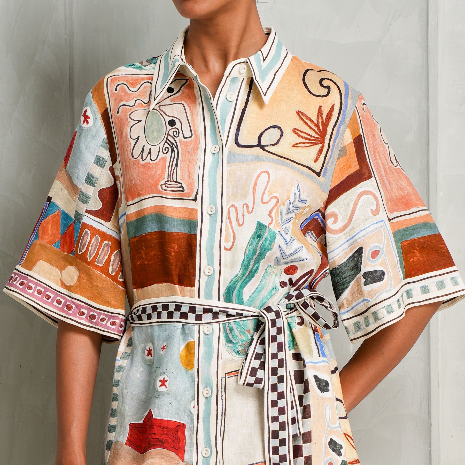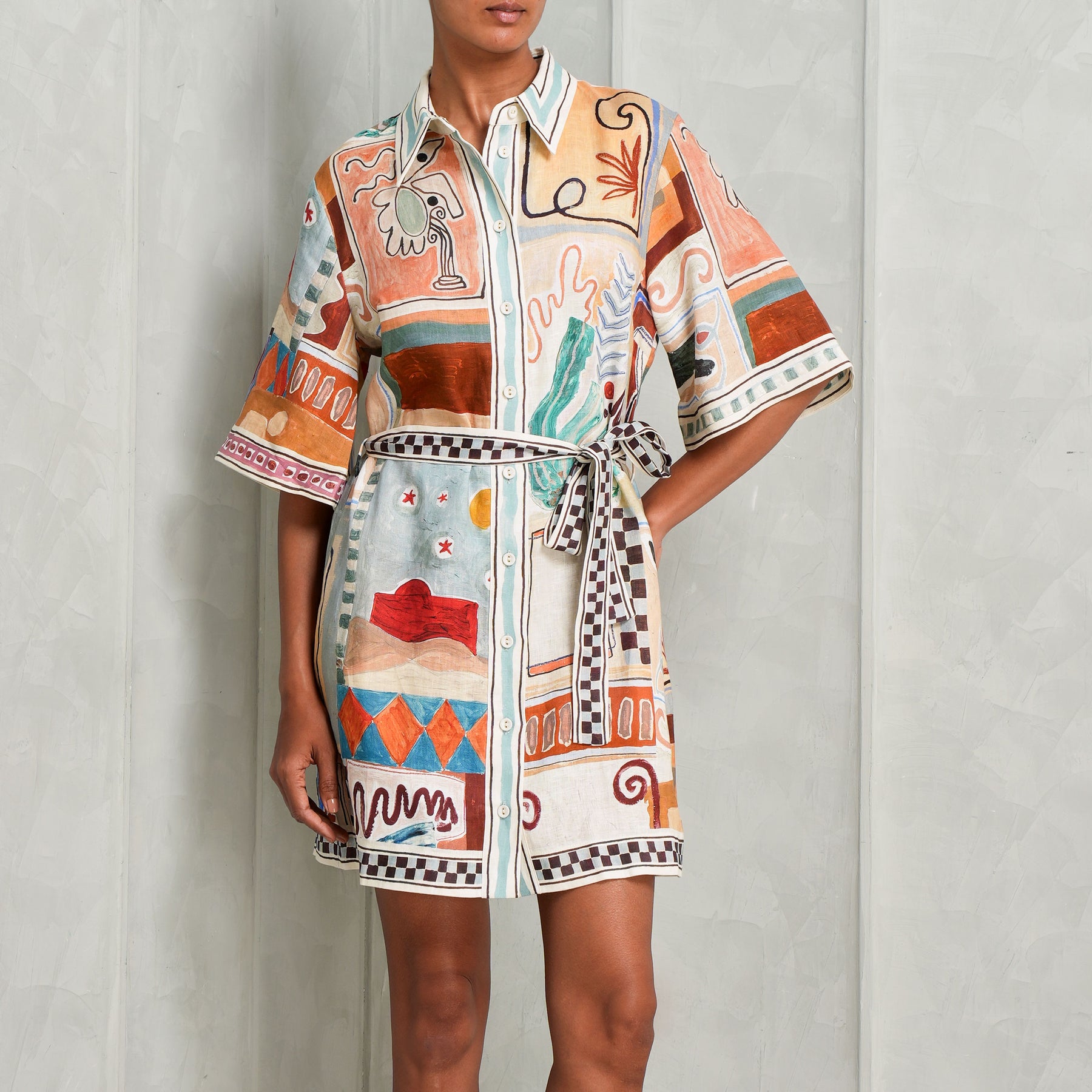 The Michelle Mini Dress from Alemais, created in collaboration with artist Laurence Leenaert, features a straight mini shirtdress silhouette with a pointed collar and stand. Cropped sleeves and a concealed placket with self-covered buttons create a clean, refined finish, while in-seam pockets and a self-tie belt add ease and versatility. Pair this with...