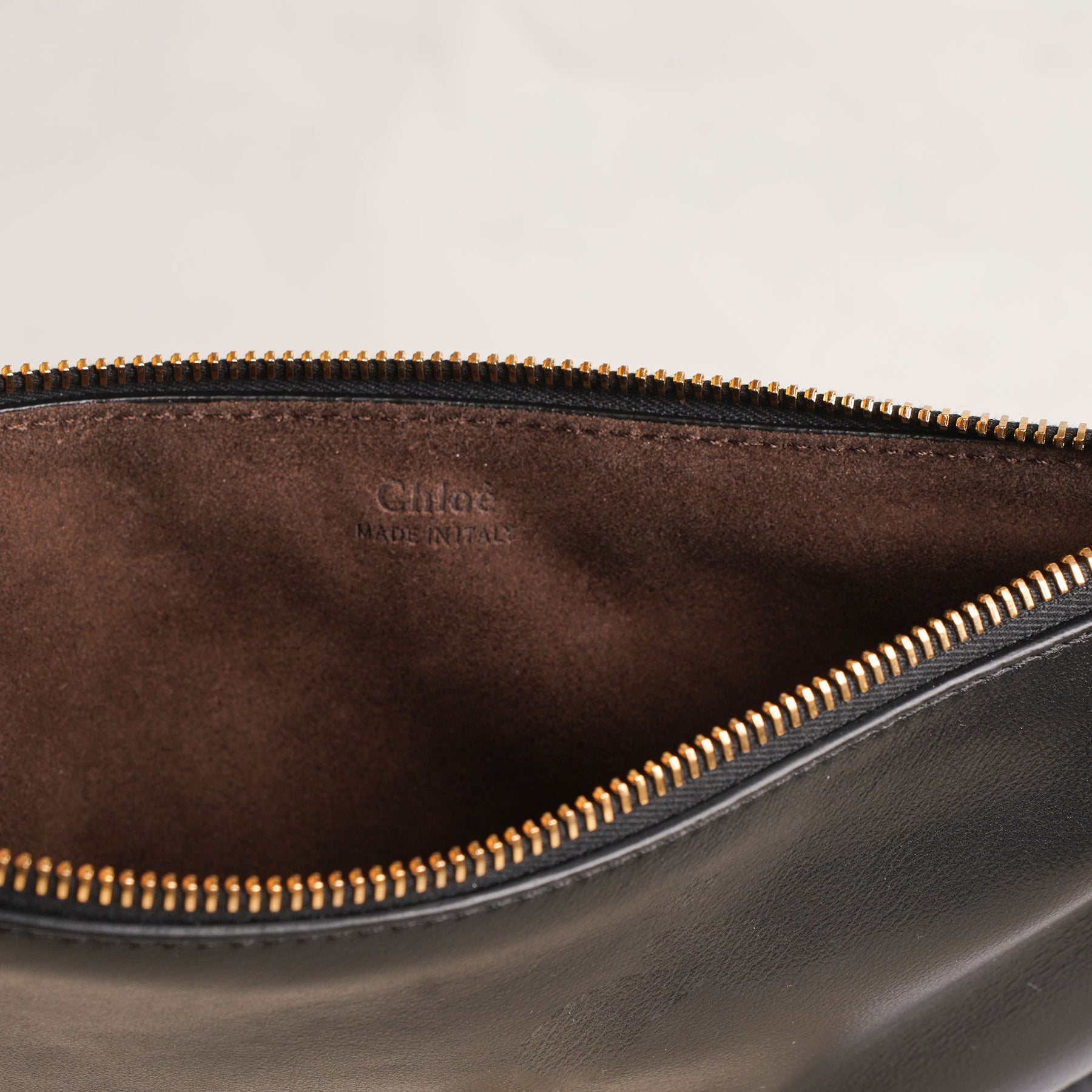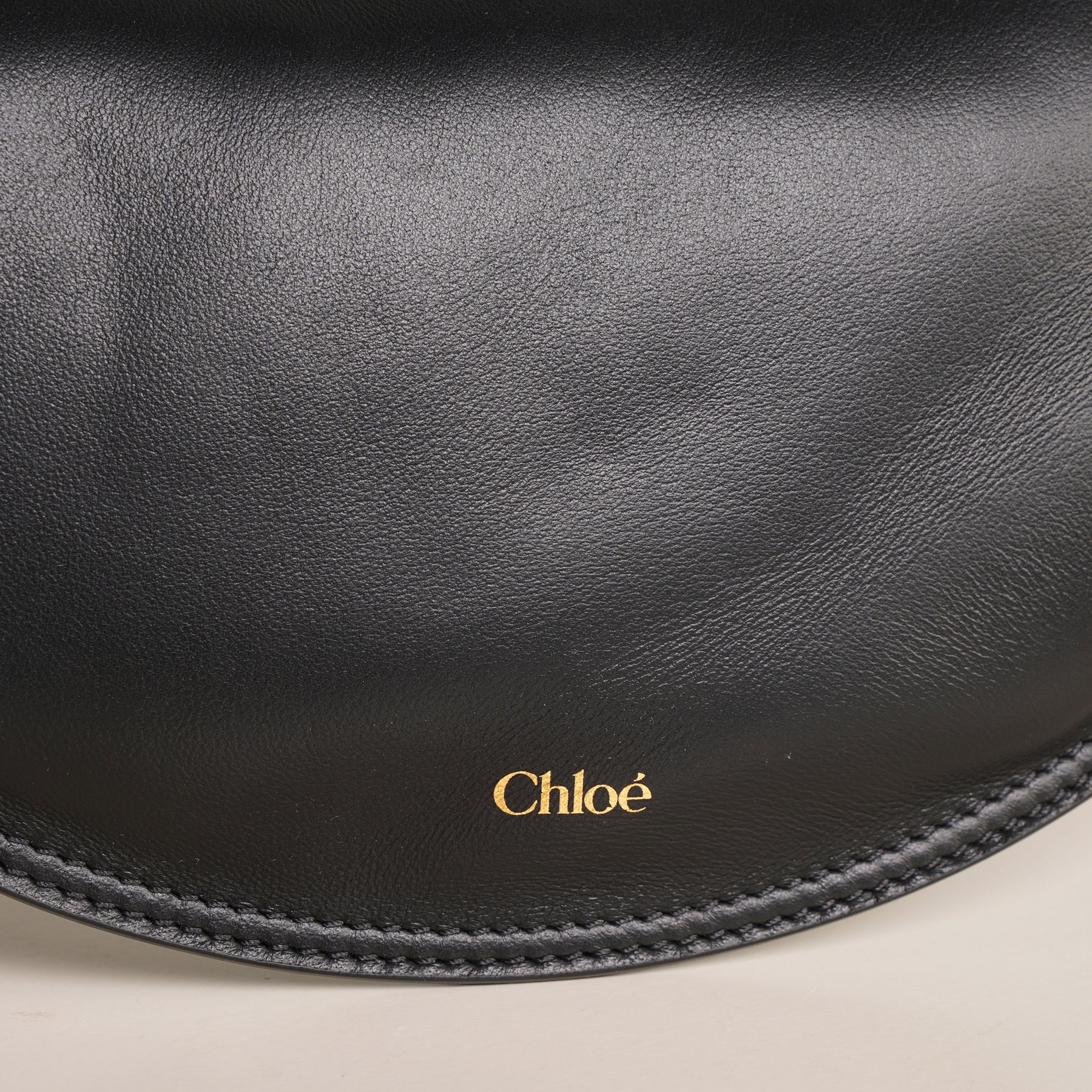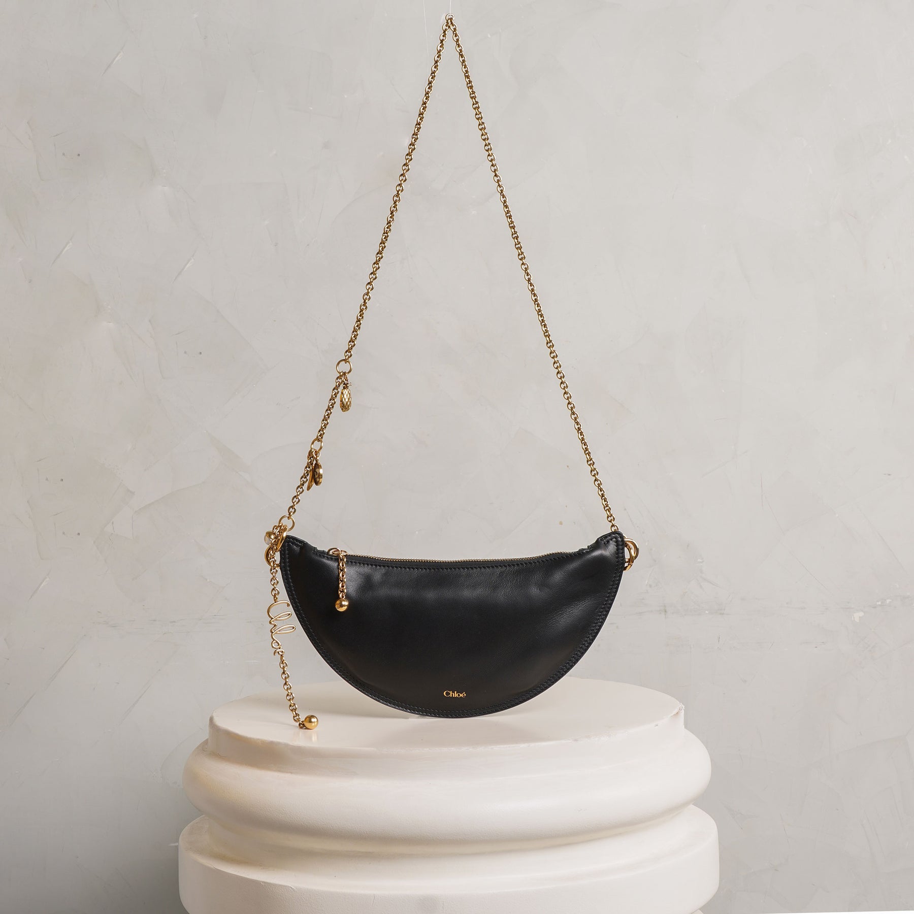 The Mini Chloé Icons Shoulder Bag is a sculptural take on the everyday bag. This piece is defined by its curved, half-moon silhouette and refined simplicity. Crafted in smooth black leather, it is suspended from a delicate gold-tone chain that adds just the right amount of contrast - soft yet striking. Compact yet considered, the design sits close to the body, making it ideal for evenings, intimate gatherings, or moments that call for quiet statement pieces. The structured form holds its shape beautifully, while the minimal finish allows it to transition effortlessly across looks. Understated, modern, and subtly bold - this is a bag that completes without overpowering.
