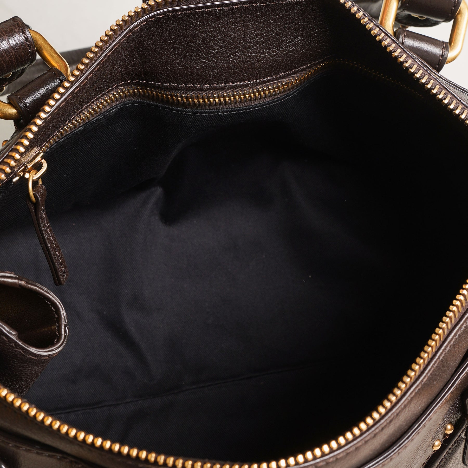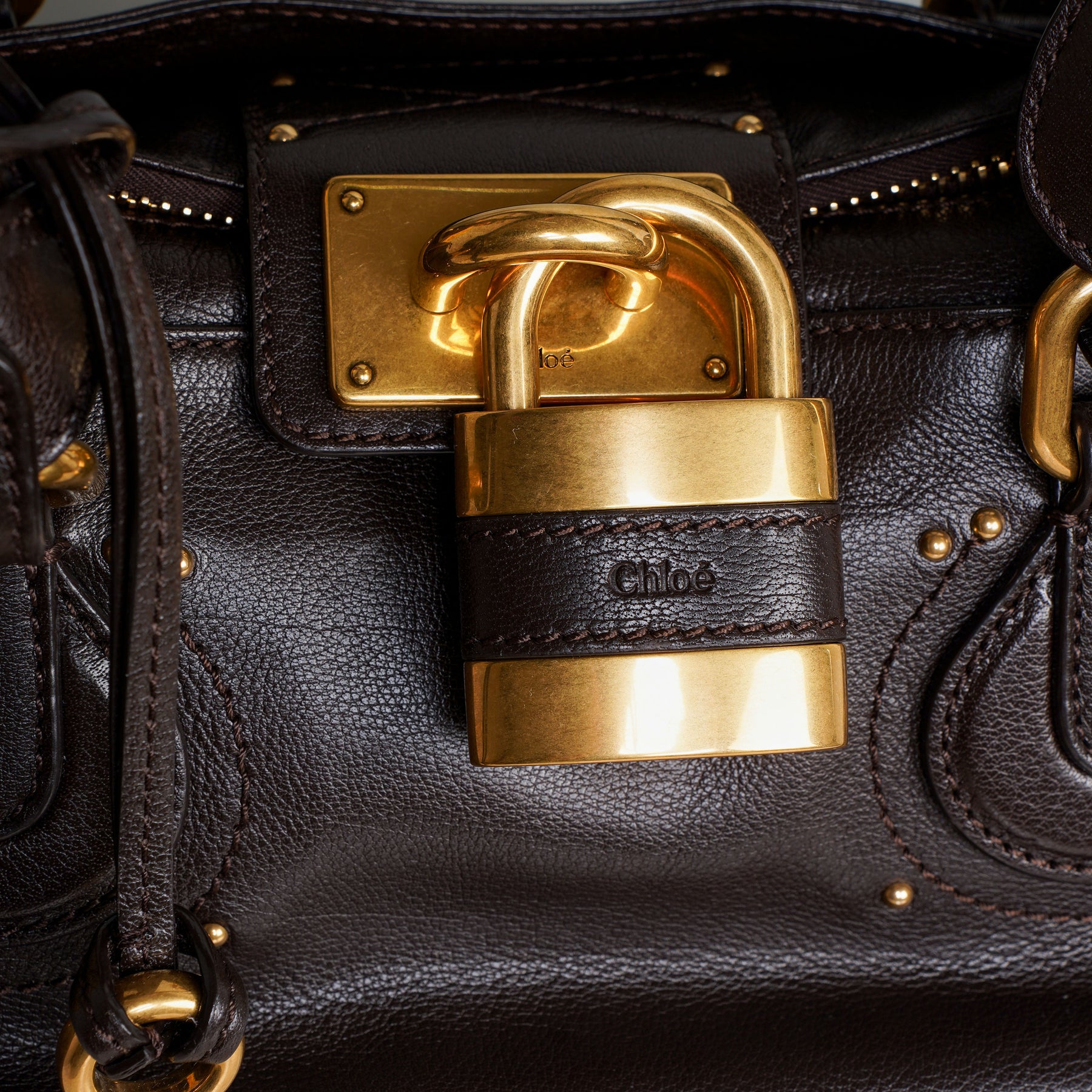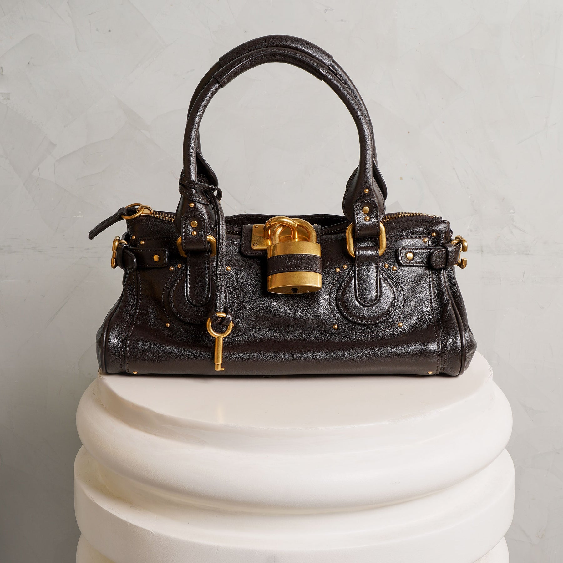 The Chloé Paddington Bag in kohl brown introduces a deeper, more grounded take on the iconic silhouette - rich in tone, yet effortlessly wearable. Rendered in grained buffalo leather, the piece carries a naturally relaxed structure that drapes with ease while maintaining its presence. The design has been refined for everyday fluidity, with a single zip opening that allows for smooth, uncomplicated access. Distinctive hardware elements, including the statement padlock and curved buckle accents add a bold, recognisable edge against the dark, earthy hue. Finished with considered interiors and dual carry options, it’s a piece that feels both enduring and current.
