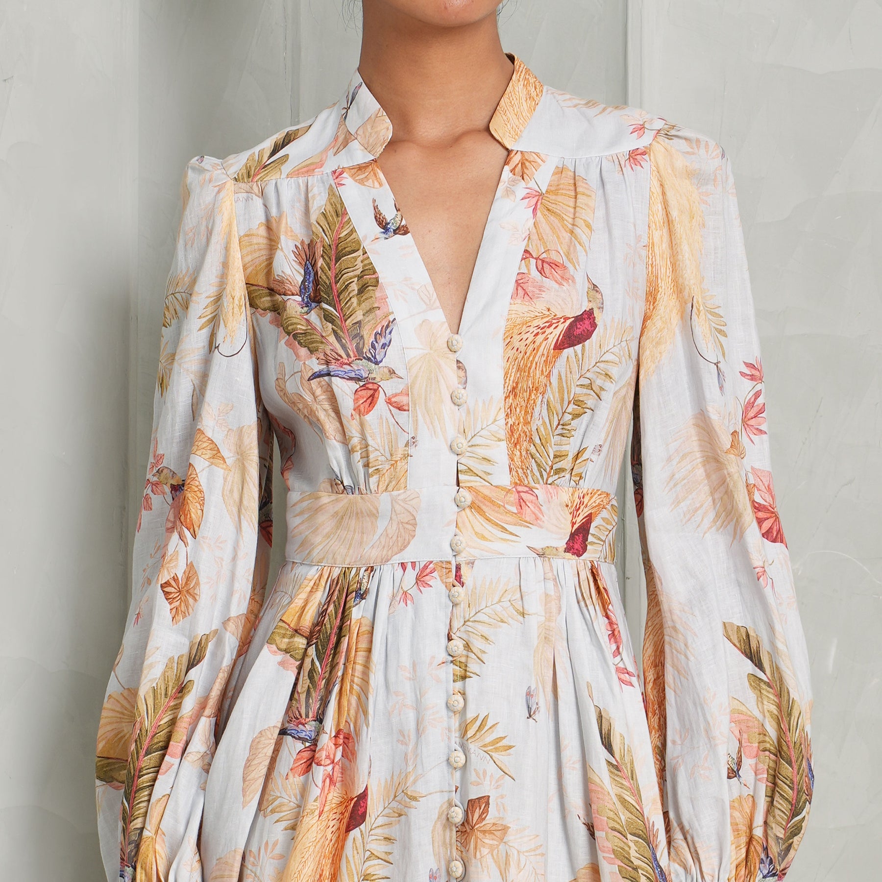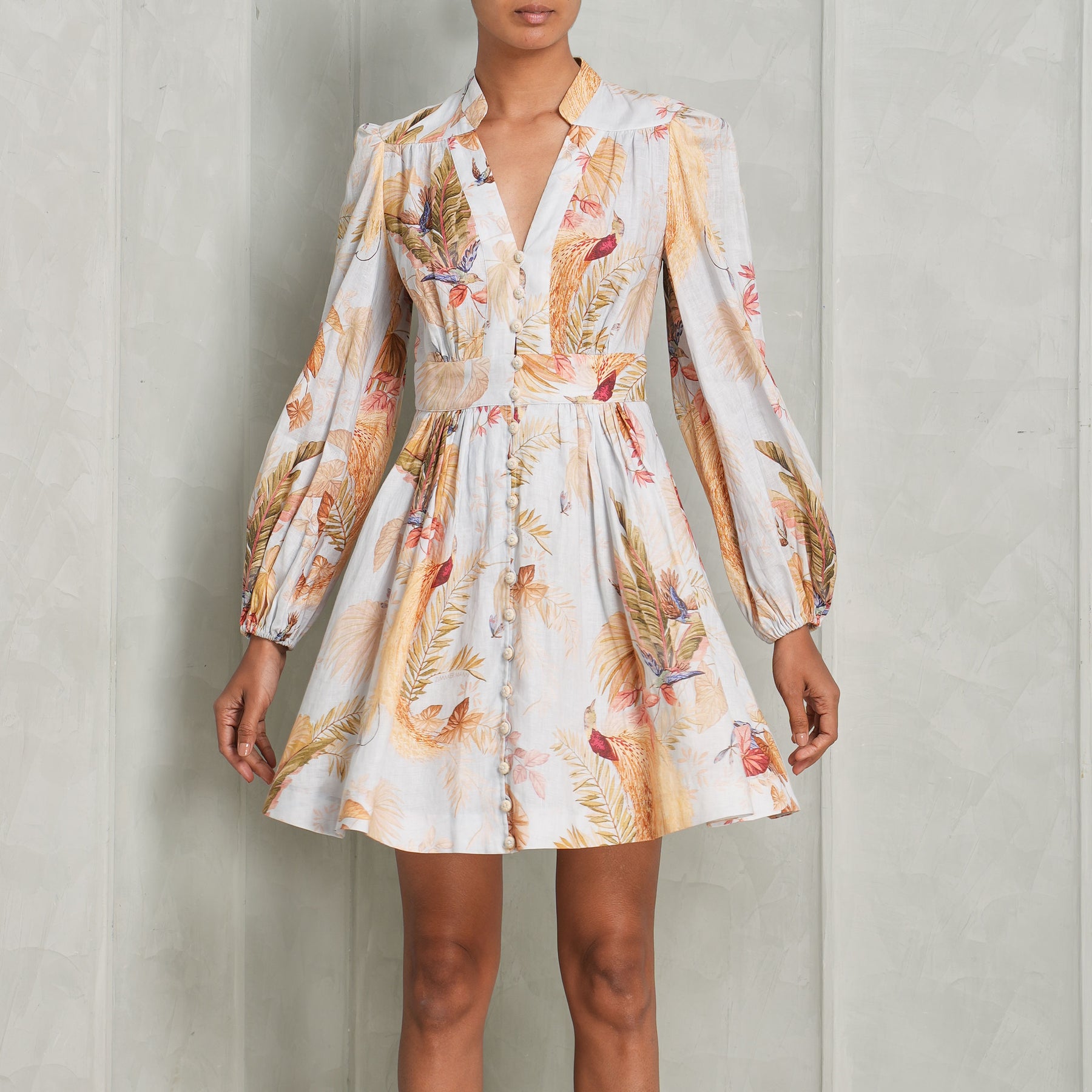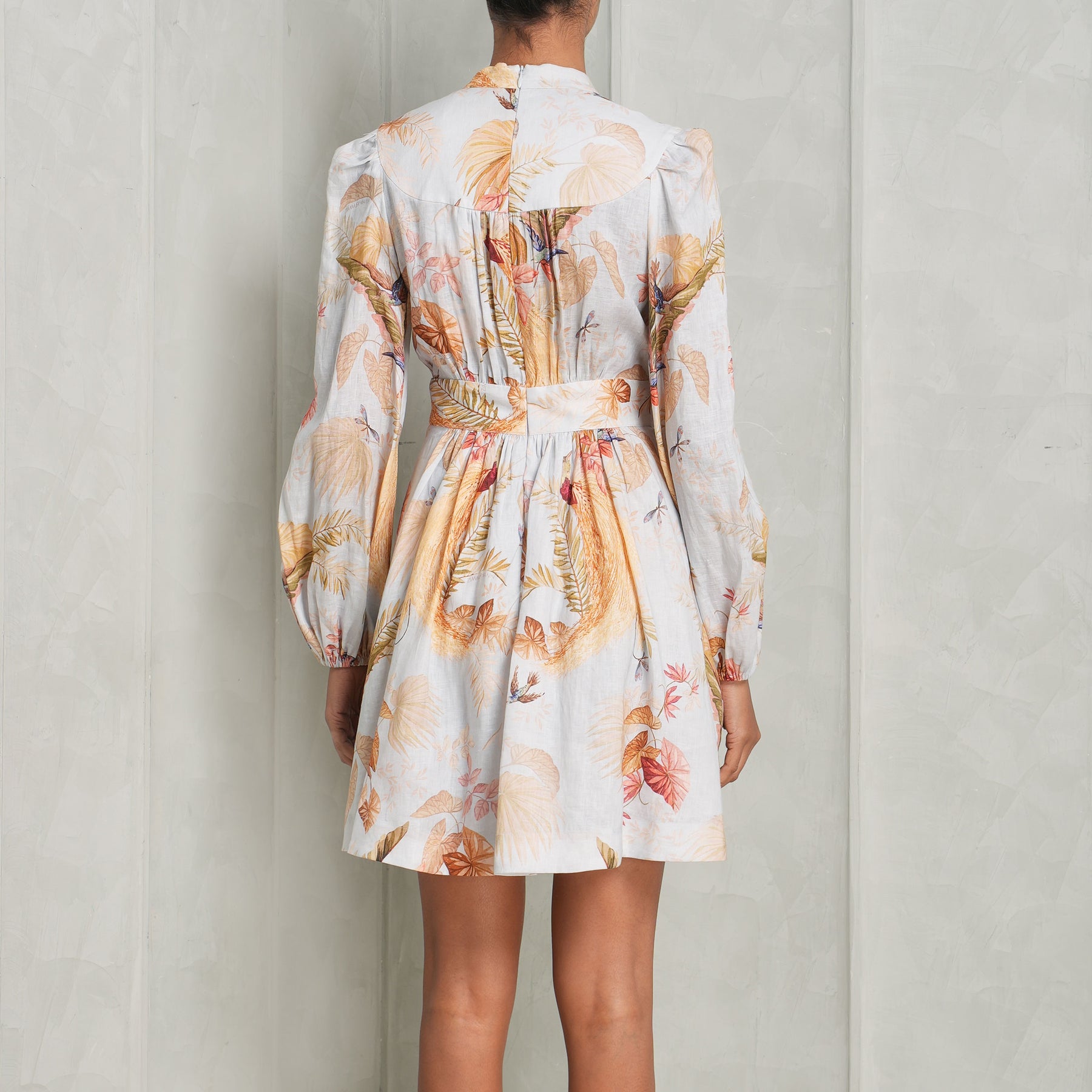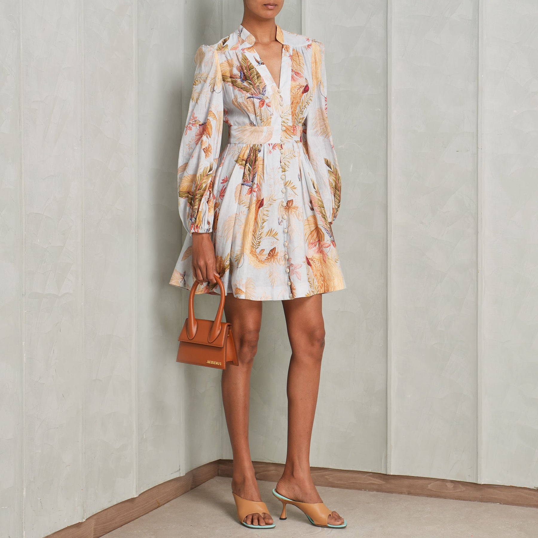 Palm Floral Ascension Plunge Mini Dress is a romantic silhouette, shaped by lightness and detail. This Zimmermann dress unfolds with a softly plunging neckline, a buttoned front, and a gently cinched waist that gives way to fluid movement. Finished with billowed sleeves and a painterly palm-inspired print, it feels considered yet effortless.