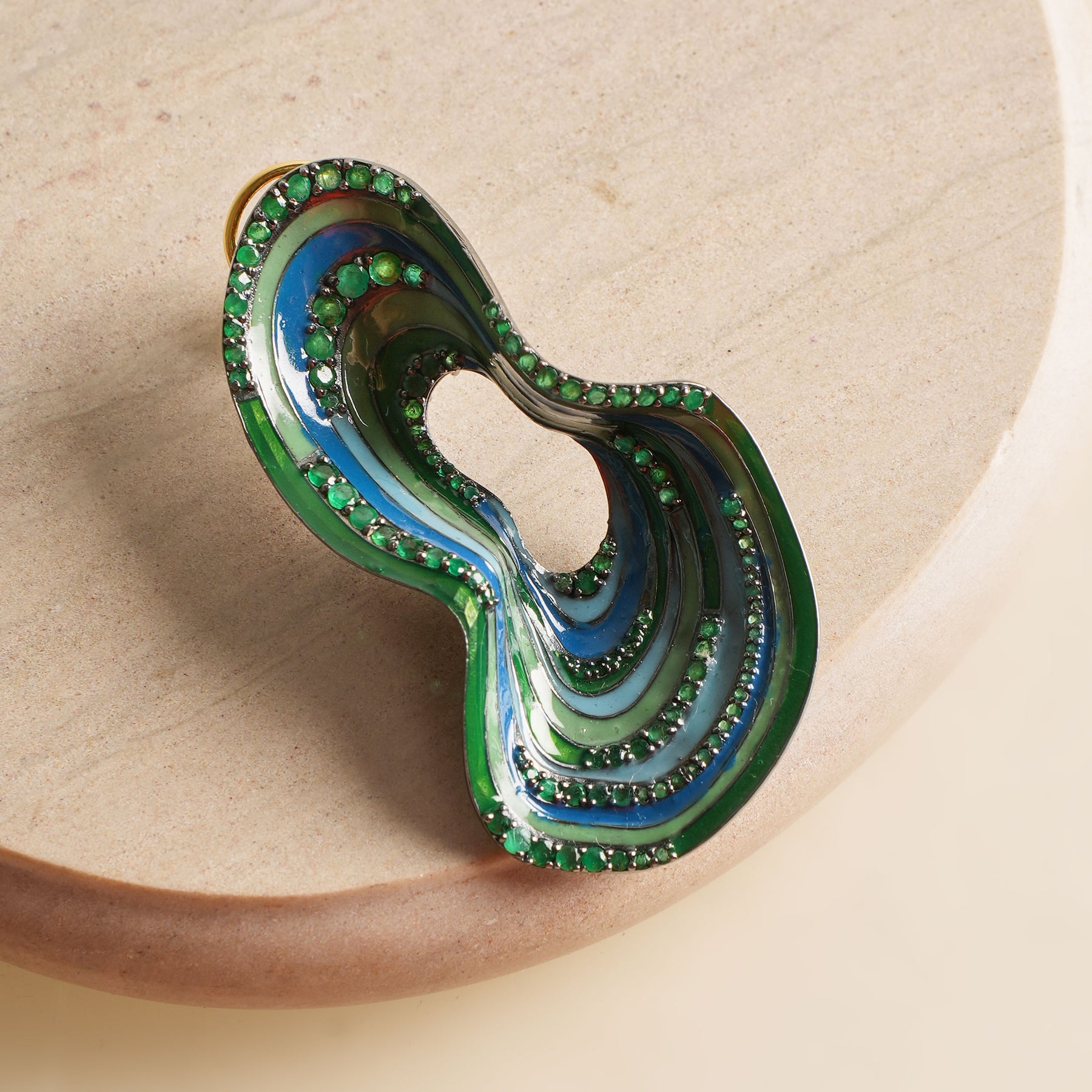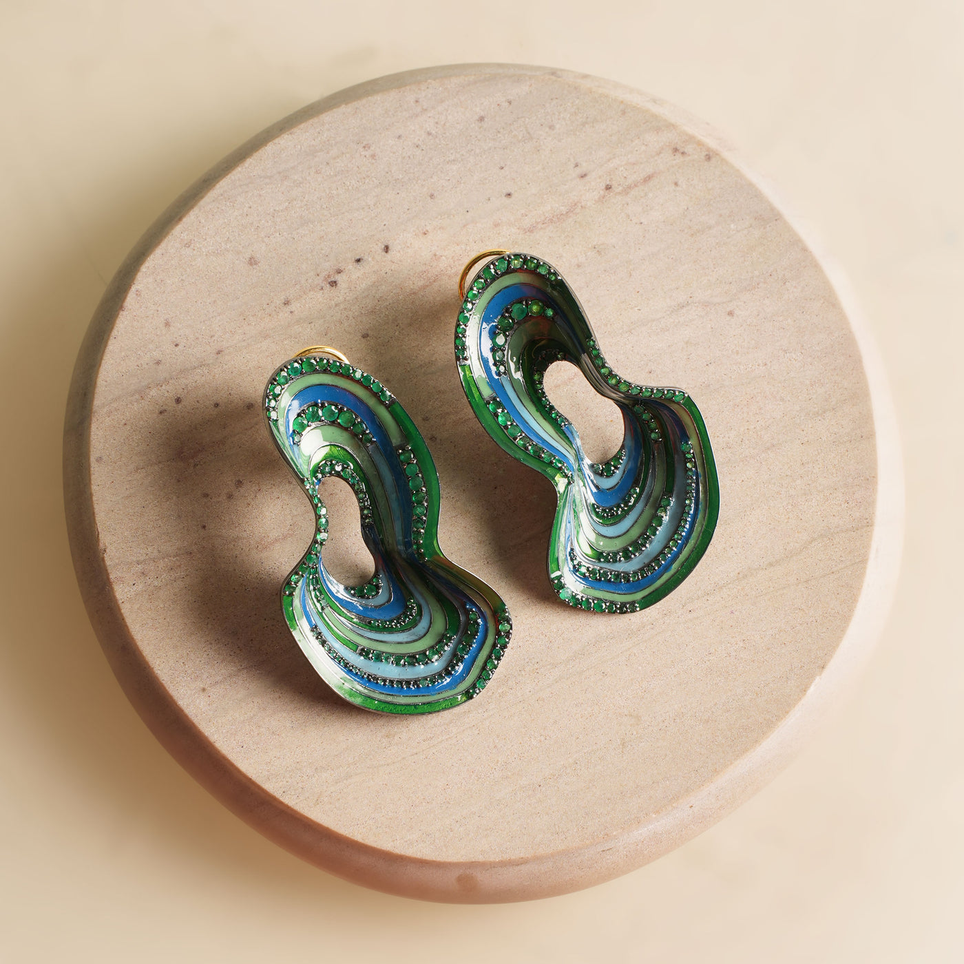 The Resonance Earrings from Estaa are crafted in layered tones of green and blue and feature a fluid silhouette. The green exudes a grounding energy, while the blue offers balance and steadiness. The two hues form a visual rhythm that reflects the natural flow of breath and water. Lightweight and sculptural, these earrings evoke a sense of calm movement and emotional clarity.