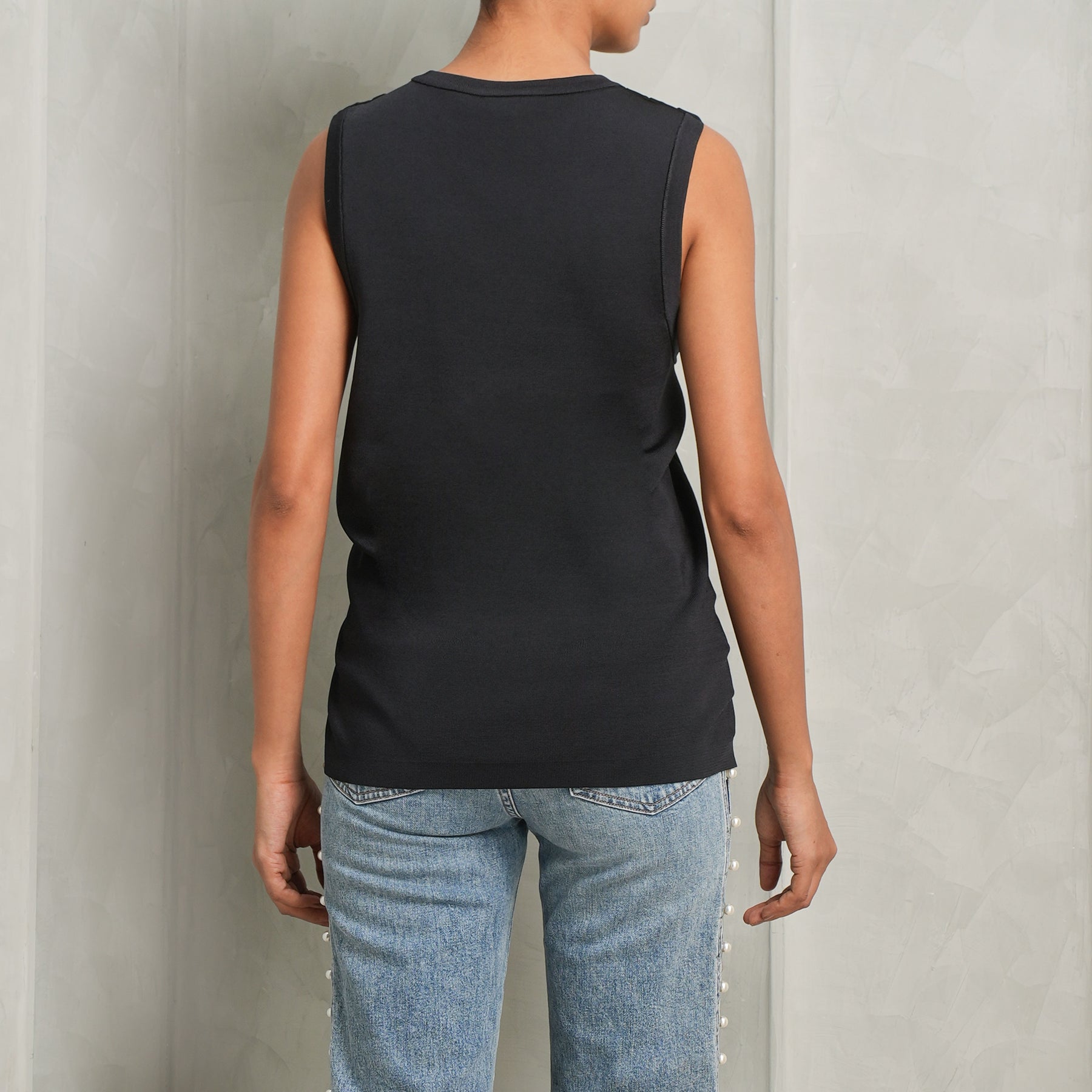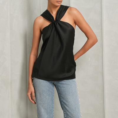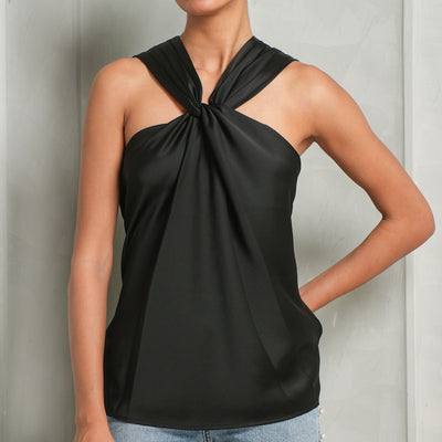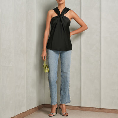Meet the Ria Top from Simkhai - a classic elevated piece. This sleeveless top is crafted from a blend of knit and satin textures and features a knotted drape detail. With a contemporary twist and bold charm, this top is a perfectly versatile piece. Pair this top with Simkhai's Amelia Pearl Embellished Jean and Chiquito Long Bag by Jacquemus.