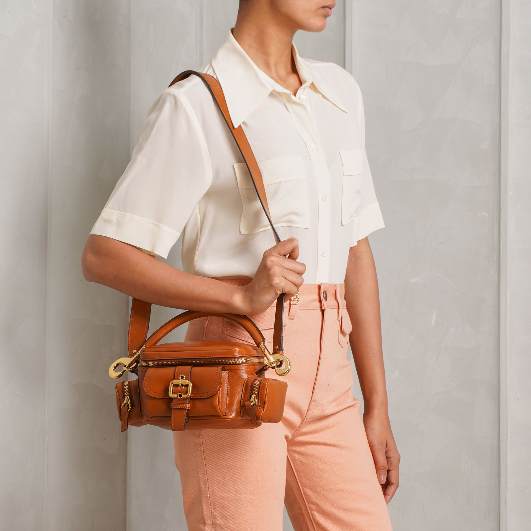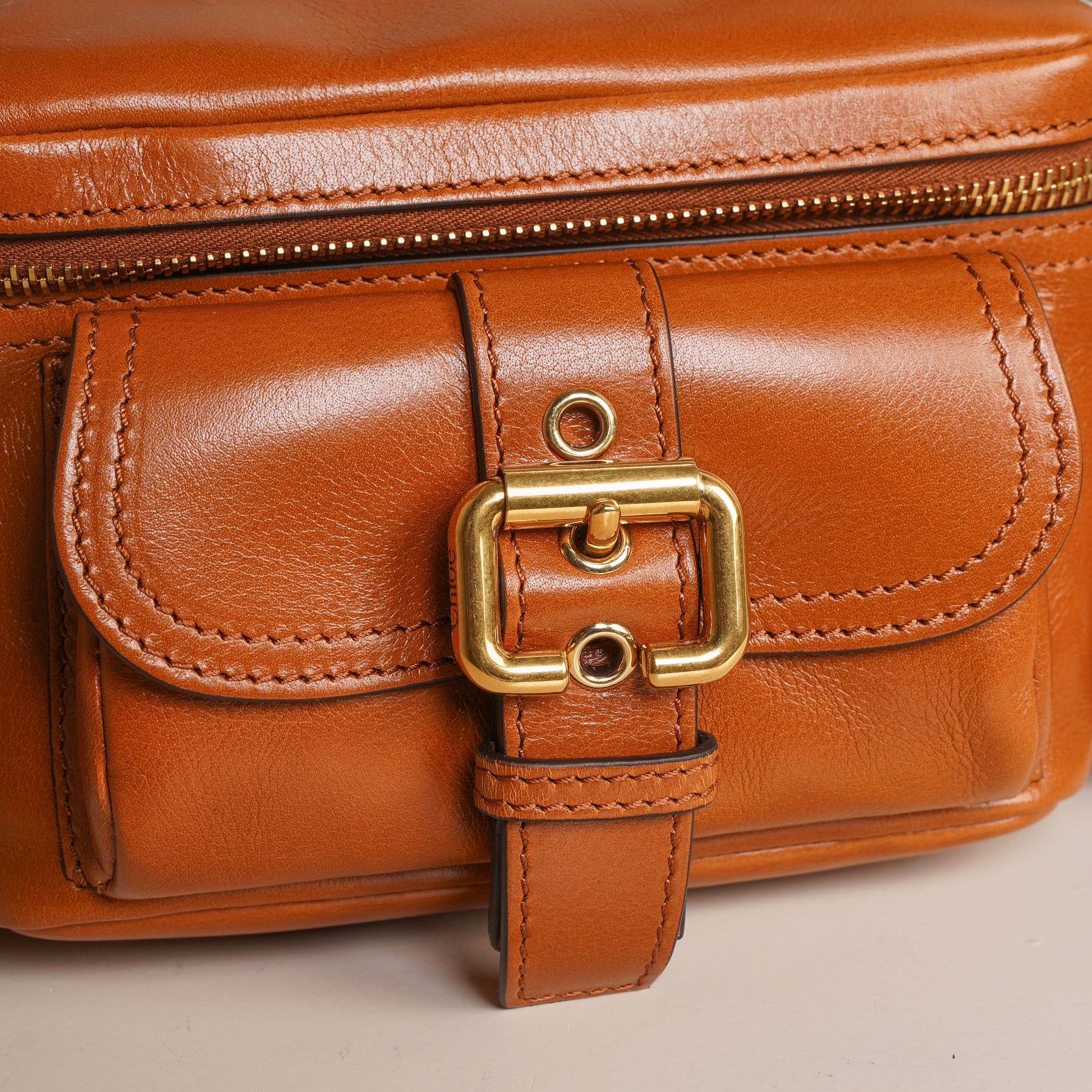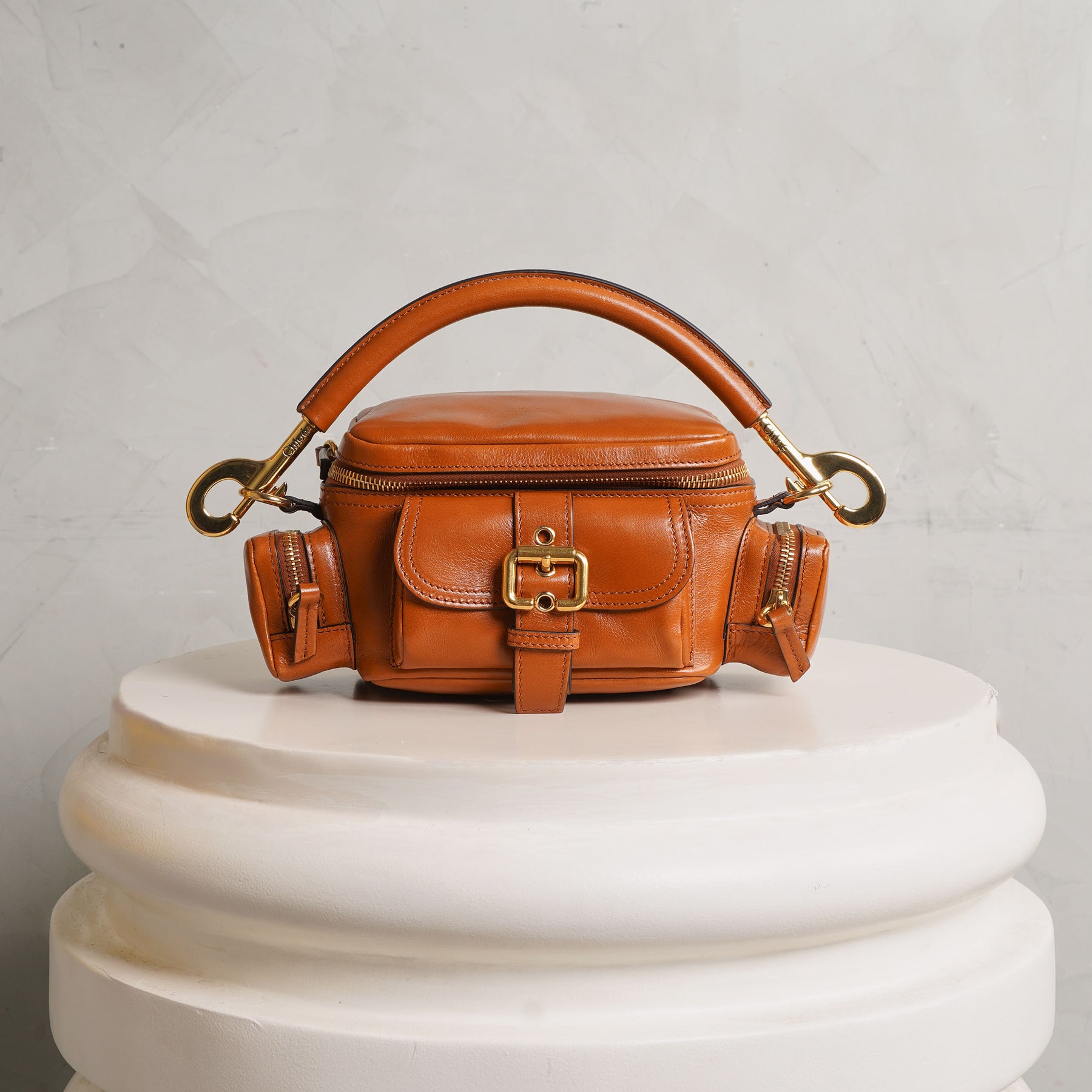 Introducing the Chloé Small Camera Bag - a study in refined structure, this compact top-handle bag is crafted in rich brown leather with a softly sculpted silhouette. The front is defined by a statement buckle detail, balanced with subtle gold-tone hardware that adds quiet polish. Designed with both a top handle and a detachable strap, it transitions effortlessly from hand-held to crossbody. A piece that feels considered, timeless, and made for everyday elevation.