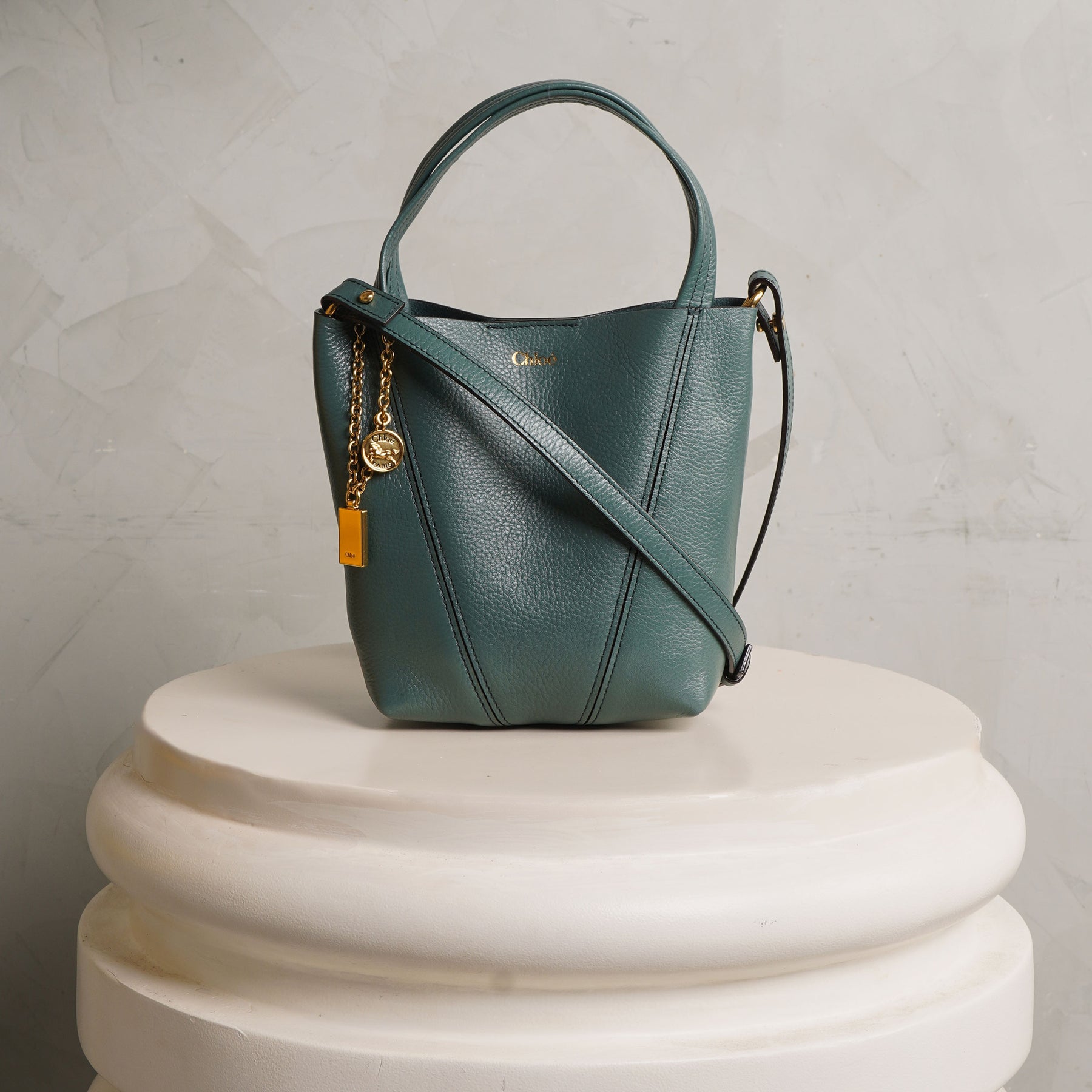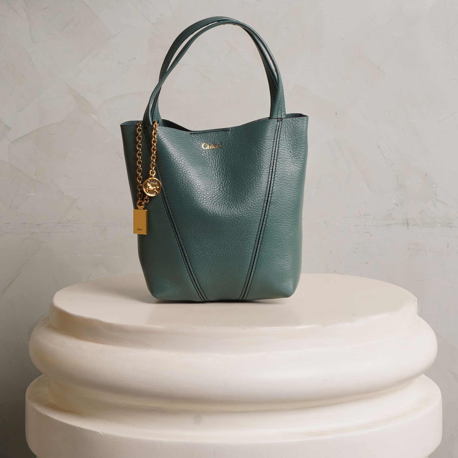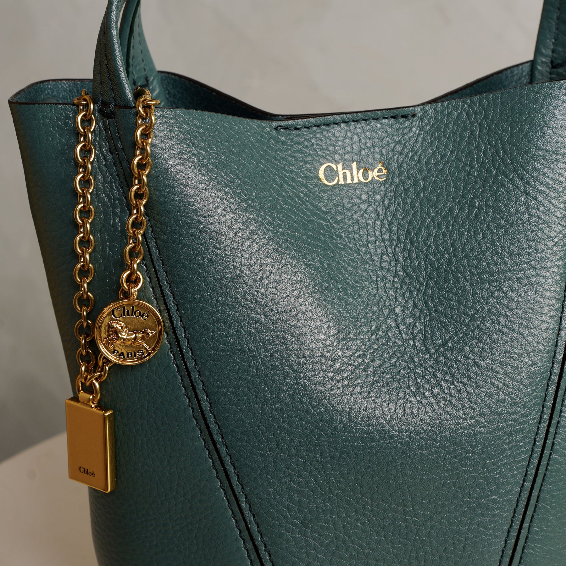 The Small Chloé Spin Tote Bag in blue offers a fresh, modern take on the minimalist design. The shiny grained cowhide enhances its sharp, graphic shape, while the signature chain detail introduces a refined accent. Designed for flexibility, it features double handles and a removable strap, allowing it to be worn on the shoulder, crossbody, or carried by hand with ease.