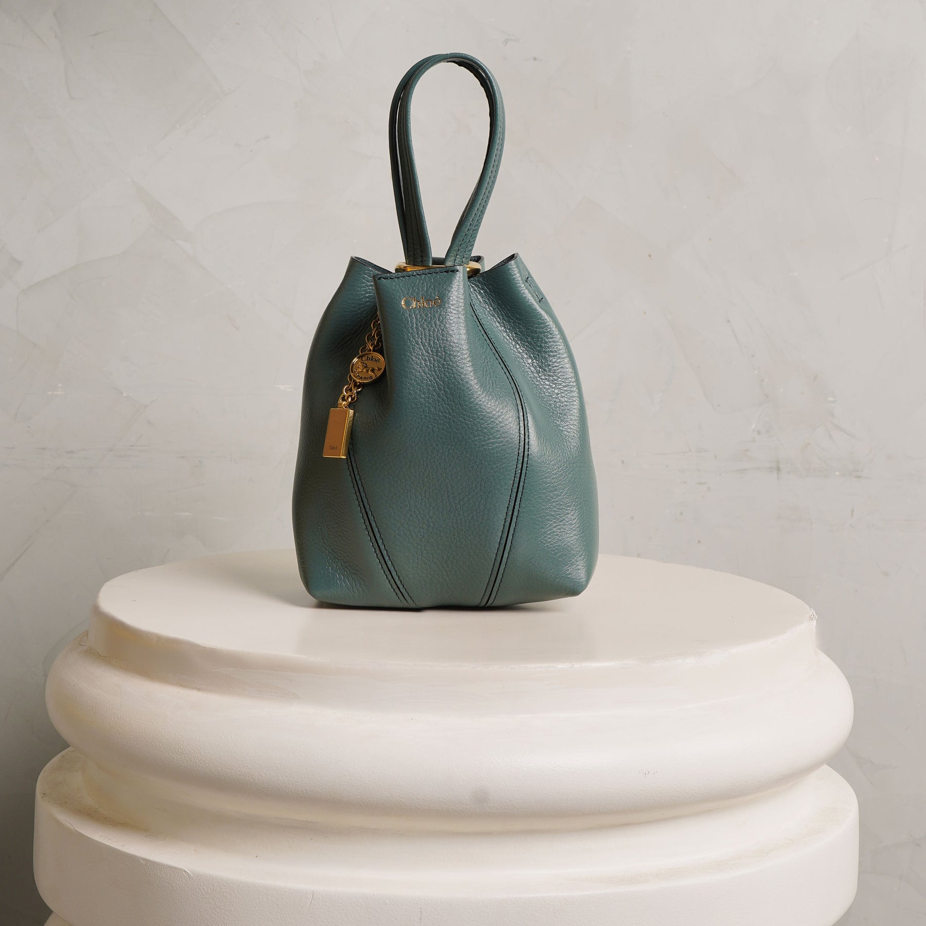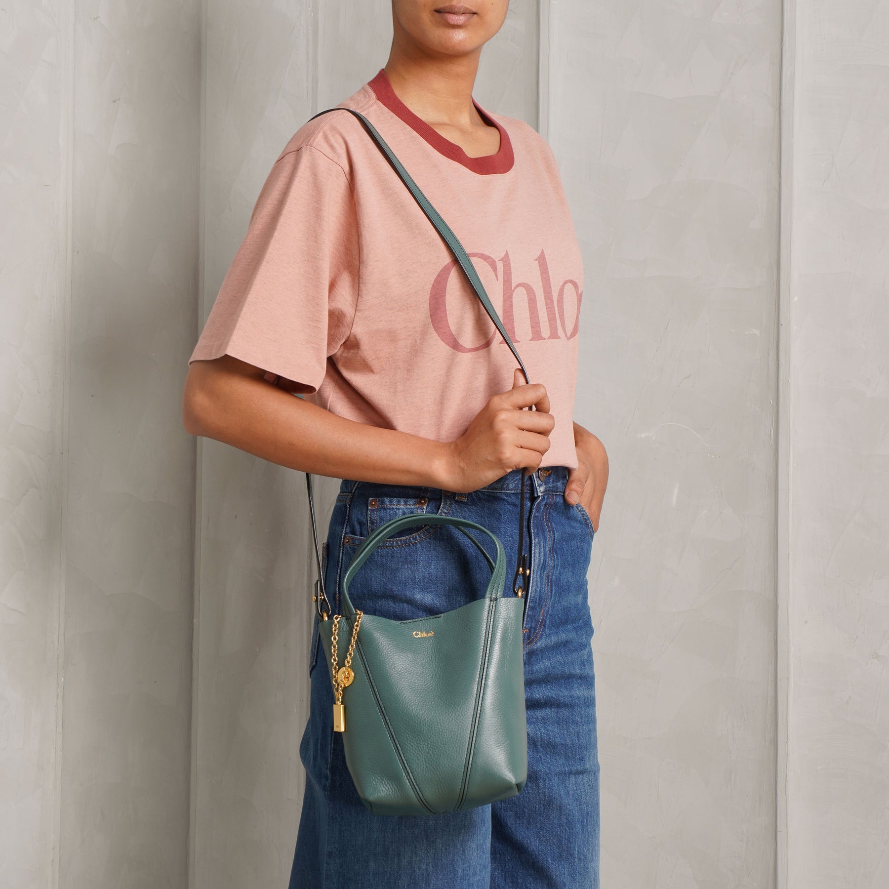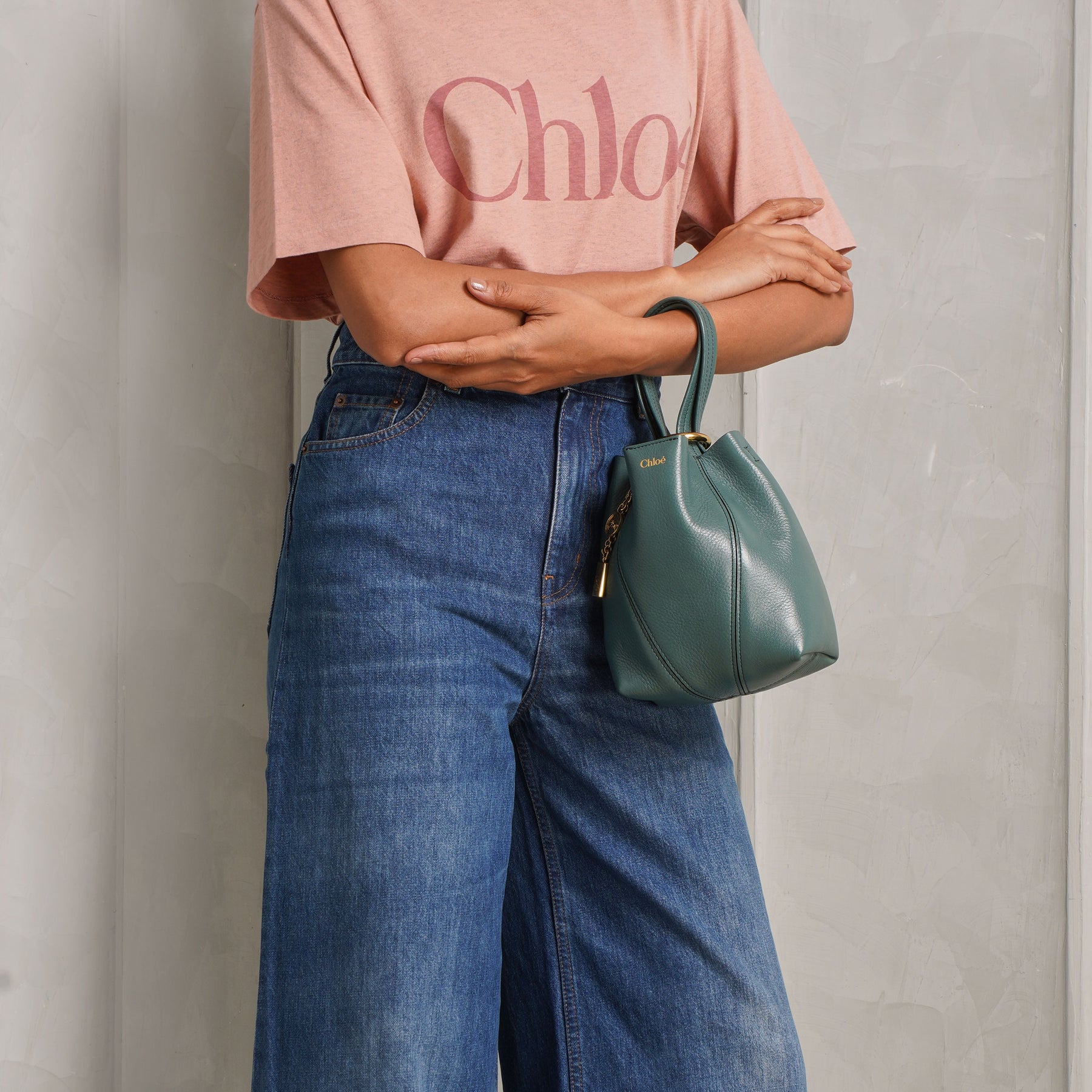 The Small Chloé Spin Tote Bag in blue offers a fresh, modern take on the minimalist design. The shiny grained cowhide enhances its sharp, graphic shape, while the signature chain detail introduces a refined accent. Designed for flexibility, it features double handles and a removable strap, allowing it to be worn on the shoulder, crossbody, or carried by hand with ease.