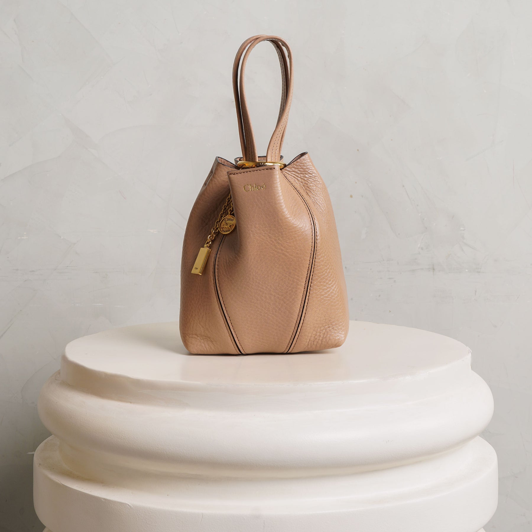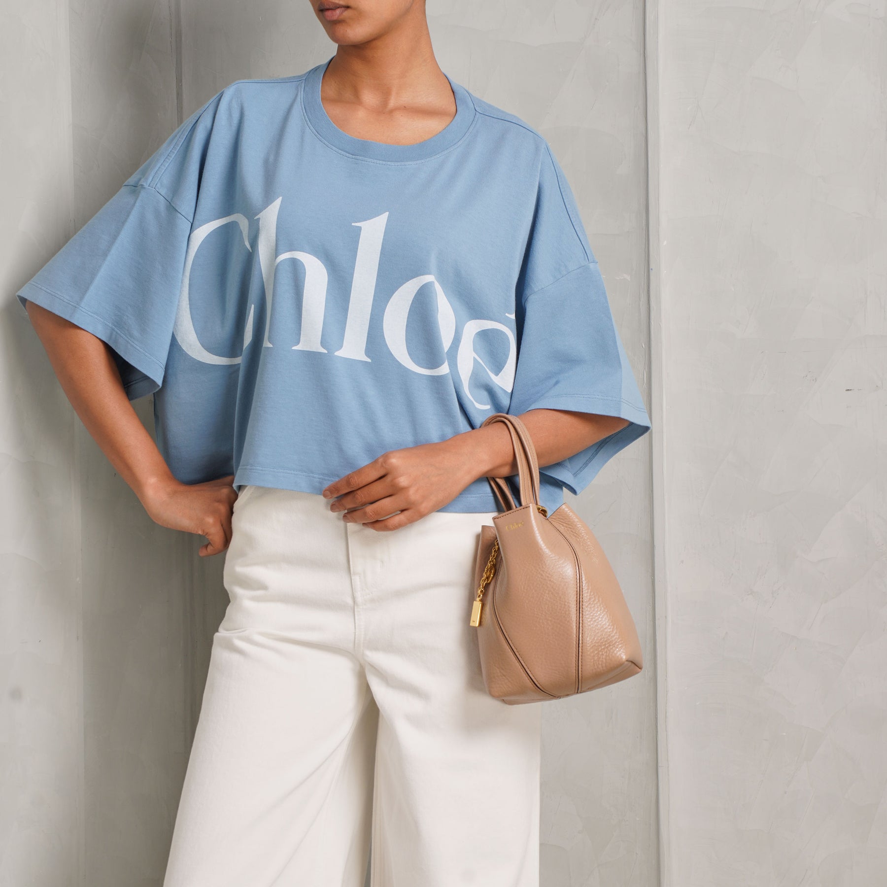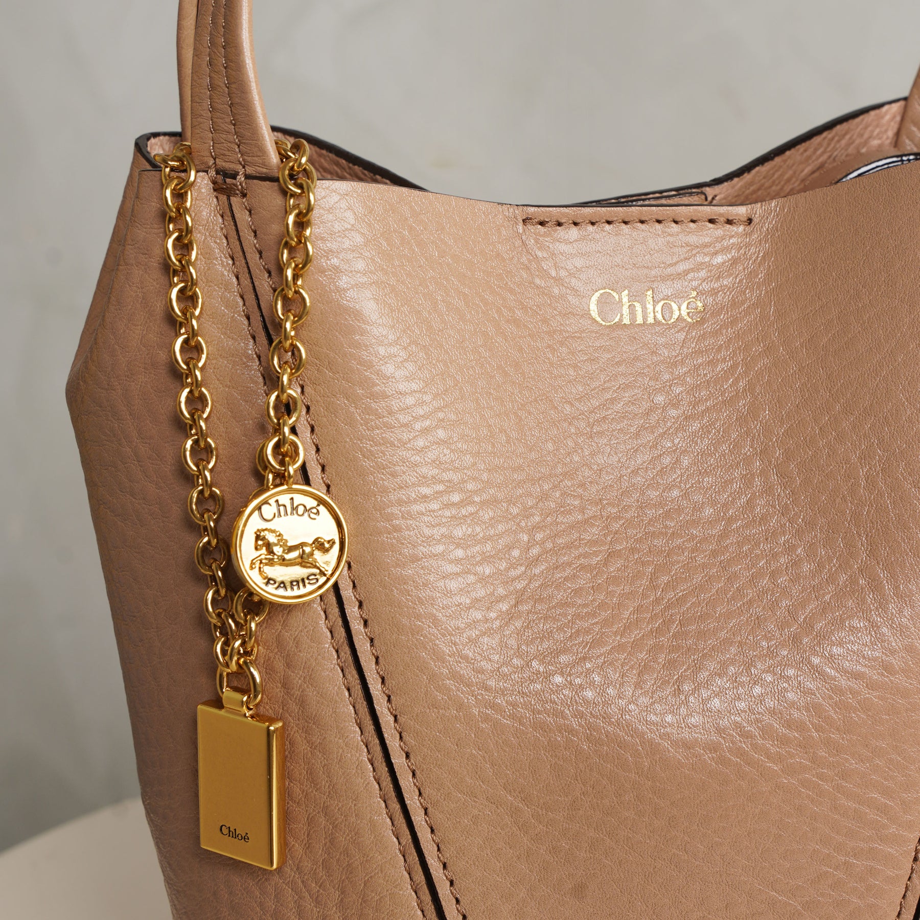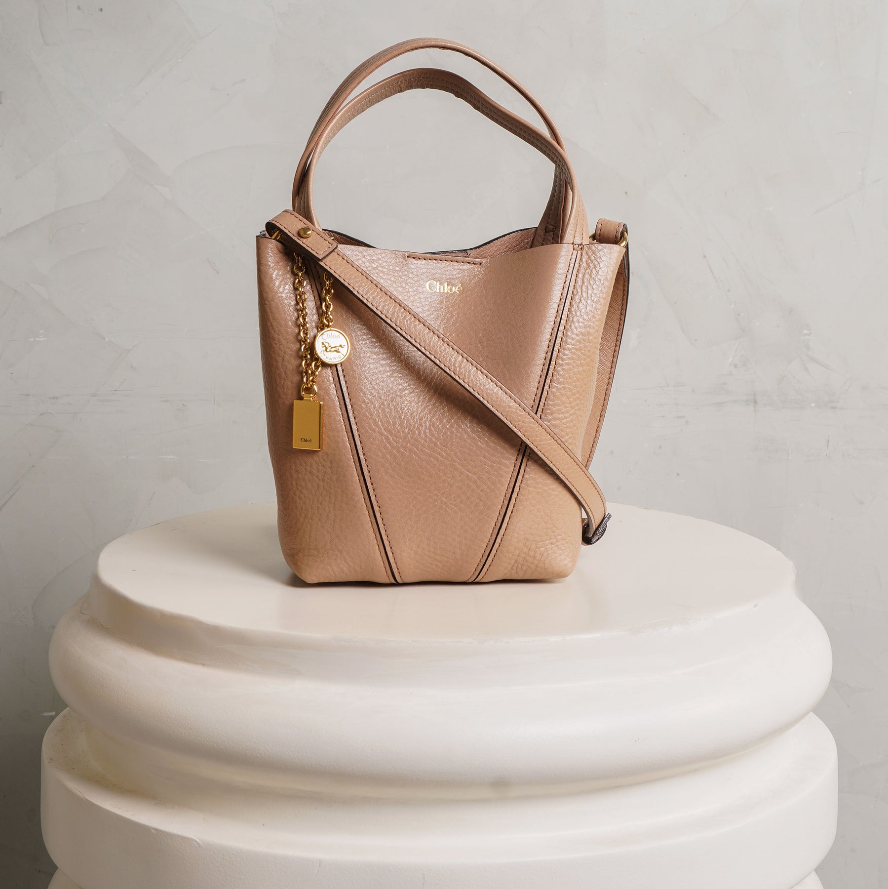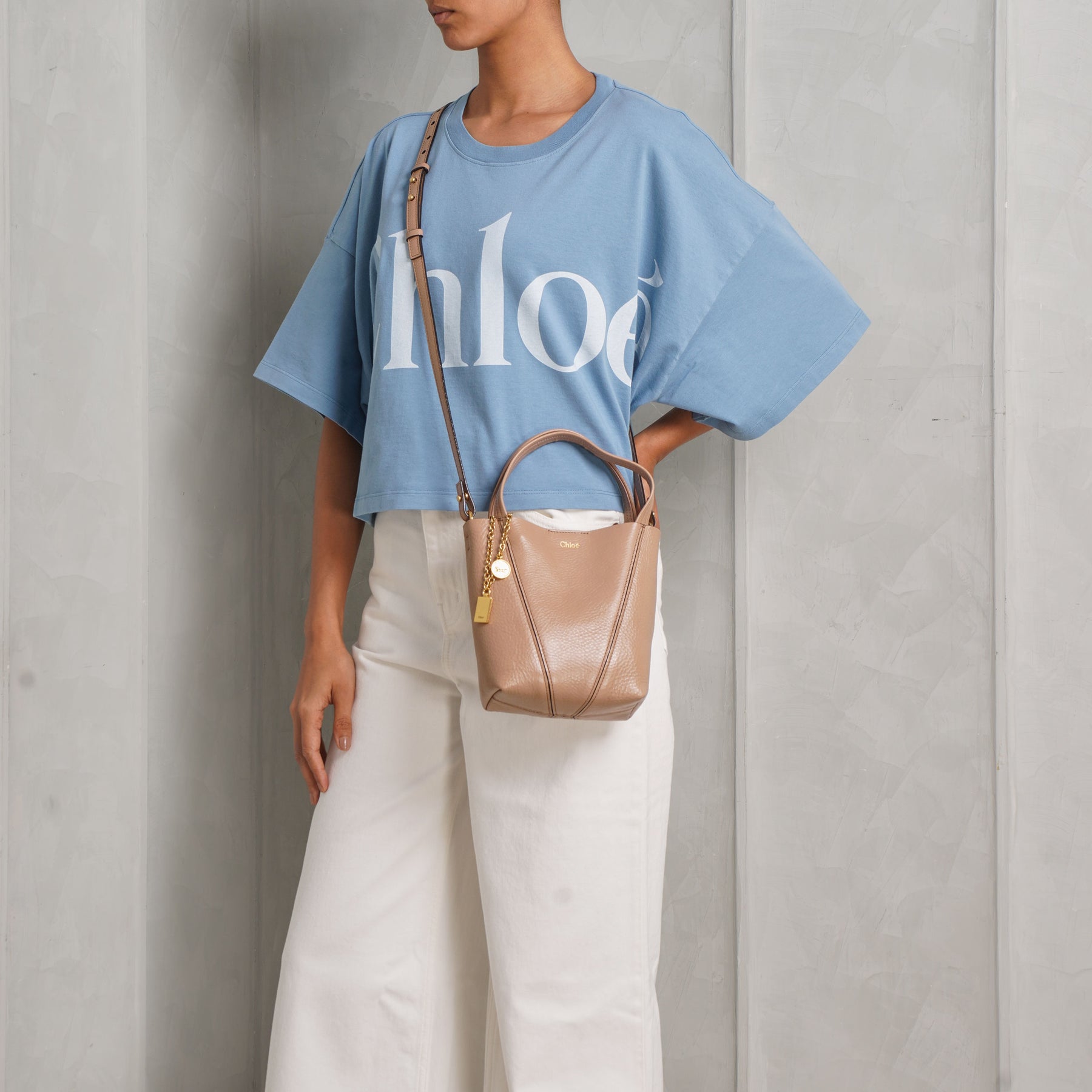The Small Chloé Spin Tote Bag in light pink brings a softer, more feminine edge to the structured silhouette. Crafted in shiny grained cowhide, its clean lines are balanced by a delicate chain with signature medallions, adding subtle movement. Compact yet versatile, it can be carried by hand, worn on the shoulder, or styled crossbody with the detachable strap - an easy piece for both day and evening.