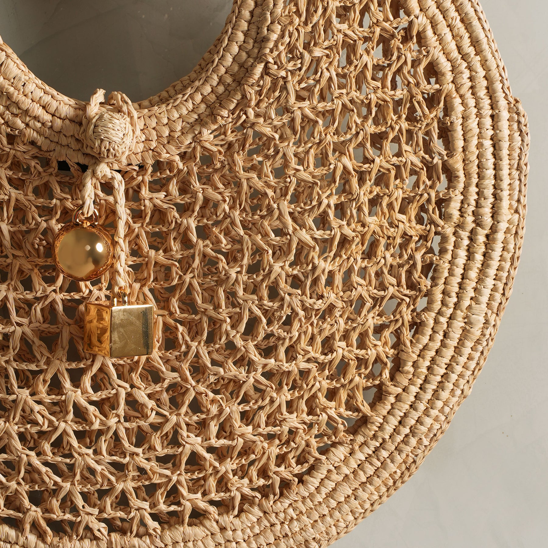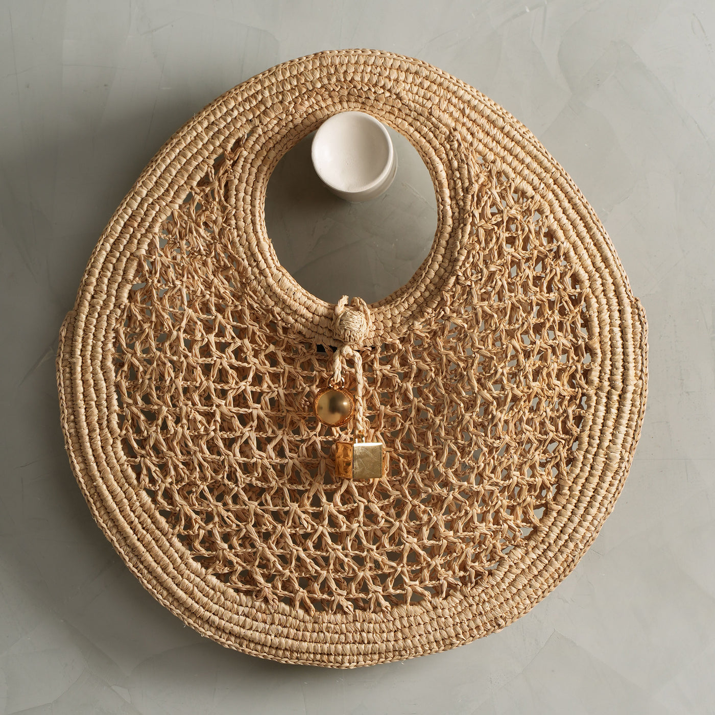 Introducing the Small Spiaggia Round Bag from Jacquemus - a small raffia circle bag. This flat woven basket bag features a knot closure and gold metal charms. With braided edges and a rustic beige hue, this bag is perfect for warm summer days along the coast.