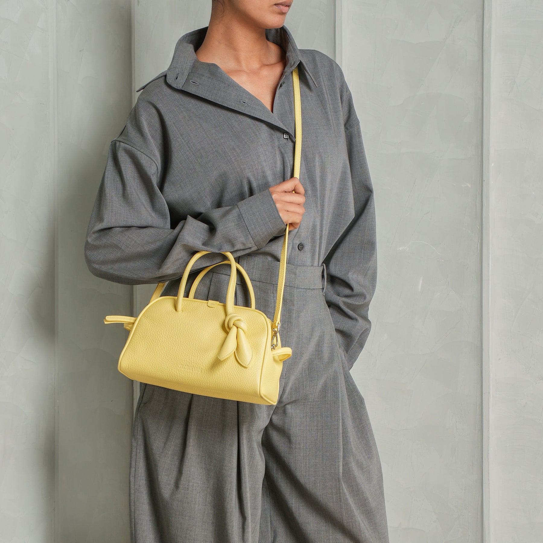 The Small Turismo Bag from Jacquemus is a timeless silhouette reimagined with modern softness. Its gently rounded shape is complemented by tubular leather handles featuring delicate knotted details - a subtle expression of craftsmanship. Designed for versatility, it includes a double-sided zipper, a removable cross-body strap, and an interior pocket for essentials. Finished with an embossed logo, it embodies understated polish and playful refinement.