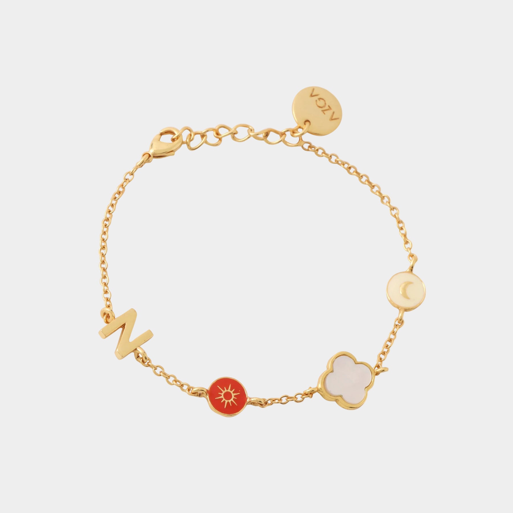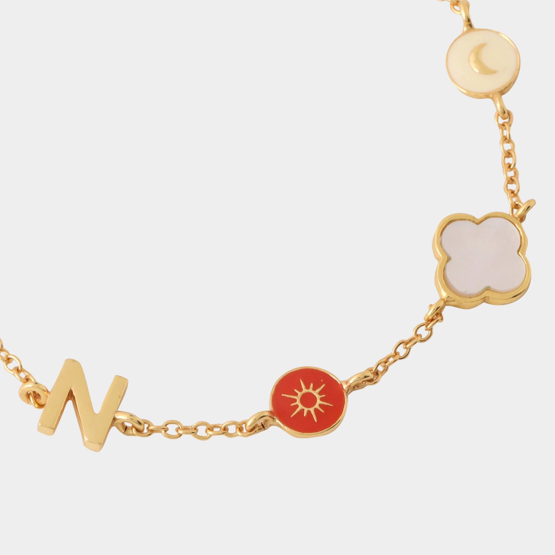 Handcrafted in brass, the Sun, Moon & Clover Initial Bracelet brings together a classic sun and moon charm with the luck of a mother-of-pearl clover — effortless, whimsical, and timeless.